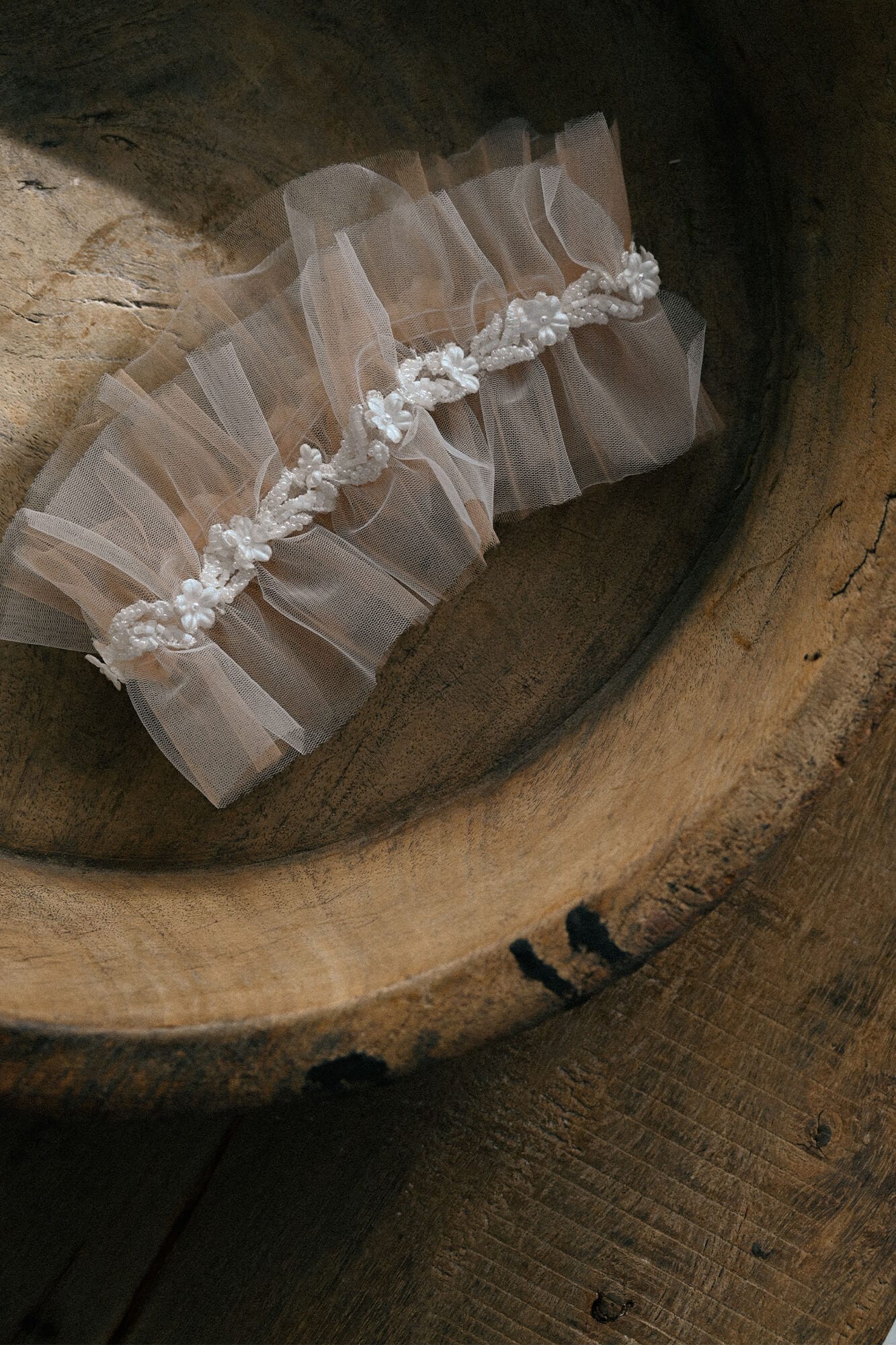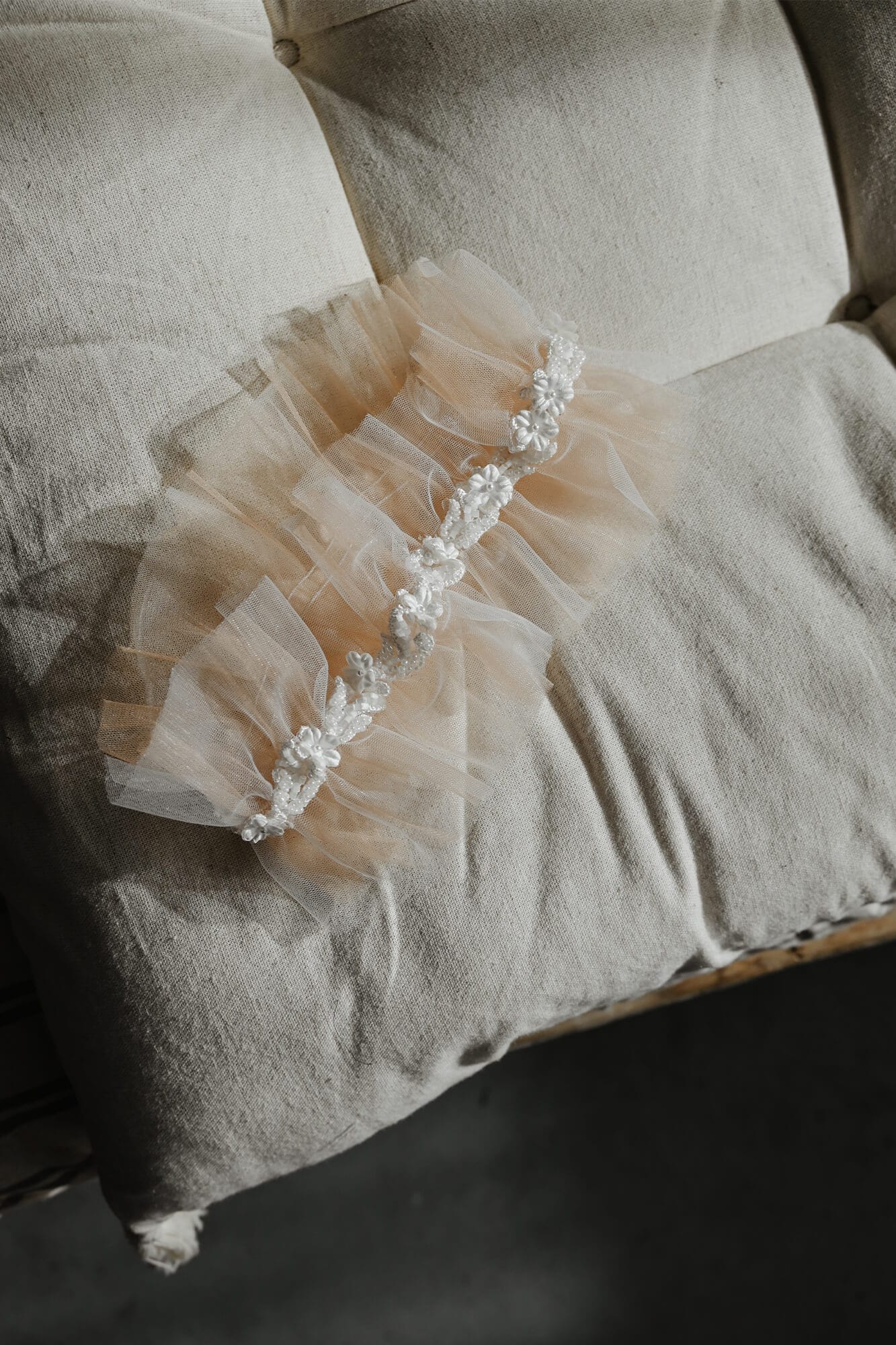 Tiulowa podwiązka ślubna z biżuteryjną taśmą i kwiatowym zdobieniem. Uszyta z dwóch warstw tiulu – ecru oraz cielistego – tworzy delikatny efekt mgiełki na skórze. Jest bardzo lekka i dobrze układa się na nodze. To subtelny, ale wyraźny detal stylizacji ślubnej. Może być też symboliczną pamiątką lub prezentem dla przyszłej Panny Młodej.