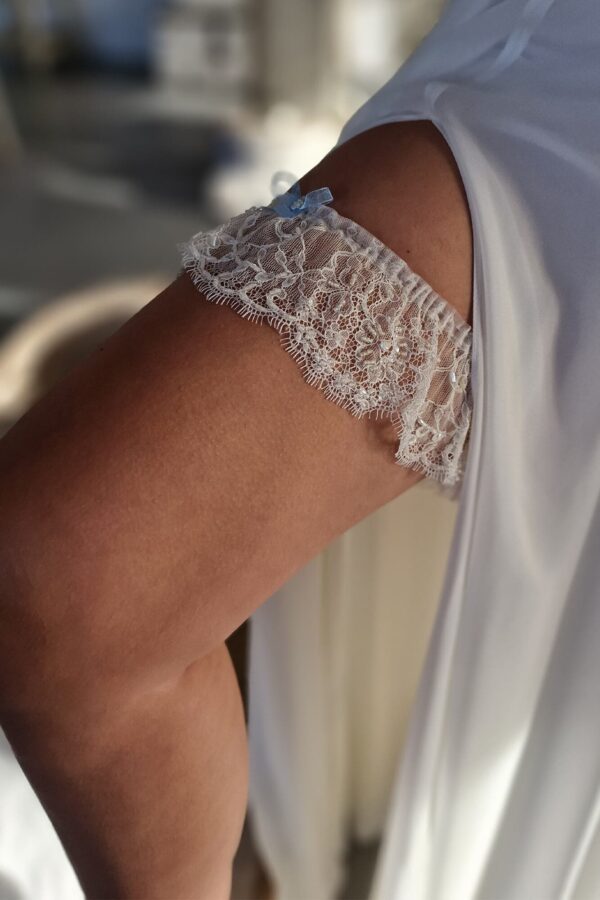 Koronkowa podwiązka ślubna z delikatnym, nieregularnym brzegiem i drobnymi „rzęskami”. Koronka jest wyszywana koralikami, co nadaje jej subtelny połysk. W górnej krawędzi wszyta jest cienka gumka, która utrzymuje podwiązkę na miejscu bez ucisku. Na środku znajduje się mała, błękitna kokardka. To detal, który możesz dopasować do charakteru swojej sukni ślubnej.