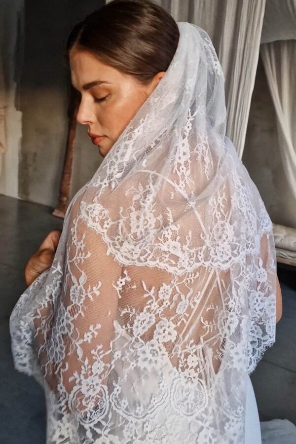 Biały, koronkowy welon ślubny w odcieniu śnieżnej bieli. Lekki, miękki i wygodny, nie obciąża fryzury i nie gniecie się w trakcie noszenia. Możesz swobodnie zarzucić go na twarz albo pozostawić opadający na plecach. Pasuje do śnieżnobiałej sukni i sprawdzi się zarówno w formalnej, jak i bardziej swobodnej oprawie ślubu.
