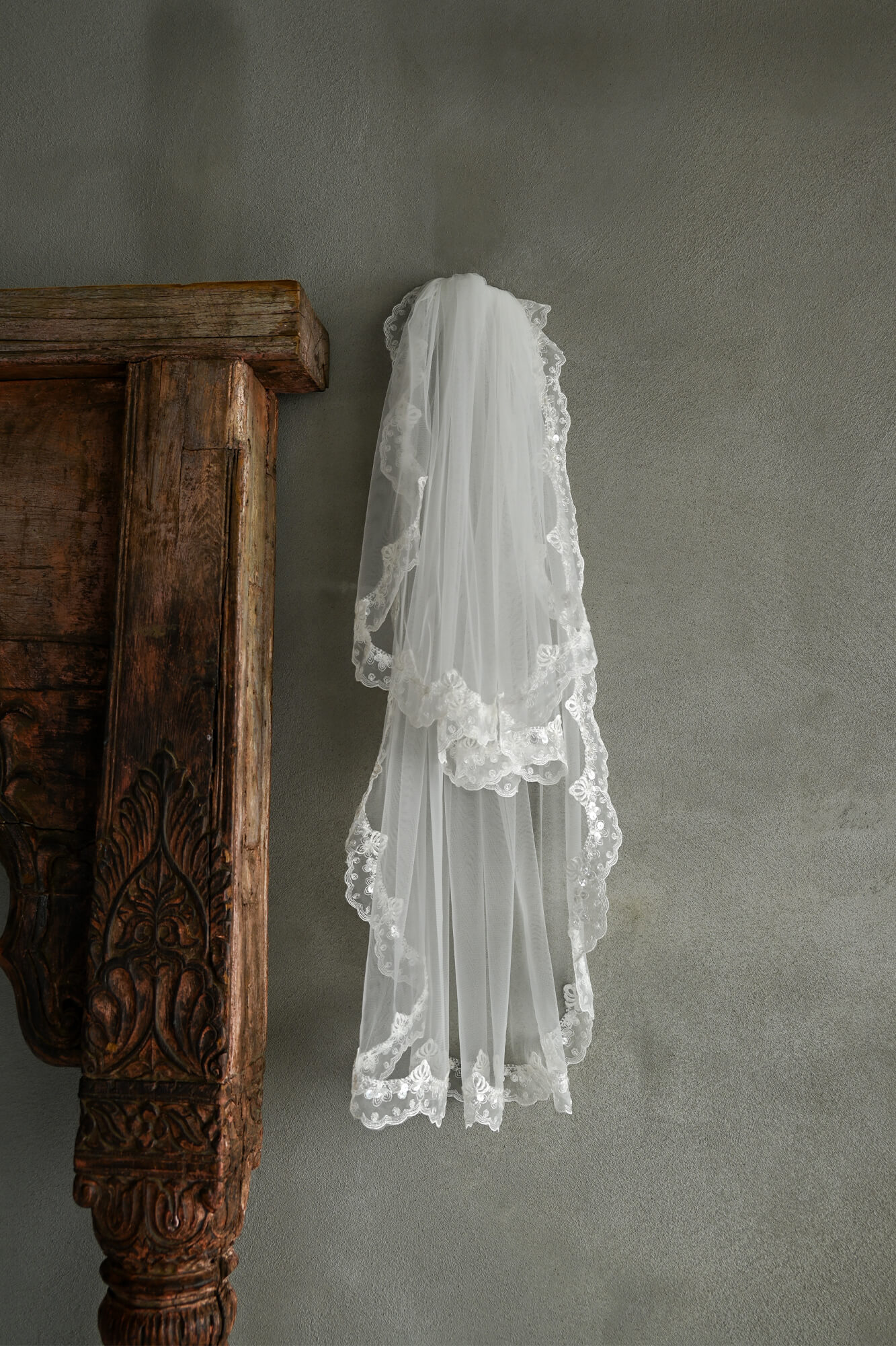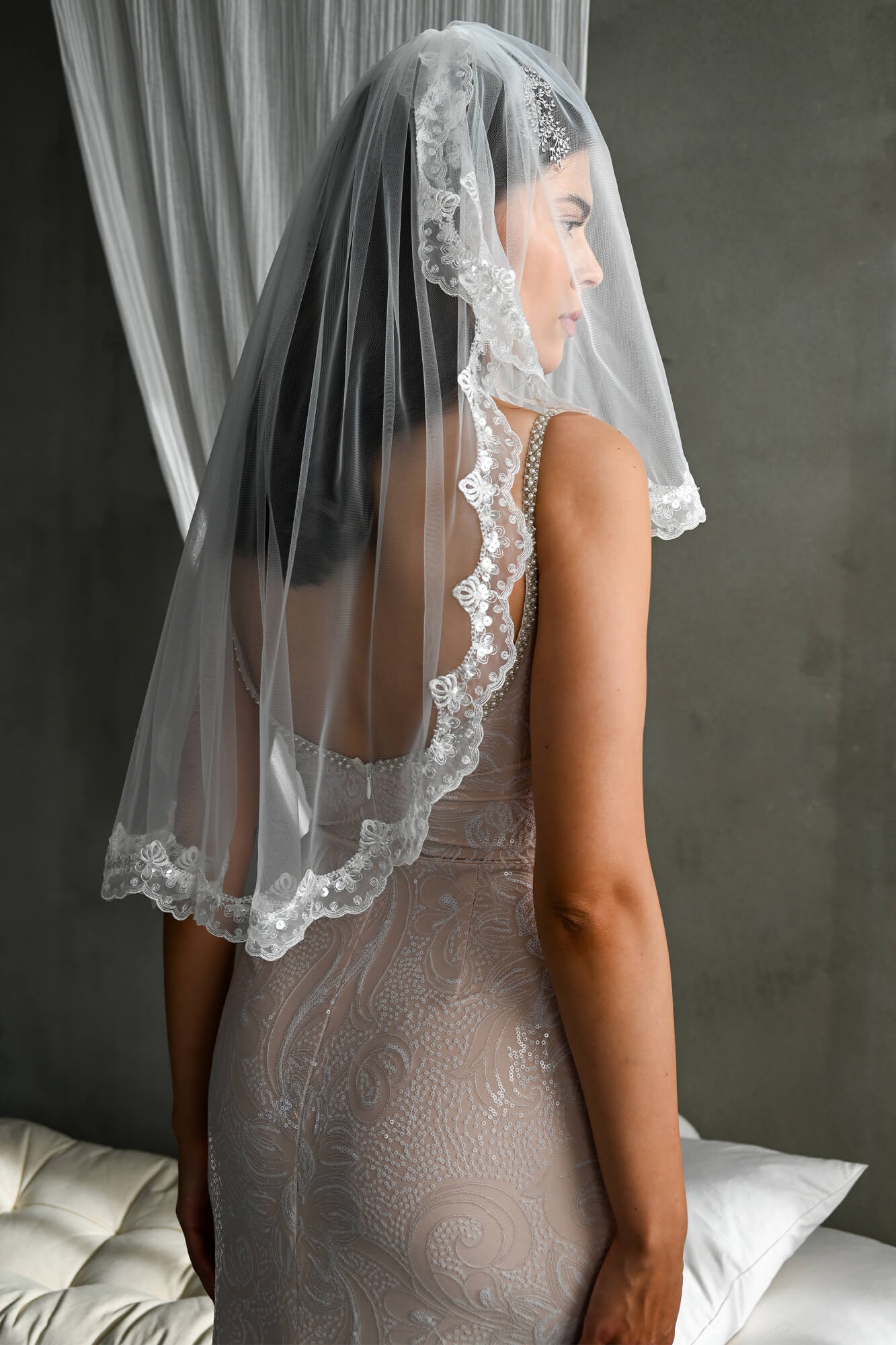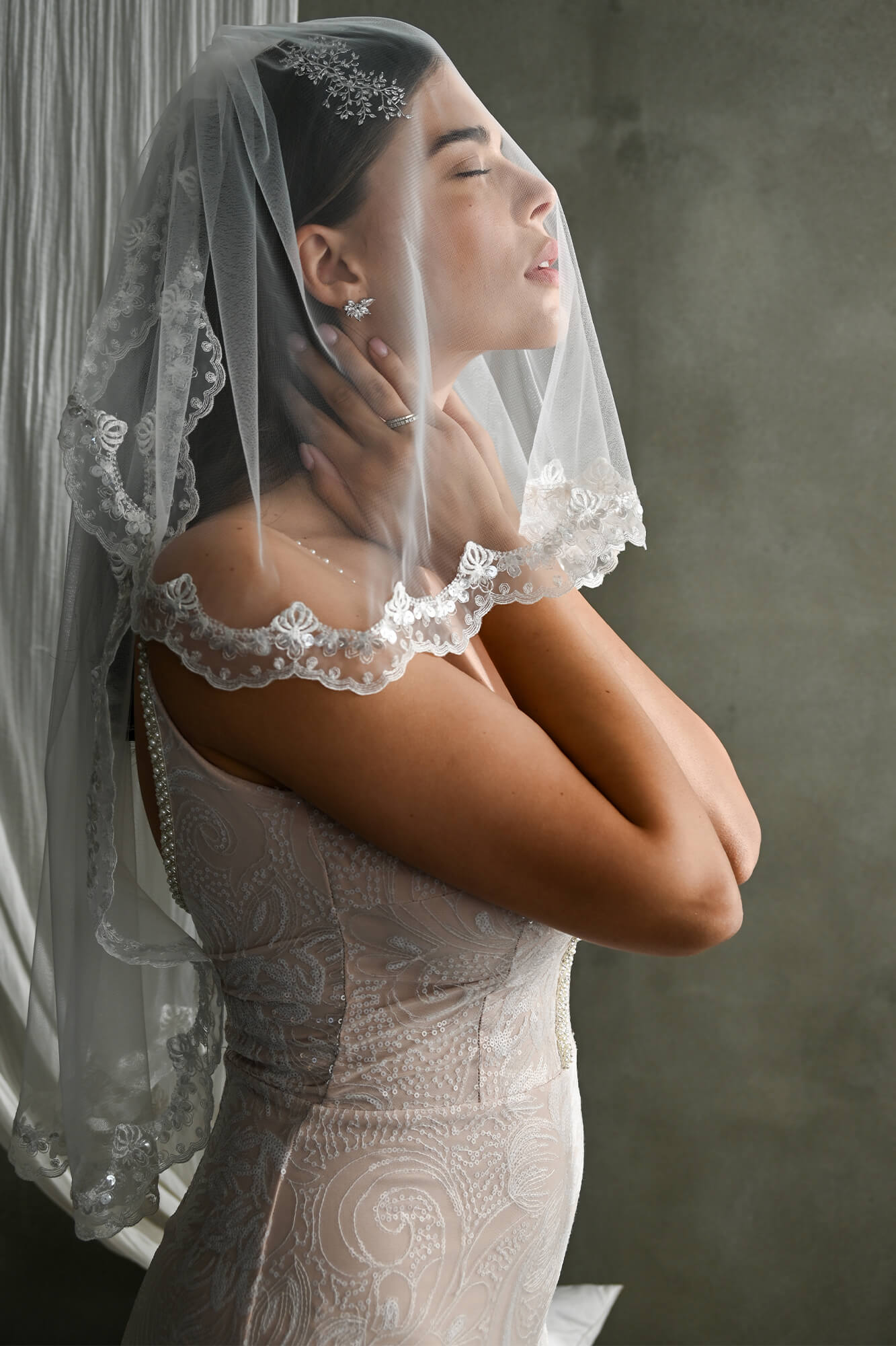 Krótki welon z tiulu, który możesz swobodnie zarzucić na twarz albo ułożyć z tyłu – wszystko zależy od tego, jak chcesz go nosić w dniu ślubu. Tkanina jest lekka, a wykończenie miękką taśmą sprawia, że welon nie obciąża fryzury i dobrze współpracuje zarówno z rozpuszczonymi włosami, jak i niskim kokiem.