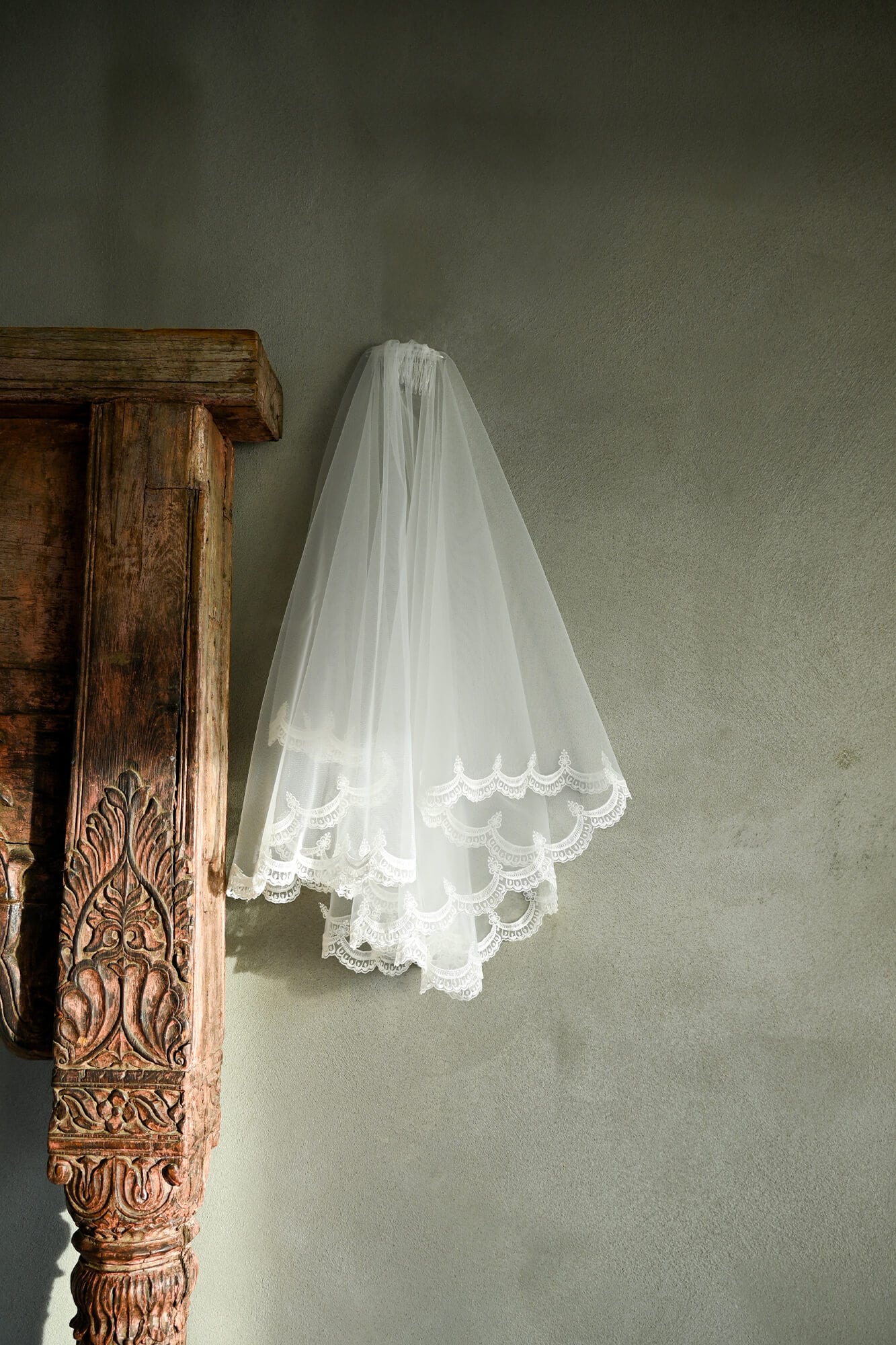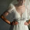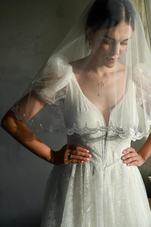 Ten welon ślubny z tiulu sięga do pasa i daje Ci dwie możliwości noszenia – możesz delikatnie przysłonić nim twarz albo pozostawić obie warstwy swobodnie opadające na plecach. W tej drugiej wersji koronkowa tasiemka biegnąca wzdłuż krawędzi układa się w nieregularny wzór, który jest dobrze widoczny na tle sukni.