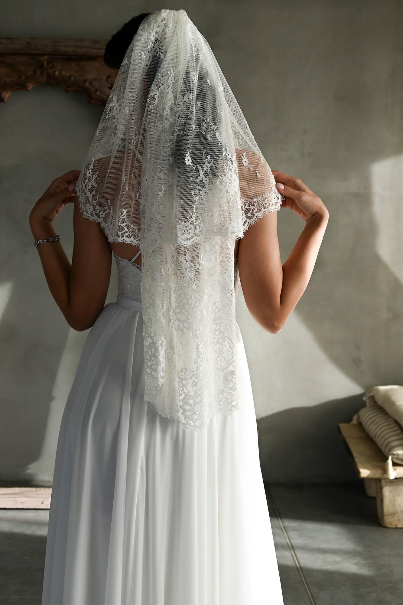 Ten welon ślubny został uszyty w całości z koronki w odcieniu ecru. Materiał jest dość gęsty wizualnie, ale jednocześnie lekki, dlatego dobrze układa się na włosach i nie daje uczucia ciężkości. To dodatek, który wyraźnie wpływa na odbiór całej stylizacji – nawet przy prostej sukni ślubnej.