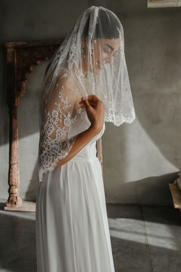 Koronkowy welon ślubny w odcieniu ecru, który wyraźnie zmienia charakter całej stylizacji. Uszyty w całości z dość gęstej, ale lekkiej koronki, dzięki czemu dobrze się układa i nie obciąża głowy. Ma zagęszczony wzór na dwóch krawędziach, co podkreśla jego warstwowość. Możesz zarzucić go na twarz albo swobodnie opuścić na plecy. Najlepiej łączy się z sukniami w ciepłych odcieniach bieli, ivory czy kości słoniowej.