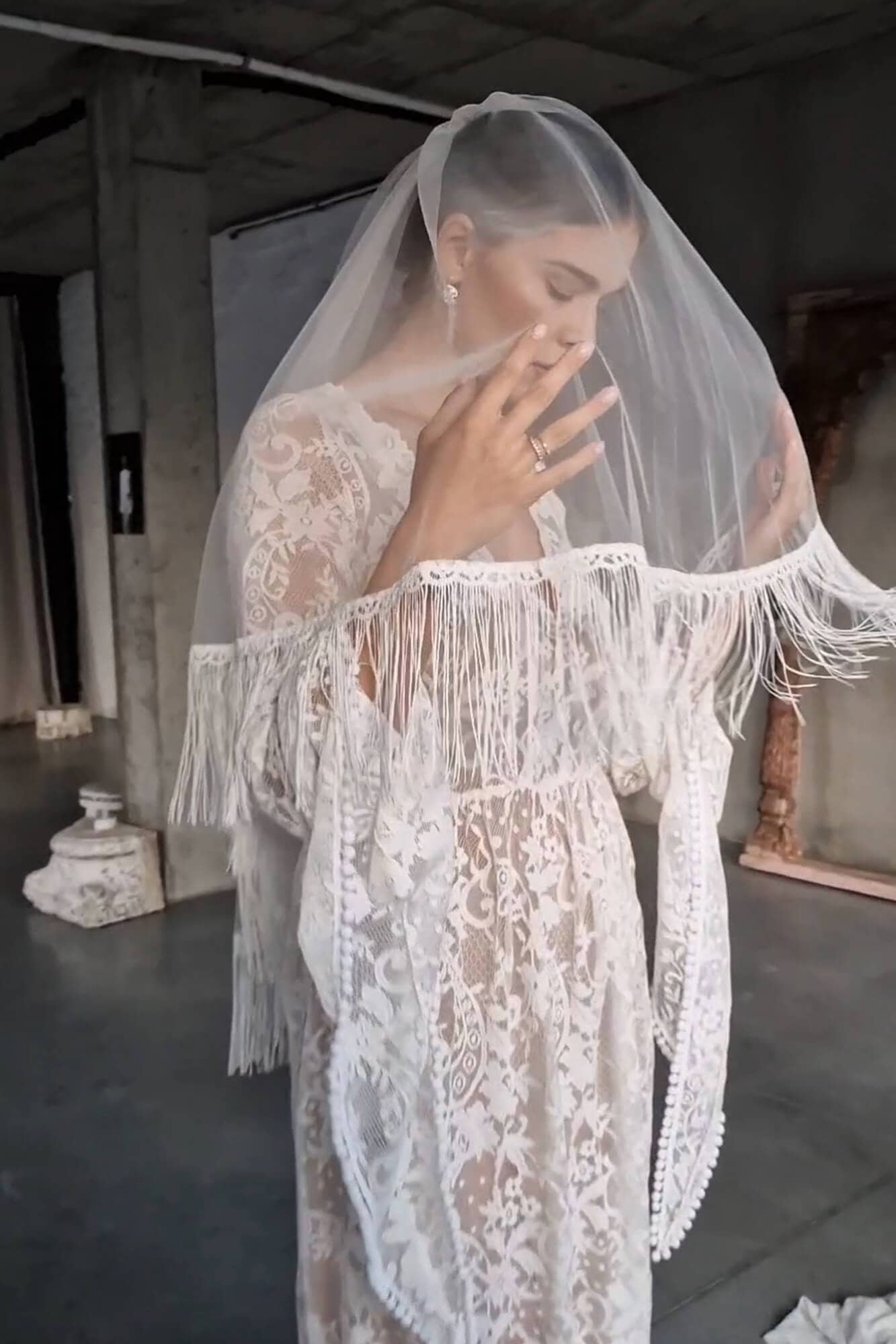 Jeśli bliski jest Ci styl boho i lubisz detale, które poruszają się razem z Tobą, ten welon z frędzlami będzie spójnym wyborem. Został wykonany z lekkiego tiulu, a jego krawędzie obszyto kremowymi frędzlami dookoła. Dzięki temu przy każdym kroku i obrocie materiał pracuje, tworząc dynamiczny efekt.