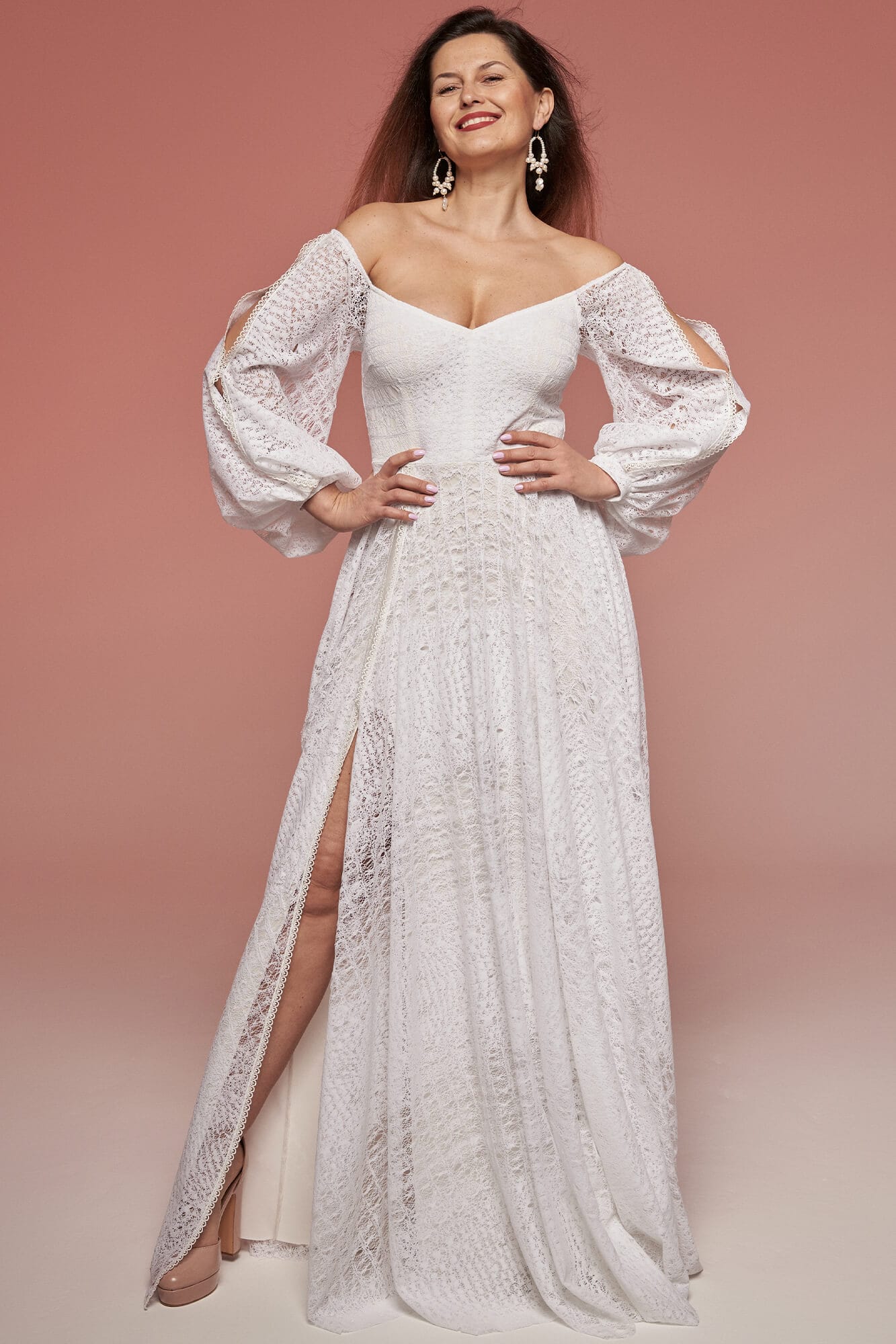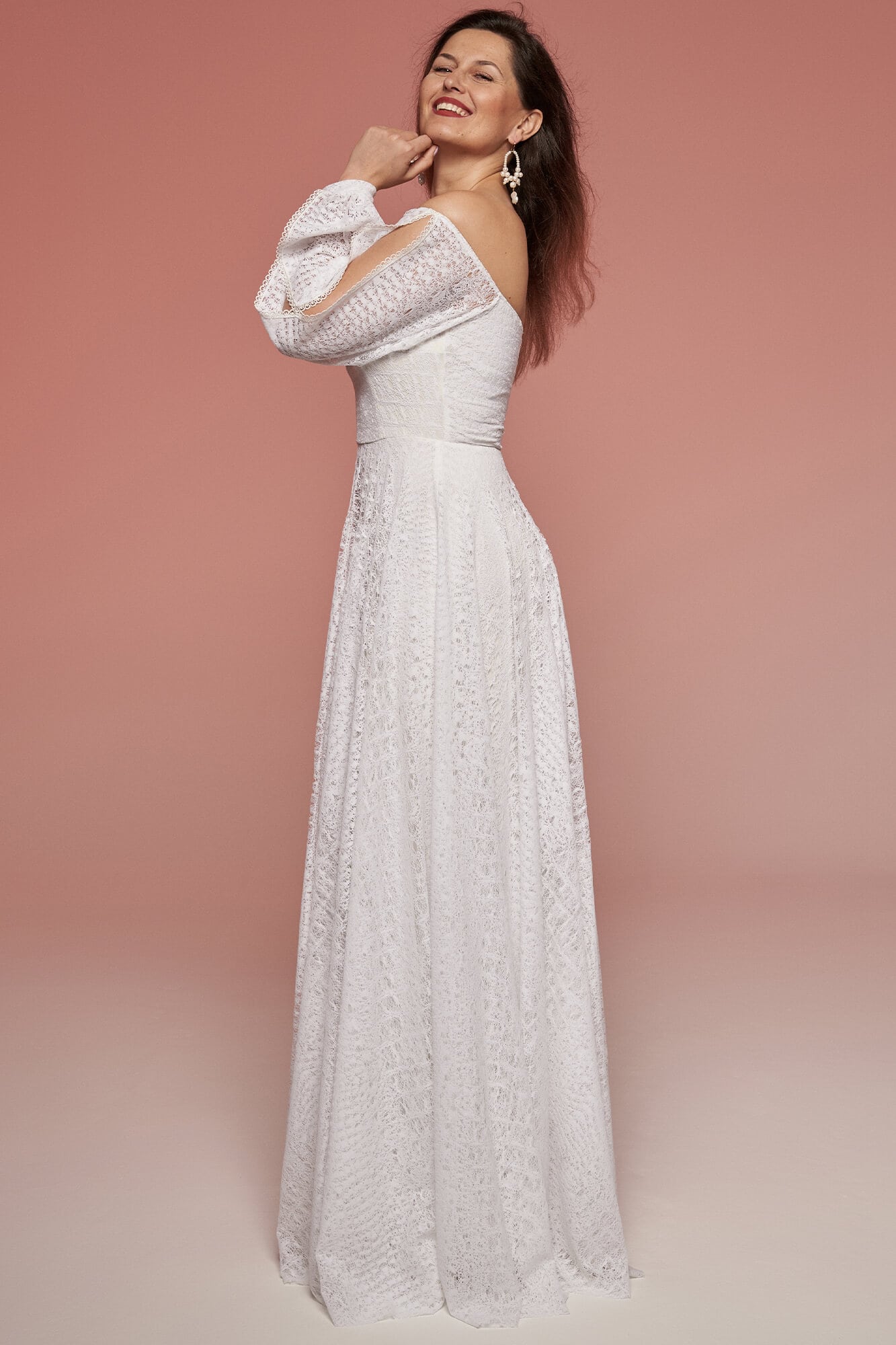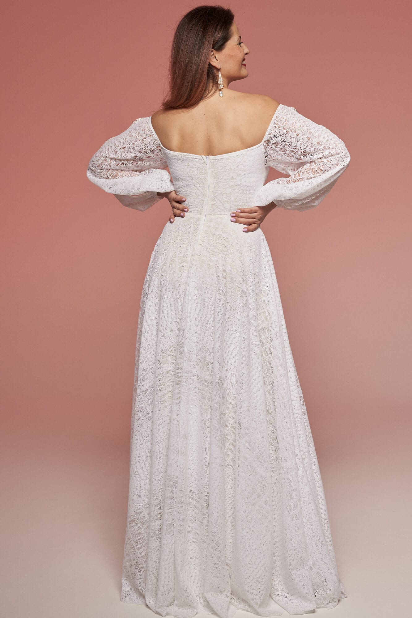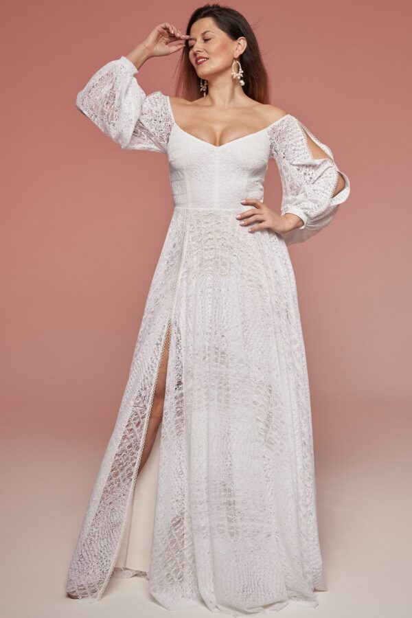 Off-shoulder lace wedding dress with long sleeves and subtle textured pattern. Elastic fabric and stable bodice construction ensure comfort, while customizable details allow adjustments after the wedding. Distinctive yet wearable.