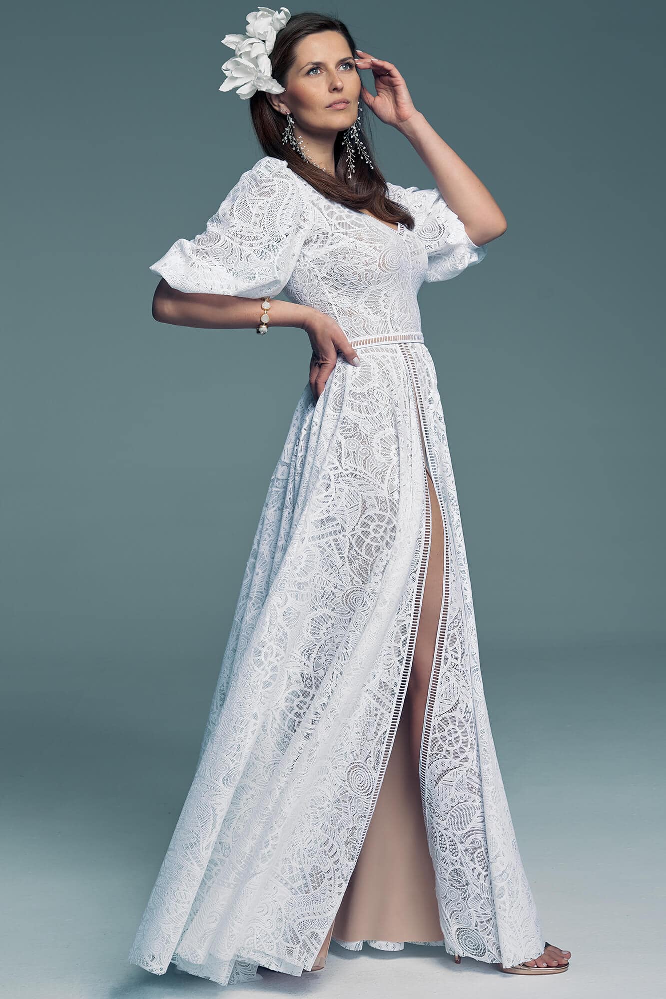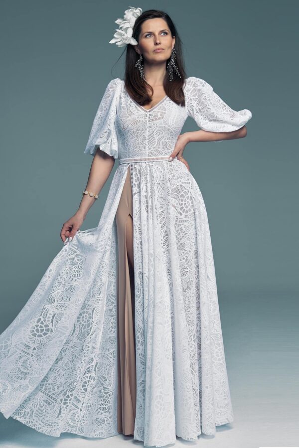Santorini 10 wedding dress is a white bridal gown suitable for a church or civil ceremony, including outdoor settings. It naturally aligns with rustic and boho aesthetics. The design with a puffed lace sleeve is intended for brides who appreciate expressive accents.