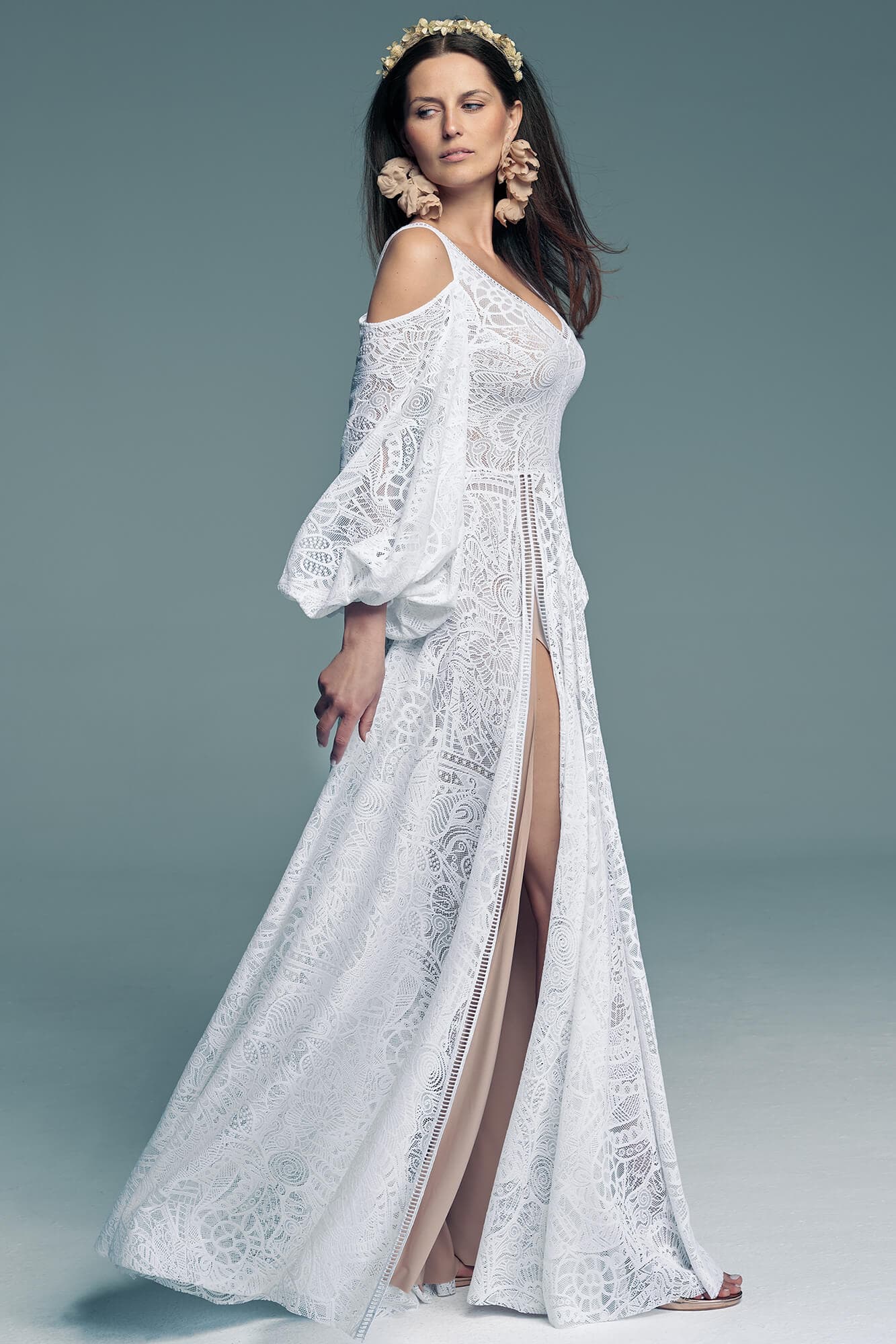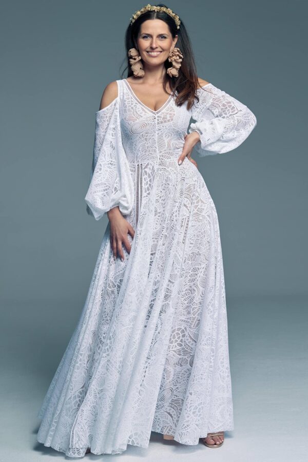 If you envision a bridal look with a subtle fairytale atmosphere, this gown offers a refined yet expressive presence. Wide, long, puffed sleeves give the design originality and attract attention while remaining a soft and balanced element of the overall styling.