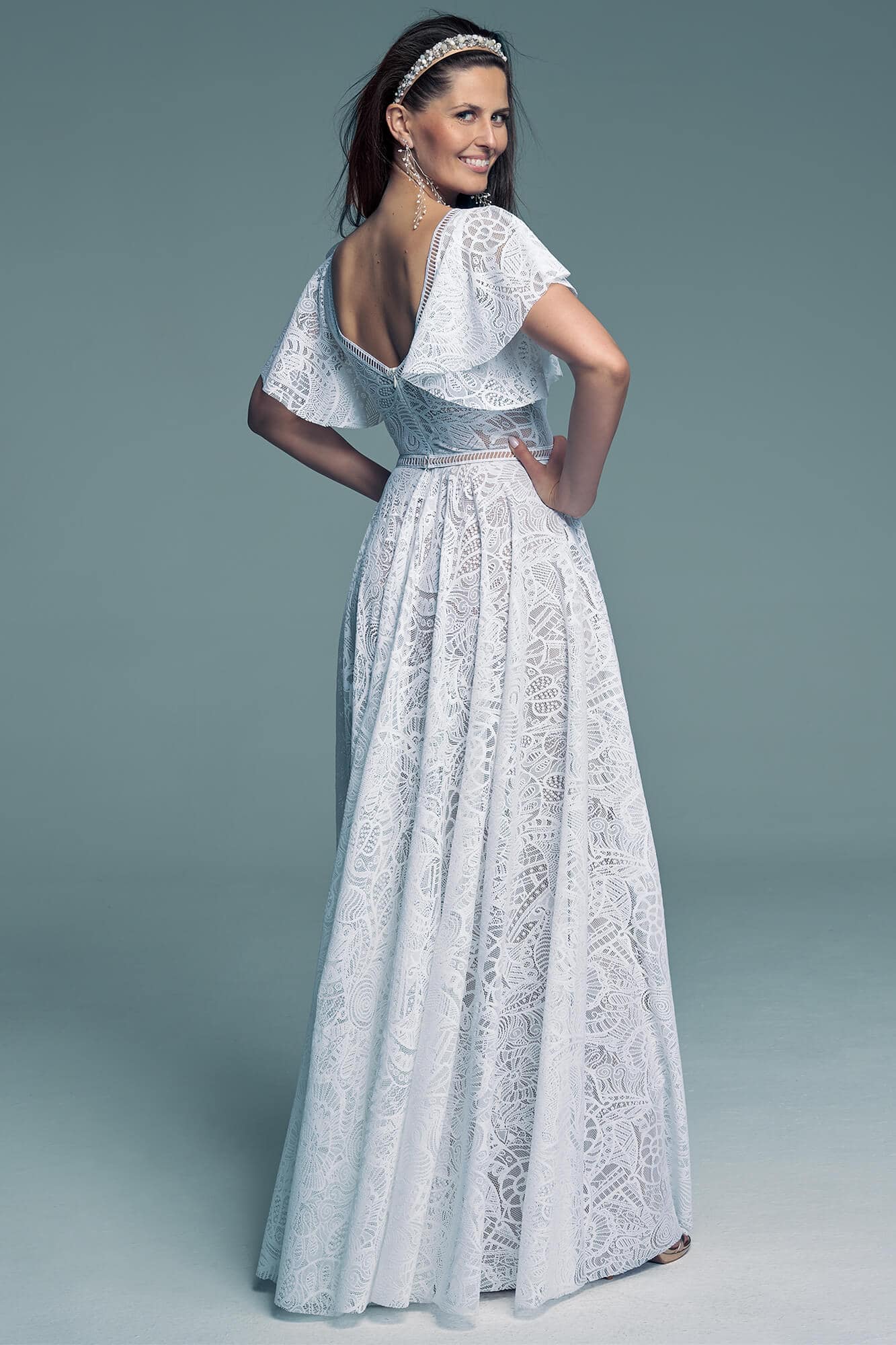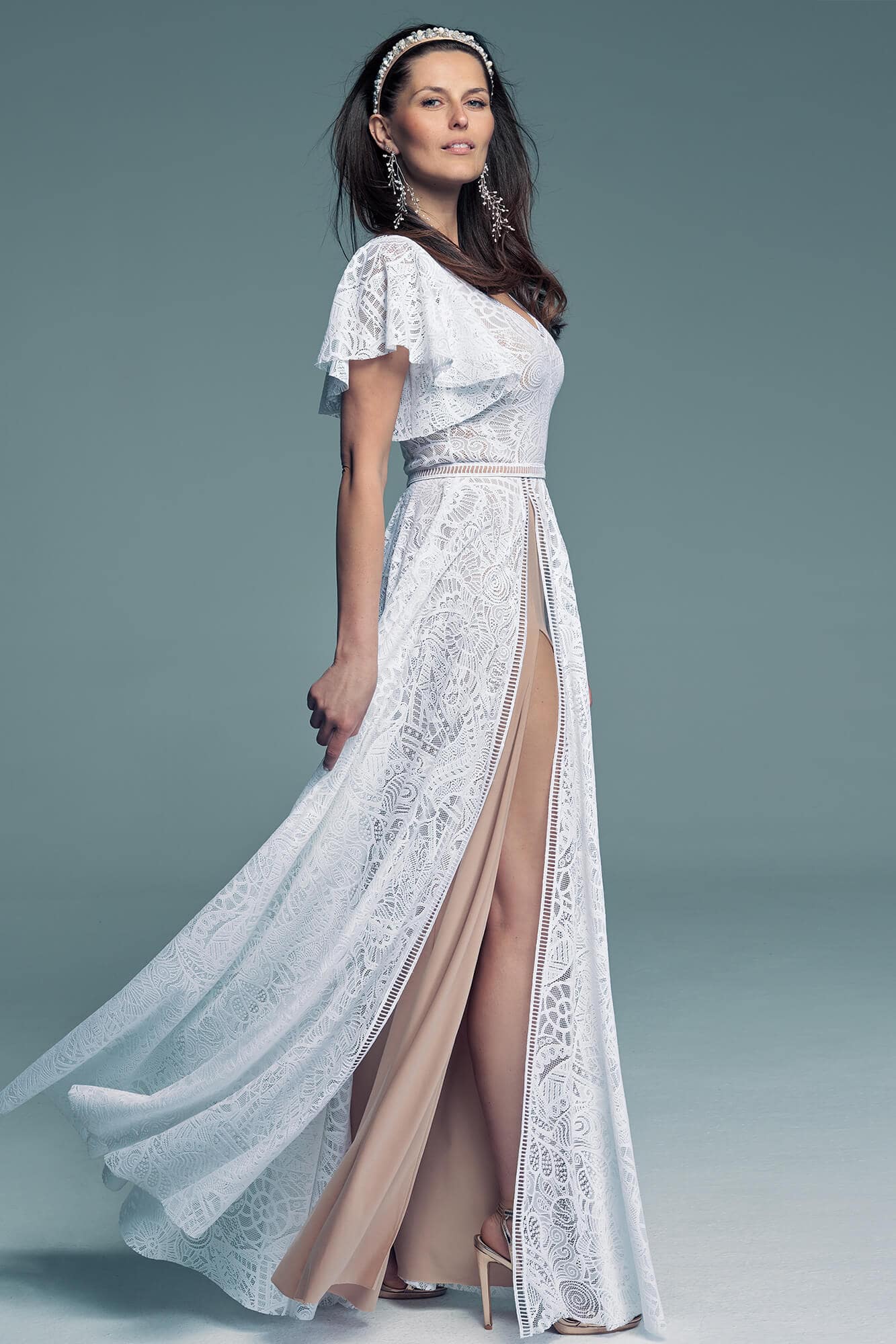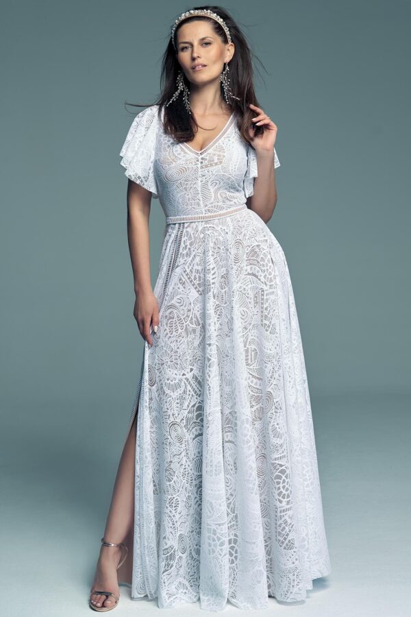 White lace placed over a nude lining creates a subtle “tattoo” effect, enhancing the natural beauty of the body without excess exposure. Soft flutter sleeves gently cover the upper arms, providing comfort and freedom of movement.