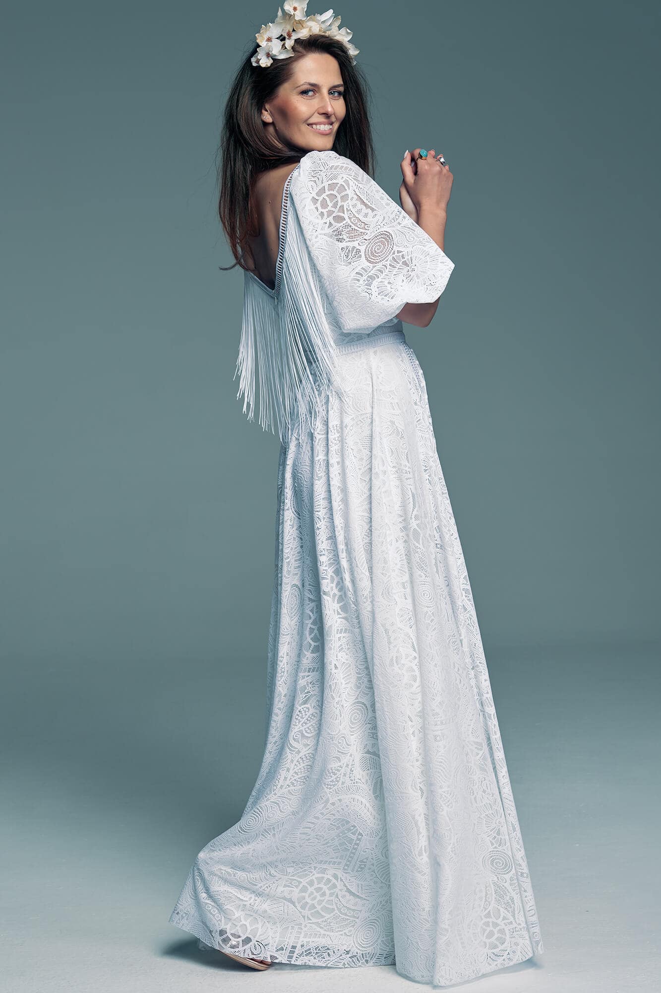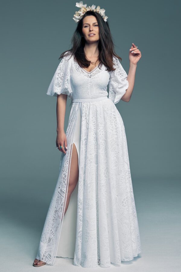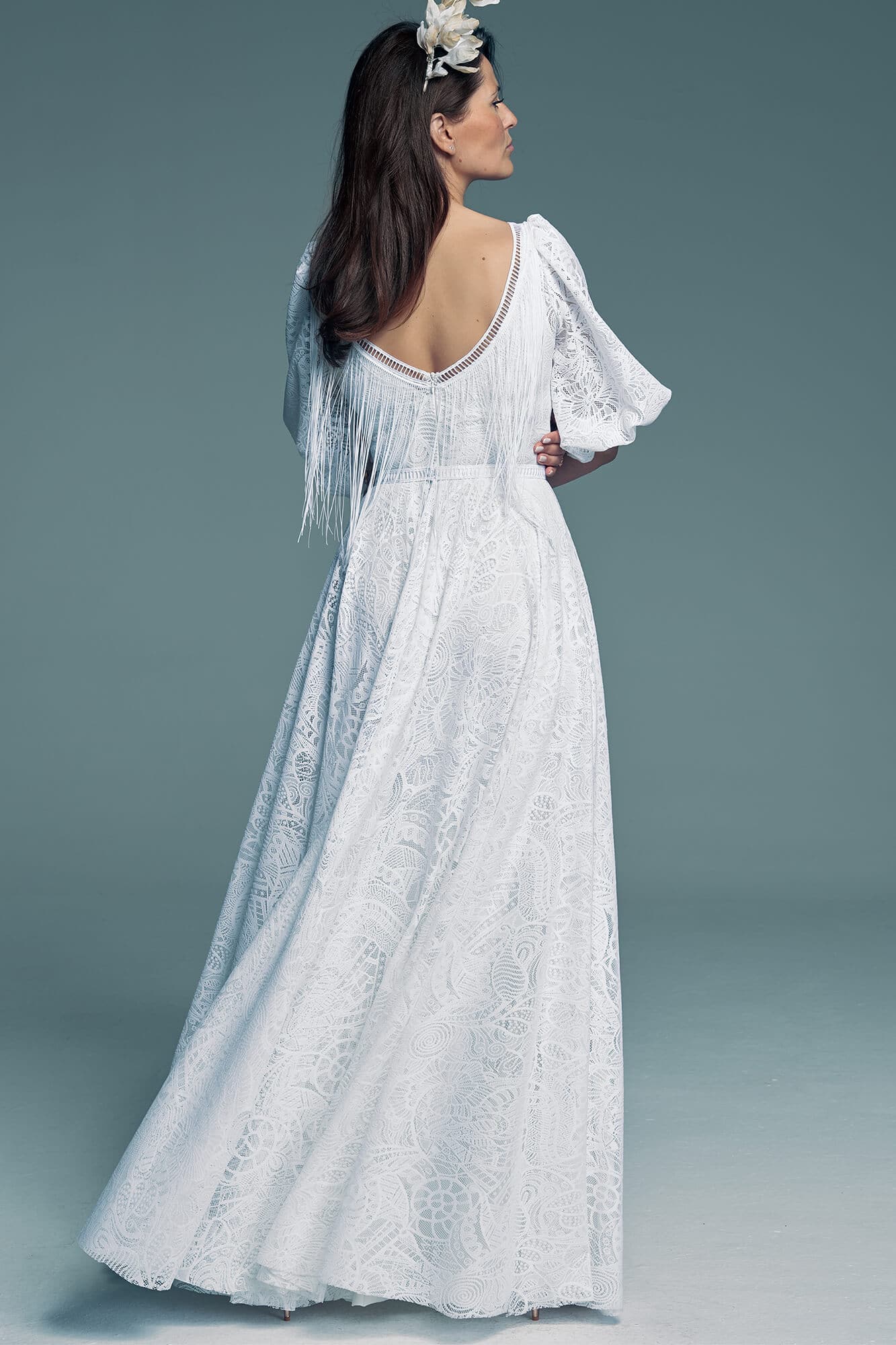 The back neckline is enriched with boho-style fringes that move beautifully while dancing and photograph with dynamic effect. The most distinctive element of the design is the wide, puffed sleeves that add lightness and an artistic accent to the silhouette. This type of sleeve works particularly well for a more delicate upper body, enhancing balanced proportions.