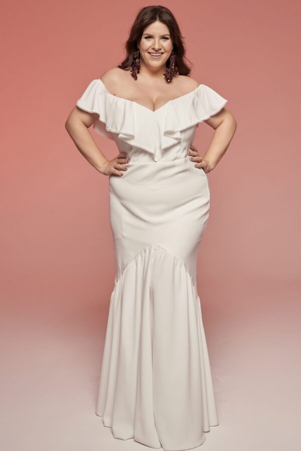 Gładka suknia ślubna plus size z hiszpańskim dekoltem i dopasowanym krojem rybki. Falbana ułożona w szpic podkreśla linię ramion i kieruje uwagę ku dekoltowi. Fason zaznacza biodra, a elastyczna krepa i odcięcie w kolanach pozwalają swobodnie się poruszać. Dół skrojony z koła lekko wiruje w tańcu. Model możesz zmienić zgodnie ze swoimi potrzebami – od dekoltu po kształt spódnicy.