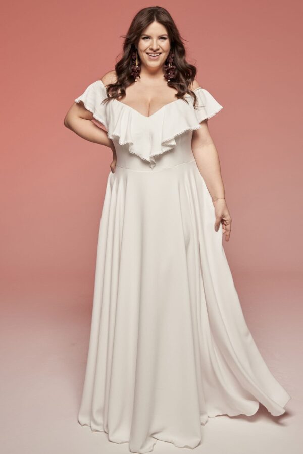 Suknia ślubna plus size z krepy i hiszpańskim dekoltem, który subtelnie odsłania ramiona. Falbana miękko je okala, dając możliwość ich zakrycia w dowolnym momencie. Elastyczne wykończenie sprawia, że możesz swobodnie podnosić ręce. Szeroka spódnica równoważy górę i podkreśla talię. Fason możesz zmienić według własnych potrzeb.