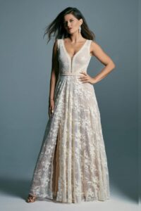 Dekolt w kształcie litery V, zwężający się cienką linią ku pasowi, optycznie wydłuża sylwetkę i podkreśla jej naturalne proporcje. Szeroka taśma oddzielająca górę od spódnicy akcentuje talię, a ukośne linie prowadzone od talii do biustu modelują figurę, tworząc harmonijną linię klepsydry. Spódnica w kształcie litery A miękko otula biodra i równoważy proporcje, zapewniając swobodę ruchu. Długie rozcięcie na nodze dodaje kreacji lekkości i wyrazistego charakteru, zachowując przy tym komfort noszenia. Koronka o bogatym wzorze nałożona na cielistą podszewkę subtelnie podkreśla strukturę tkaniny i nadaje sukni oryginalnego wyrazu. Model pięknie współgra z różnymi typami uroczystości i pozwala w pełni celebrować kobiece kształty.