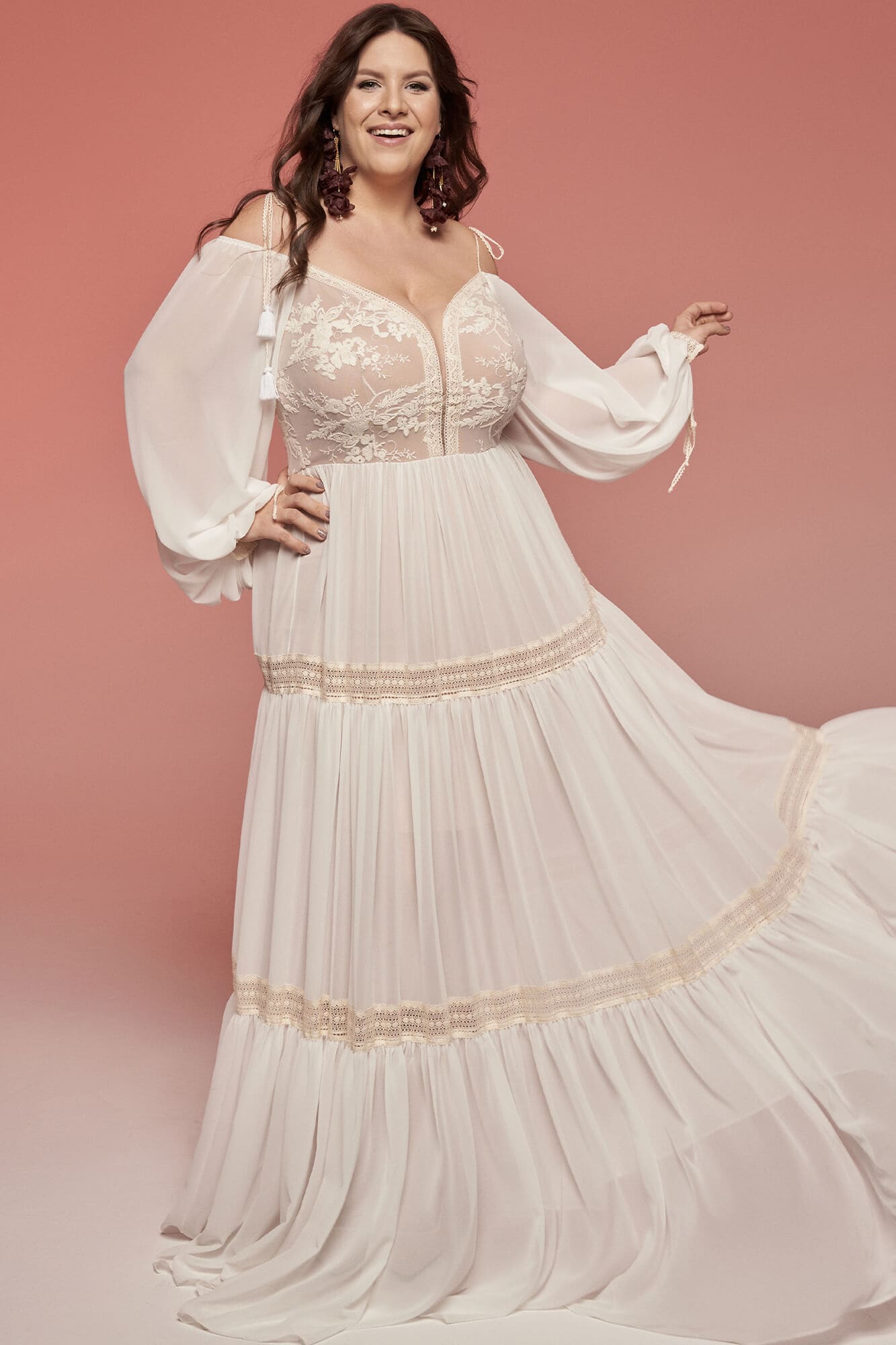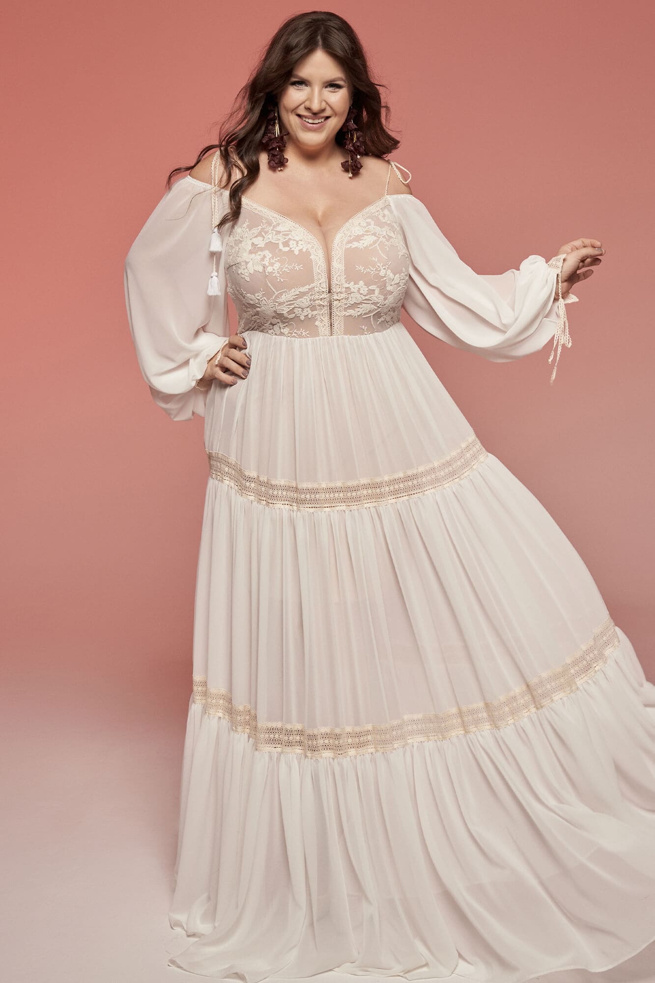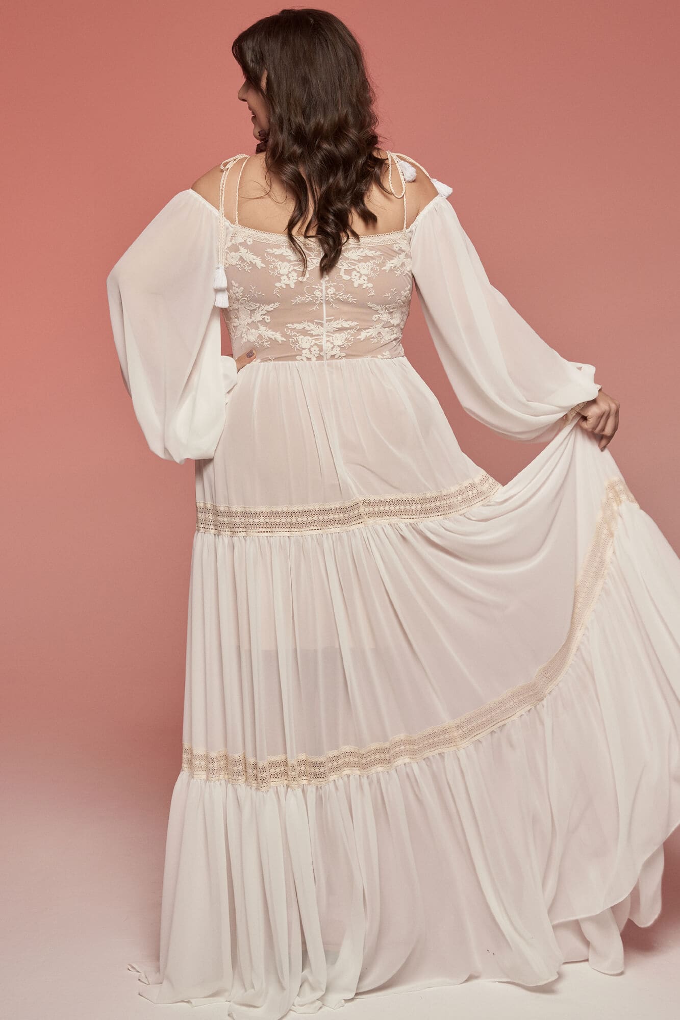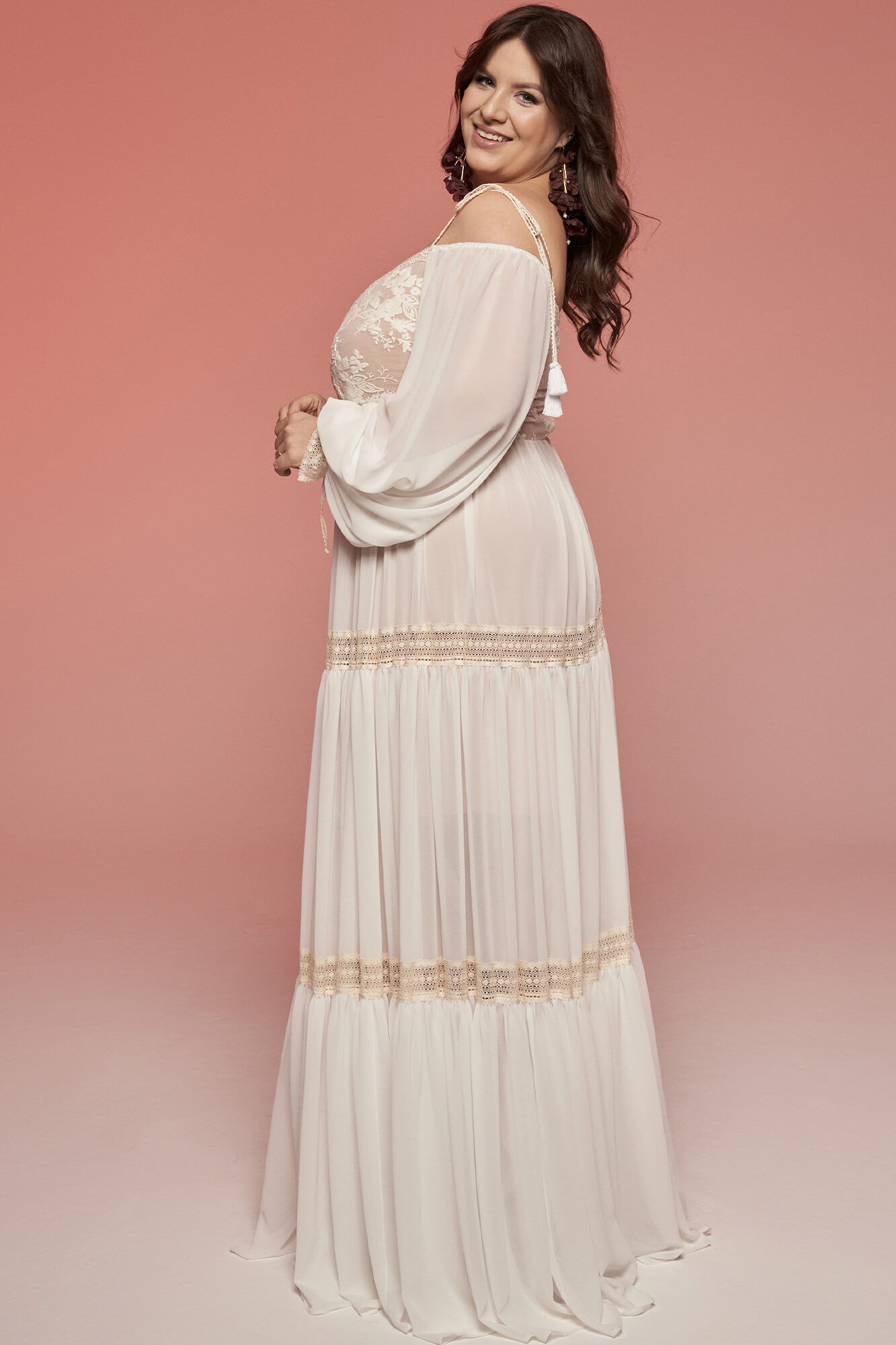 Trzypiętrowa suknia ślubna plus size w stylu boho, łącząca szyfon w odcieniu ivory z bawełnianą koronką w ciepłym beżu. Ma głęboki dekolt do pasa, cienkie ramiączka i długie, luźne rękawy z szyfonu. Spódnica z trzech warstw pięknie pracuje w ruchu i daje lekkość sylwetce. Tył zaprojektowano tak, by zasłaniał linię biustonosza. Model szyty na miarę – z możliwością zmiany dekoltu, rękawów i formy spódnicy.