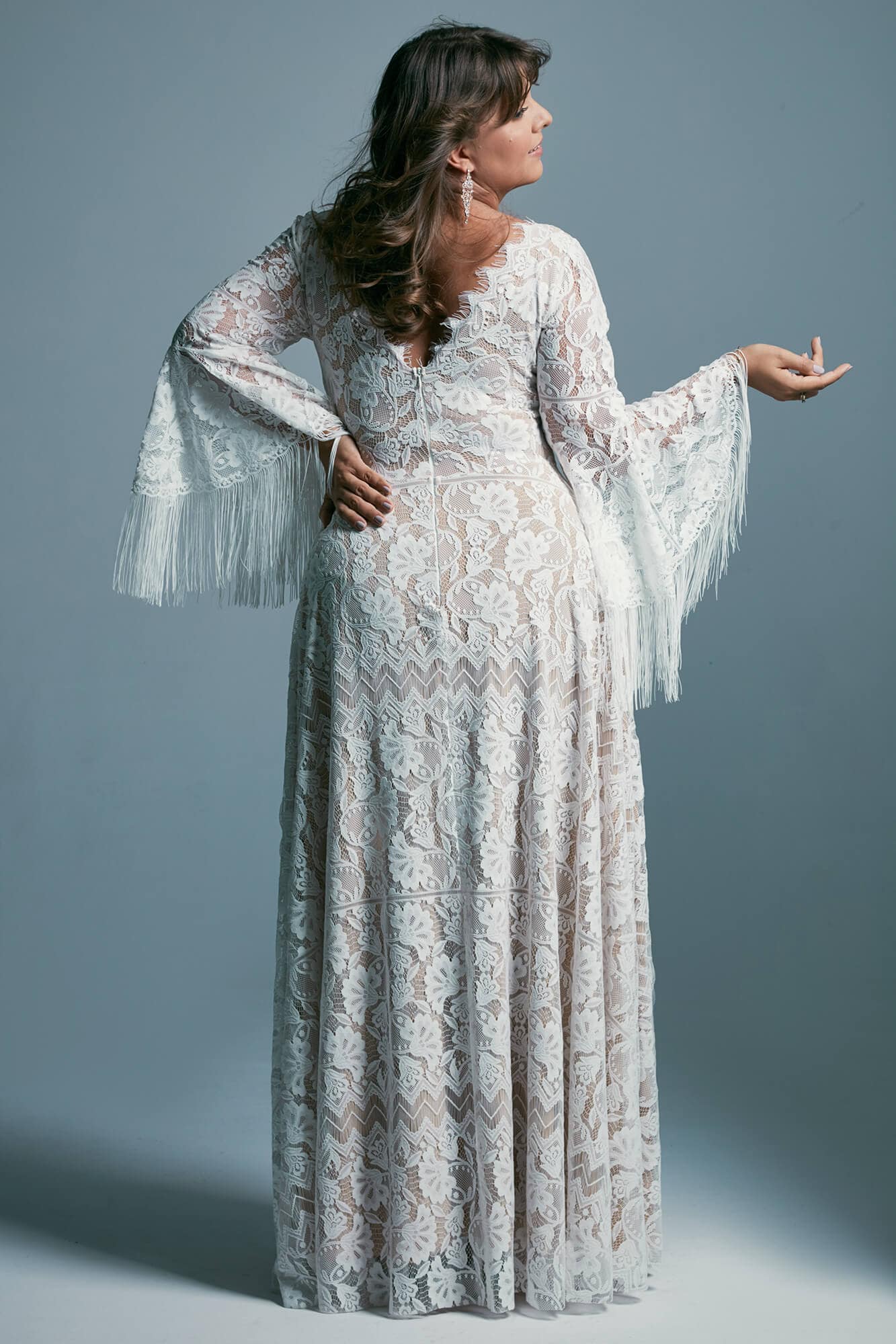 Dekolt V wykończony ząbkowaną koronką podkreśla biust i linię pleców. Rozszerzane ku dołowi rękawy z frędzlami w stylu boho wprowadzają lekkość i równoważą proporcje ramion. Spódnica bez marszczenia w talii porządkuje linię bioder i optycznie je wysmukla.
