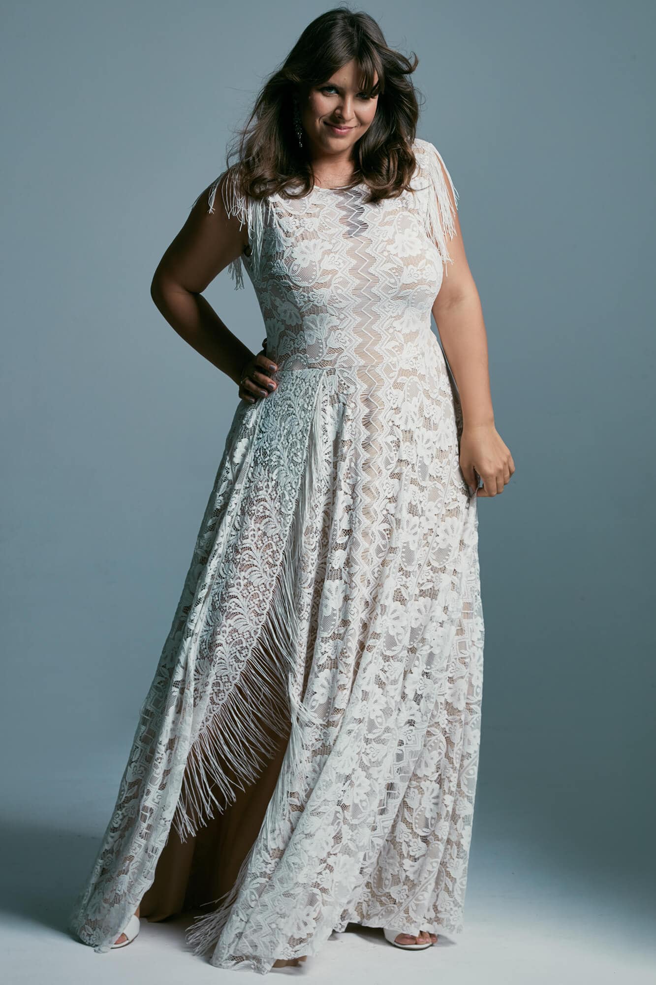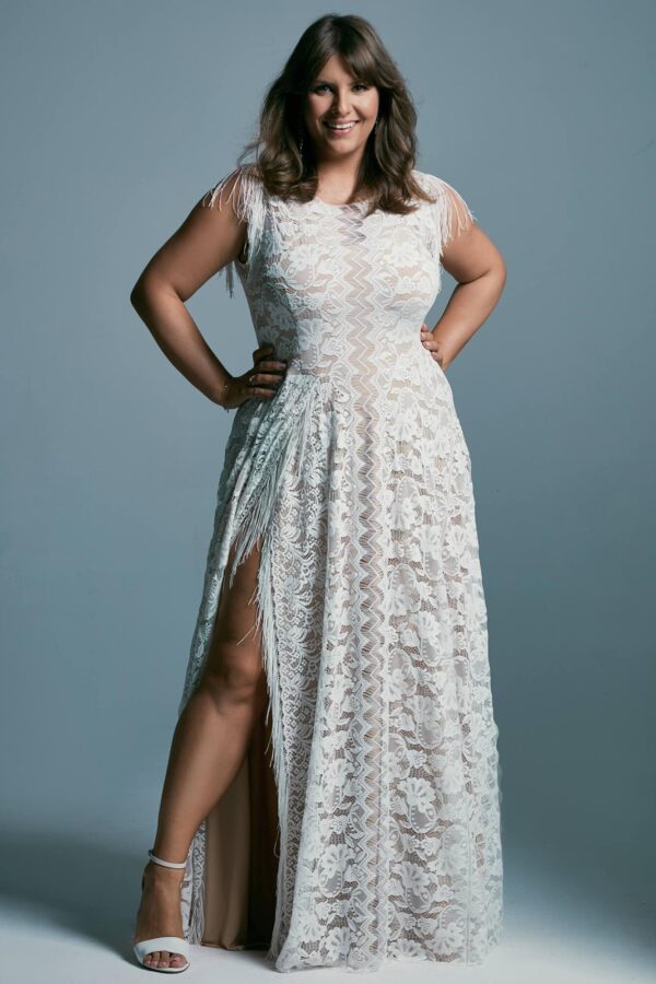 Suknia ślubna plus size z dekoltem pod szyję to wyrazisty projekt w stylu boho. Fason modeluje proporcje sylwetki i podkreśla jej naturalne kształty. Koronka o bogatym, oryginalnym wzorze na tle cielistej podszewki daje efekt subtelnego tatuażu na skórze.