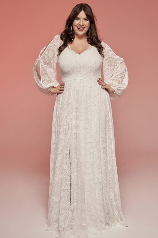 Spódnica składa się z wąskiej, trapezowej podszewki z rozcięciem oraz warstwy koronki skrojonej z pełnego koła. Dzięki temu suknia ślubna plus size dobrze pracuje w tańcu i daje swobodę kroków. Bufiaste rękawy z rozcięciami na całej długości są lekko zbluzowane i połączone w środkowej części, co pozwala osłonić ręce bez uczucia ciężkości.