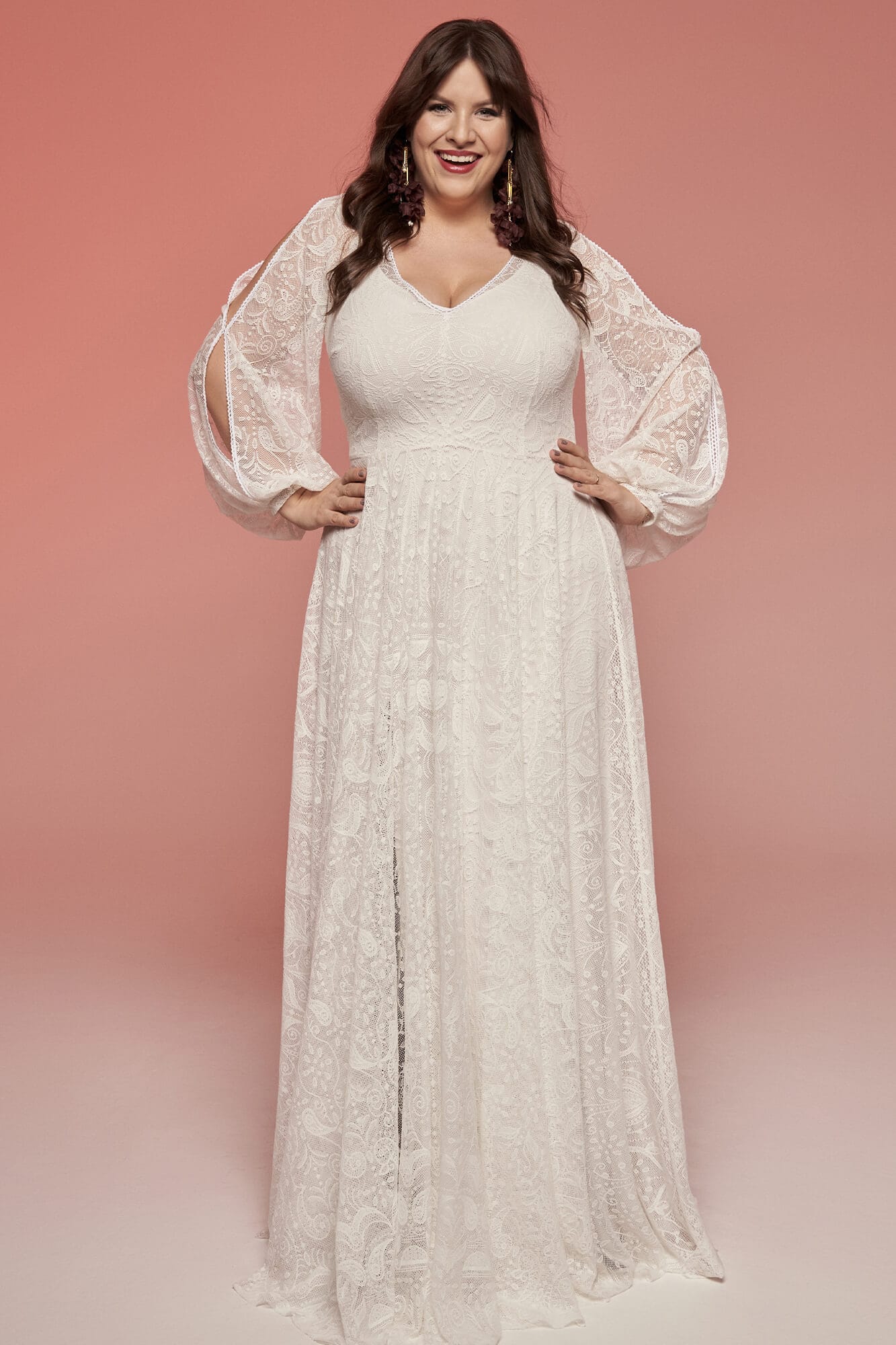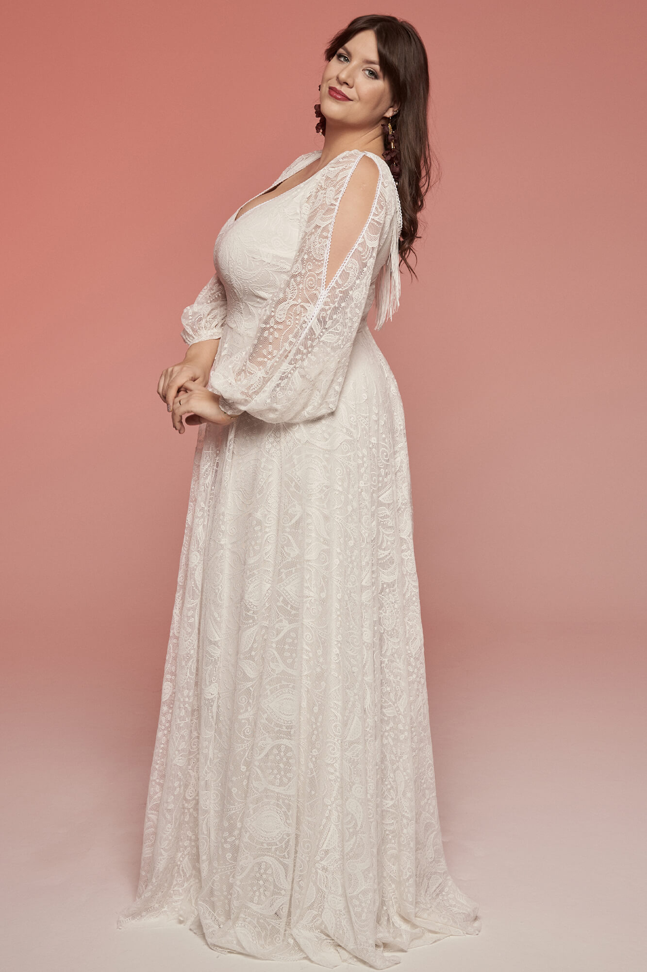 Lekka suknia ślubna plus size w stylu boho, uszyta z elastycznej koronki w kolorze ivory. Geometryczny wzór i ząbkowana tasiemka przy dekolcie V nadają jej wyrazisty charakter. Spódnica z koła z rozporkiem zapewnia swobodę ruchu, a bufiaste rękawy z rozcięciami delikatnie osłaniają ramiona. Na plecach pojawiają się subtelne frędzle. Model można modyfikować podczas szycia na miarę.