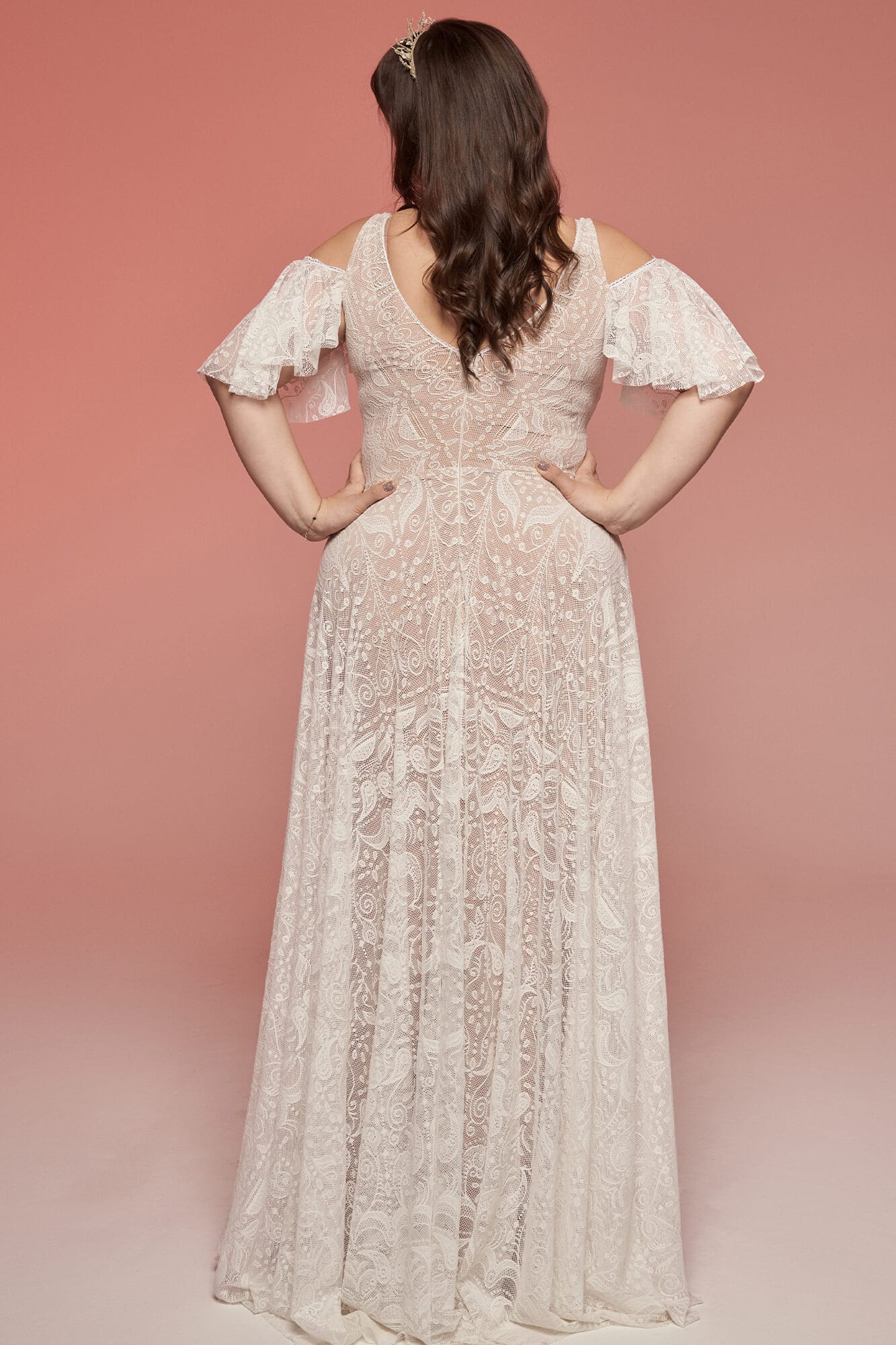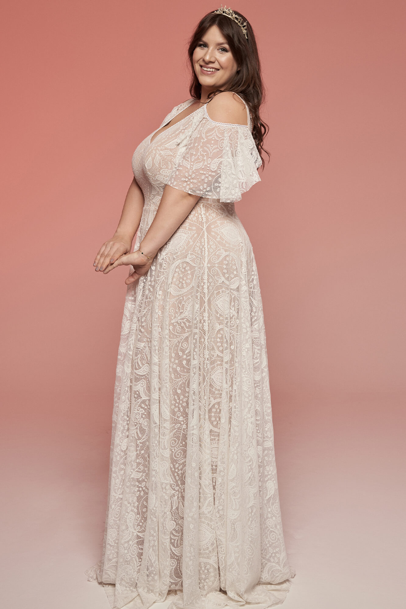 Ta suknia ślubna plus size powstała z połączenia miękkiej, elastycznej podszewki w kolorze cielistym oraz lekkiej koronki w odcieniu ivory. Dzięki temu materiał układa się swobodnie i dopasowuje do sylwetki, nie ograniczając ruchów. Całość sprawia wrażenie bardzo lekkiej – jakby koronka była nałożona bezpośrednio na skórę.