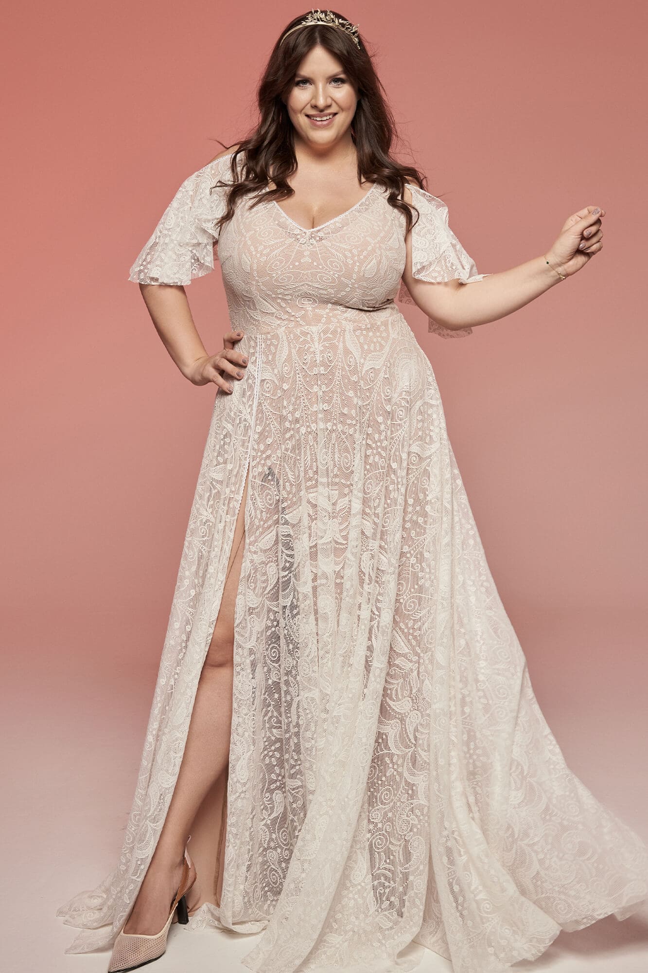 To koronkowa suknia ślubna z lekkim rękawem dla kobiet, które cenią swobodę i chcą czuć się naturalnie, niezależnie od rozmiaru.