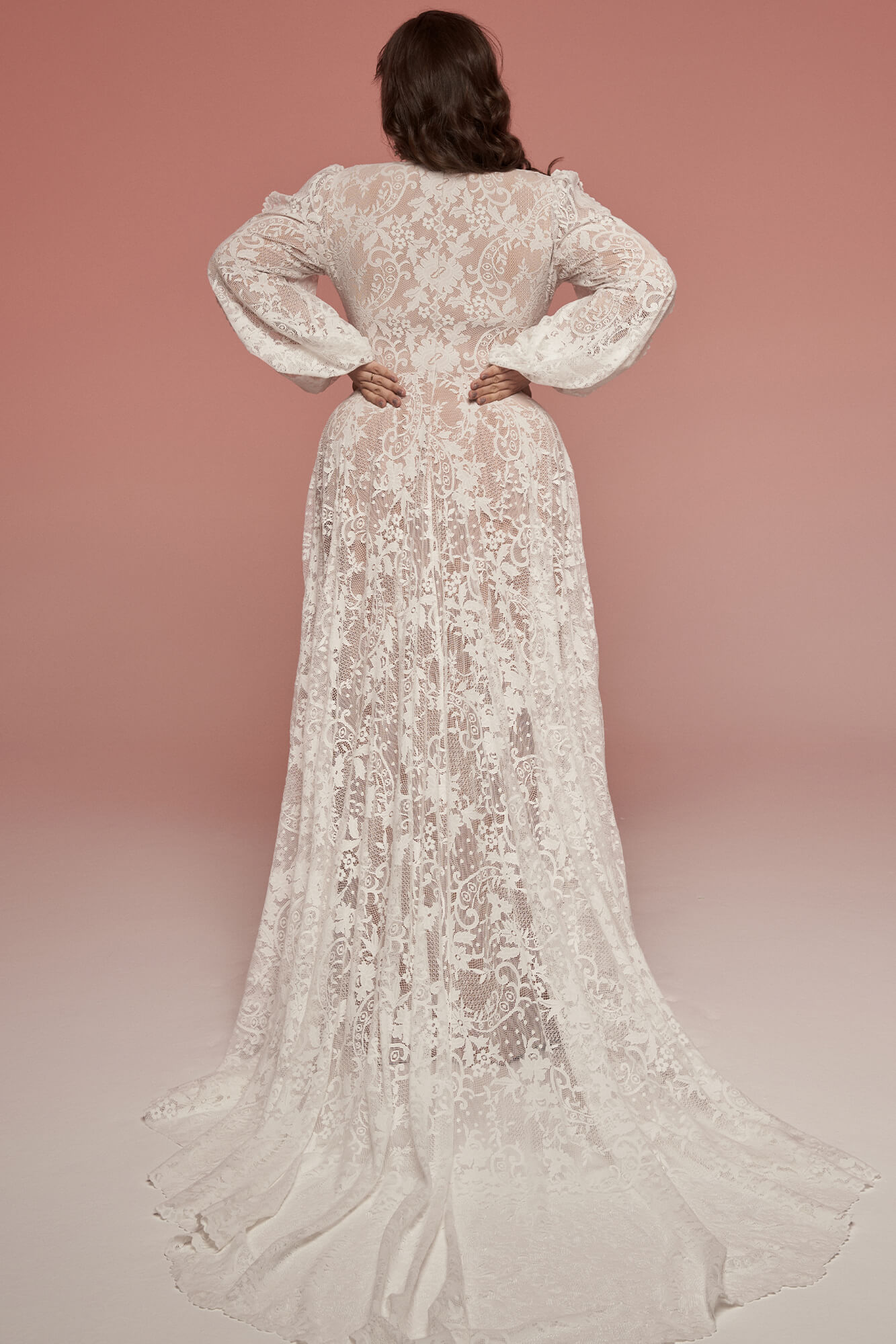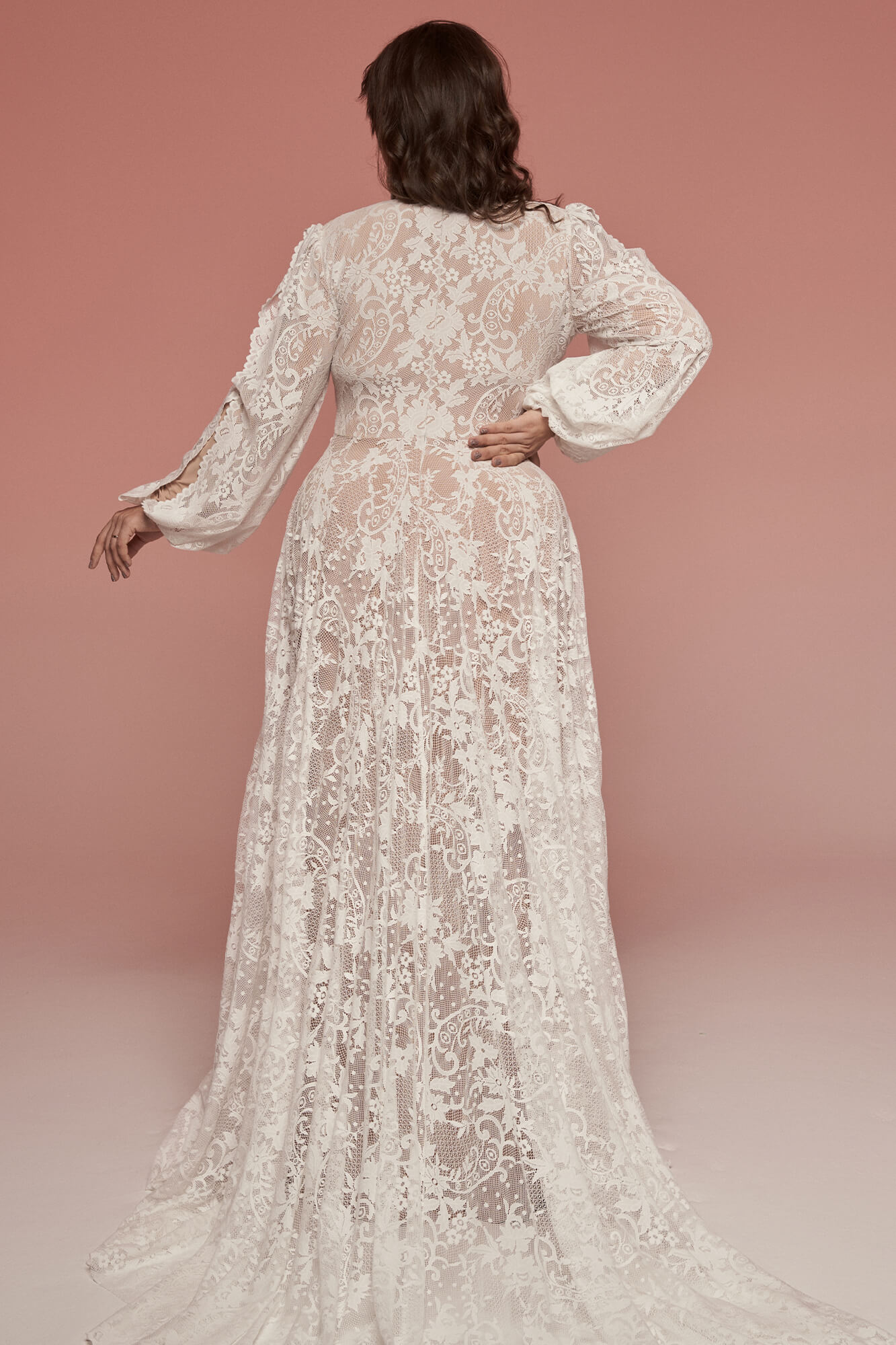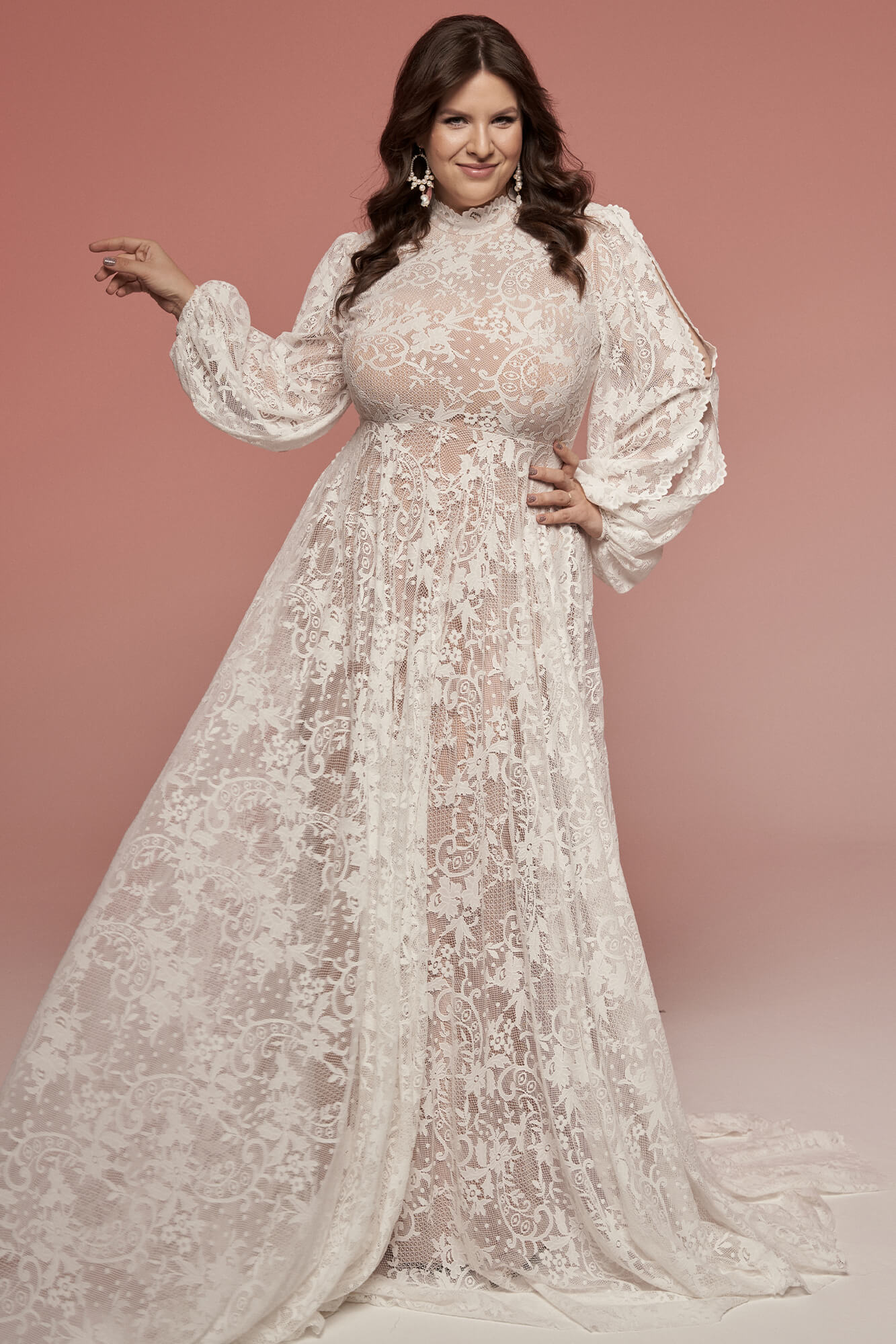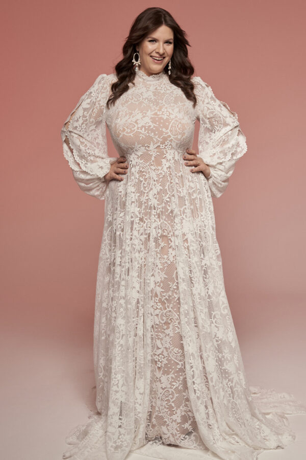 Suknia ślubna plus size ze stójką i bufiastymi rękawami w stylu vintage. Uszyta z elastycznej koronki w odcieniu ivory, z cielistą podszewką przyjemną dla skóry. Zabudowany dekolt, długi rękaw i pełna spódnica z trenem tworzą spójną, osłoniętą formę. Model pozwala czuć się swobodnie i stabilnie – także w klasycznej bieliźnie. Istnieje możliwość dopasowania dekoltu, rękawów i innych detali do Twoich potrzeb.