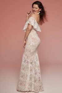 Koronkowa suknia ślubna plus size o kroju rybki z delikatnie odsłoniętymi ramionami. Elastyczna koronka w odcieniu ecru miękko dopasowuje się do sylwetki. Cielista podszewka z dzianiny podkreśla wzór materiału i zwiększa komfort noszenia. Fason subtelnie okala ciało, nie ograniczając ruchów. Model możesz dopasować, zmieniając kolor podszewki podczas szycia.
