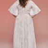 Koronkowa suknia ślubna plus size z geometrycznym wzorem i cielistą podszewką. Dekolt V wykończony ozdobną tasiemką pozwala na założenie klasycznego biustonosza. Spódnica z pełnego koła z rozporkiem lekko wiruje w tańcu. Rękaw 3/4 jest przewiewny i nie obciąża sylwetki. Model można prać w pralce i modyfikować podczas szycia na miarę.