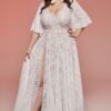 Jeśli lubisz koronkowe suknie ślubne plus size, ale wolisz geometryczne motywy zamiast kwiatowych, ten model może być bliżej Twojego stylu. Cielista podszewka sprawia, że wzór koronki jest bardziej wyrazisty i czytelny. Materiał jest miękki i elastyczny, dzięki czemu dobrze dopasowuje się do ciała.