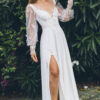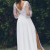 Spódnica wykonana z pełnego koła pięknie układa się podczas ruchu, a wysokie rozcięcie po prawej stronie dodaje sukni dynamiki i pozwala pokazać nogę. Dekolt na plecach w kształcie litery V z podwójną linią krepy tworzy efekt subtelnej głębi. Suknia nadaje się zarówno na romantyczny plenerowy ślub z wiankiem i sandałkami, jak i elegancką ceremonię w katedrze z welonem i biżuterią.