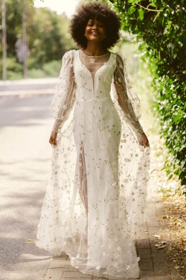 Na bazę nałożono trójwymiarowe kwiaty z delikatnymi akcentami zieleni, co nadaje sukni oryginalnego charakteru i łamie klasyczny, całkowicie biały wygląd. Długie, lekkie rękawy oraz zabudowany dekolt tworzą efekt subtelnej „koronki niewidki”, która harmonijnie współgra z wypukłymi kwiatuszkami.