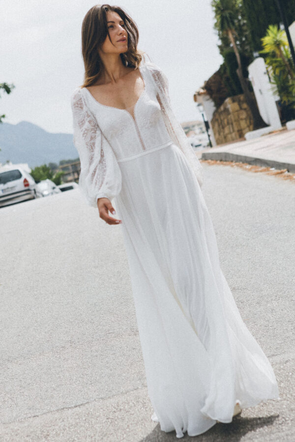 Lekka, romantyczna i kobieca suknia ślubna z gładkim szyfonowym dołem i koronkową górą. Pełne koło spódnicy pozwala na swobodne wirowanie w tańcu, a przy staniu subtelnie opływa biodra, nie dodając objętości. Koronkowe rękawy i dekolt z delikatnym kwiatowym wzorem diagonalnym podkreślają talię i biust. Długi rękaw pozostaje przewiewny dzięki subtelnemu rozcięciu, a cienki pasek opcjonalnie zaznacza talię. Suknia sprawdzi się zarówno na ceremonii w eleganckiej sali, jak i przyjęciu w plenerze.