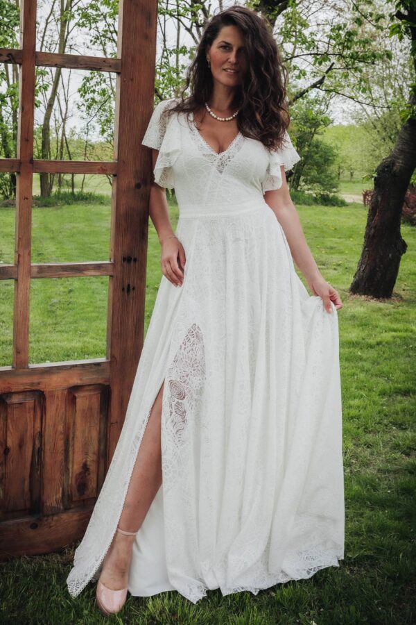 Kopertowa suknia ślubna z dekoltem w kształcie litery V subtelnie podkreśla biust i talię, tworząc lekką i harmonijną sylwetkę. Miękka, elastyczna koronka o geometrycznym wzorze zapewnia komfort noszenia i ciekawy efekt wizualny. Rękawy skrojone z pełnego koła pozwalają na pełną swobodę ruchów i delikatnie odkrywają pachy, zachowując elegancję. Rozkloszowana spódnica z rozcięciem na nogę pięknie wiruje w tańcu, dodając sukni lekkości. Model można w pełni personalizować – zmienić dekolt, rękawy, kolor podszewki lub usunąć rozcięcie, dopasowując suknię do własnych potrzeb.