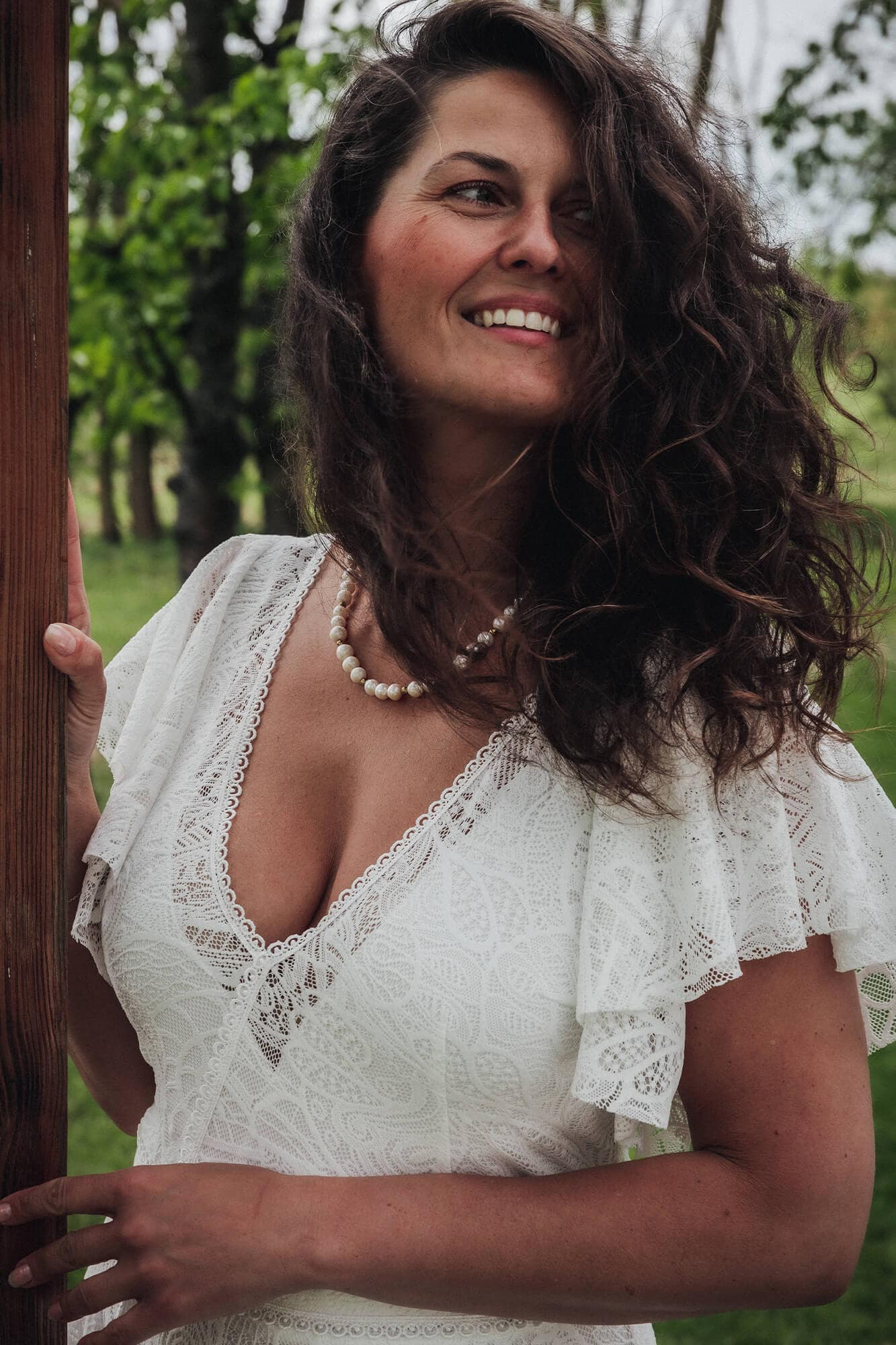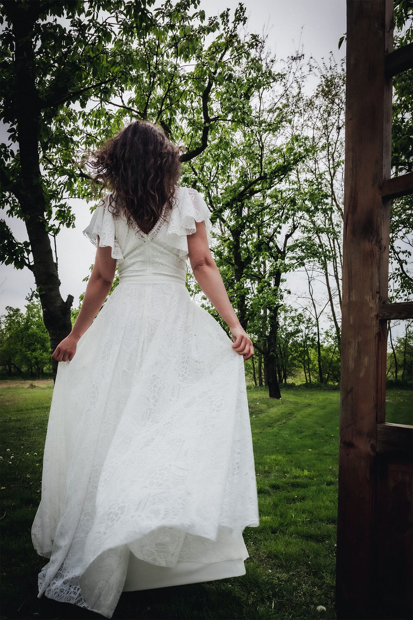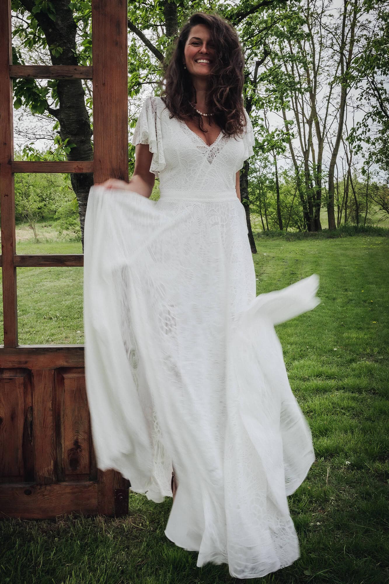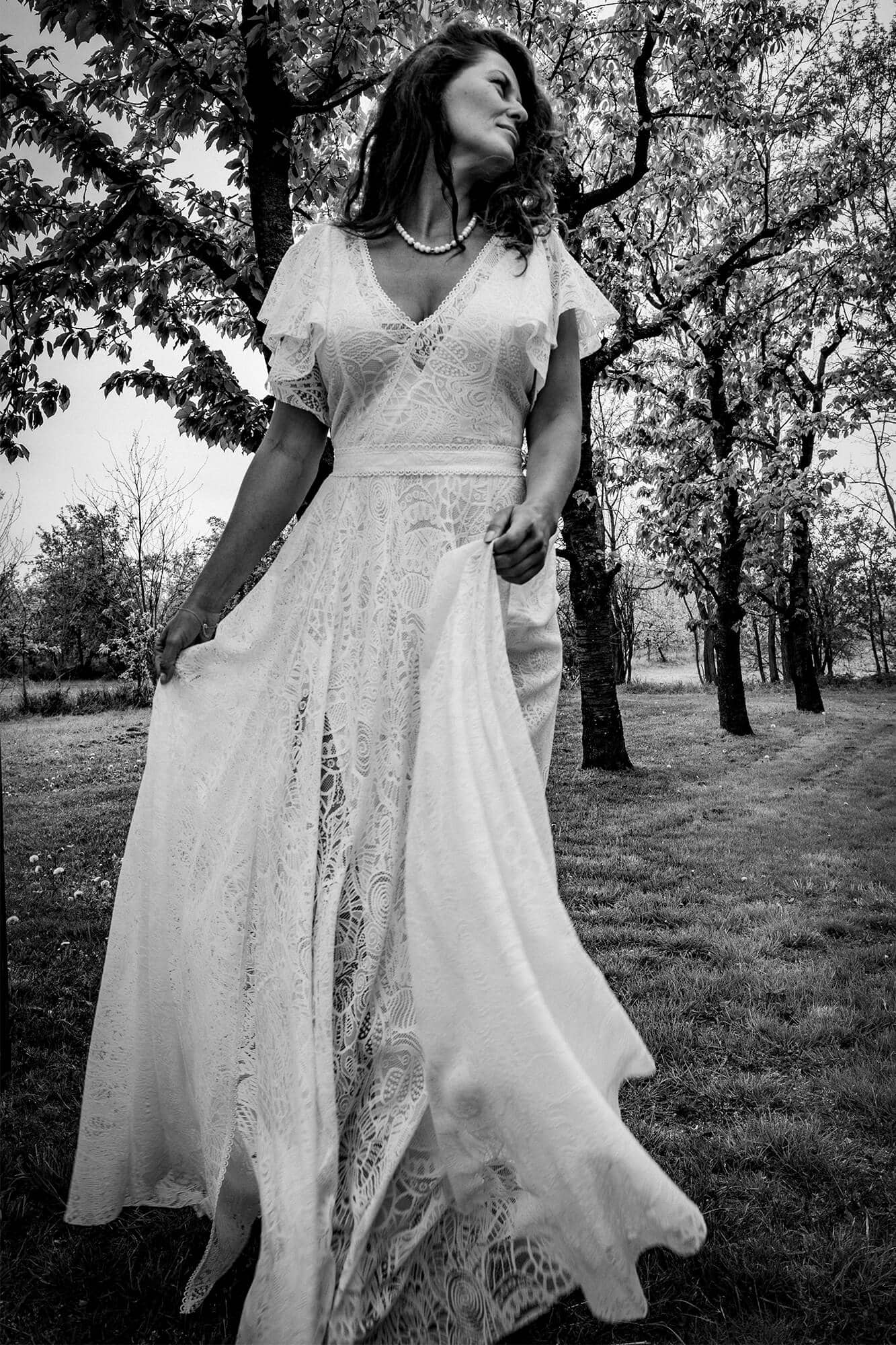 Suknia powstaje ze sprawdzonych materiałów. Koronki są miękkie, lekkie i niedrapiące – nie podrażniają skóry nawet przy wielogodzinnym noszeniu. Dobrze dopasowują się do sylwetki i pracują w ruchu, zapewniając komfort także przy zmieniającej się figurze, w tym w ciąży. Większość z nich można prać w pralce; nie gniotą się, więc suknię bez trudu spakujesz do walizki na sesję poślubną.