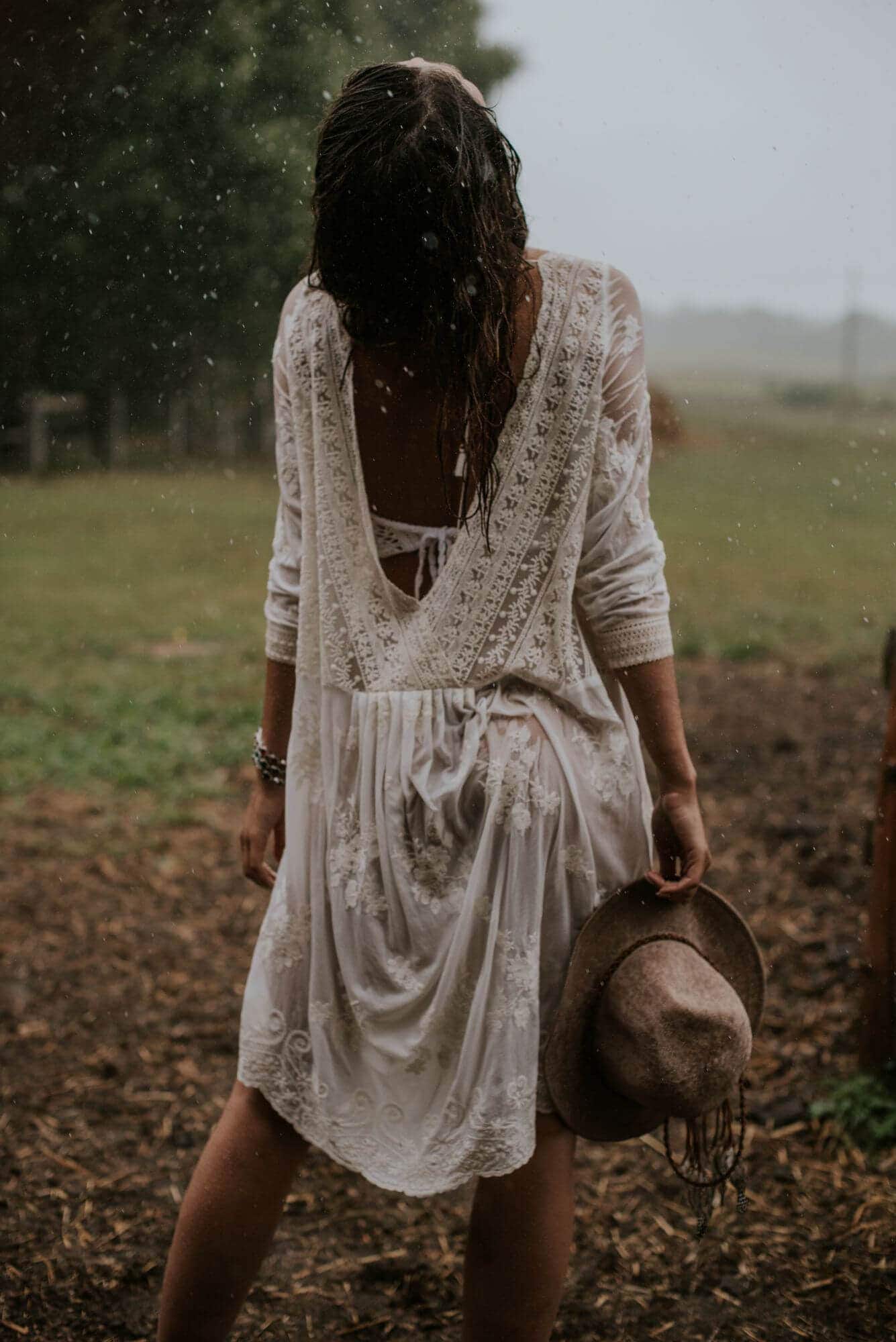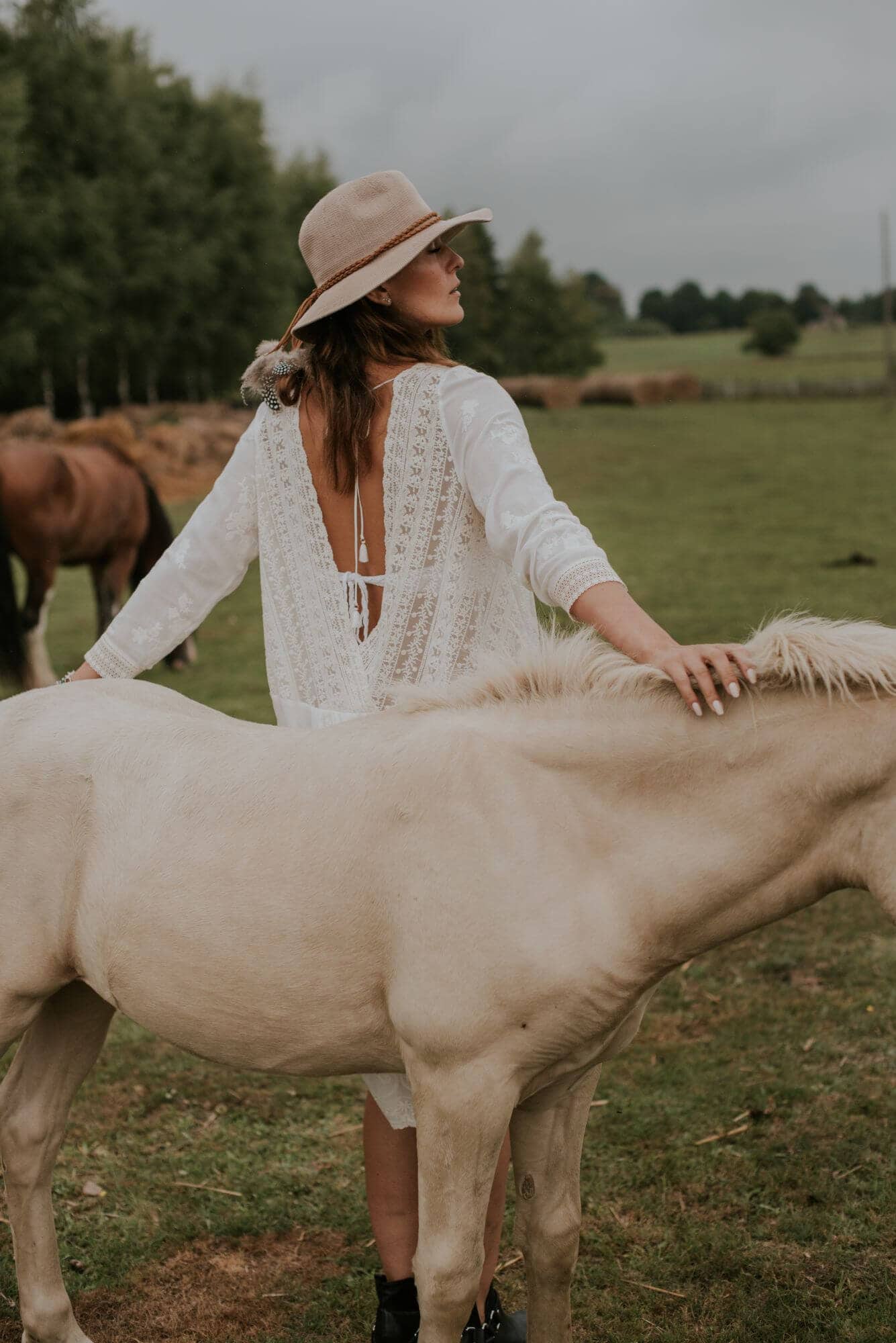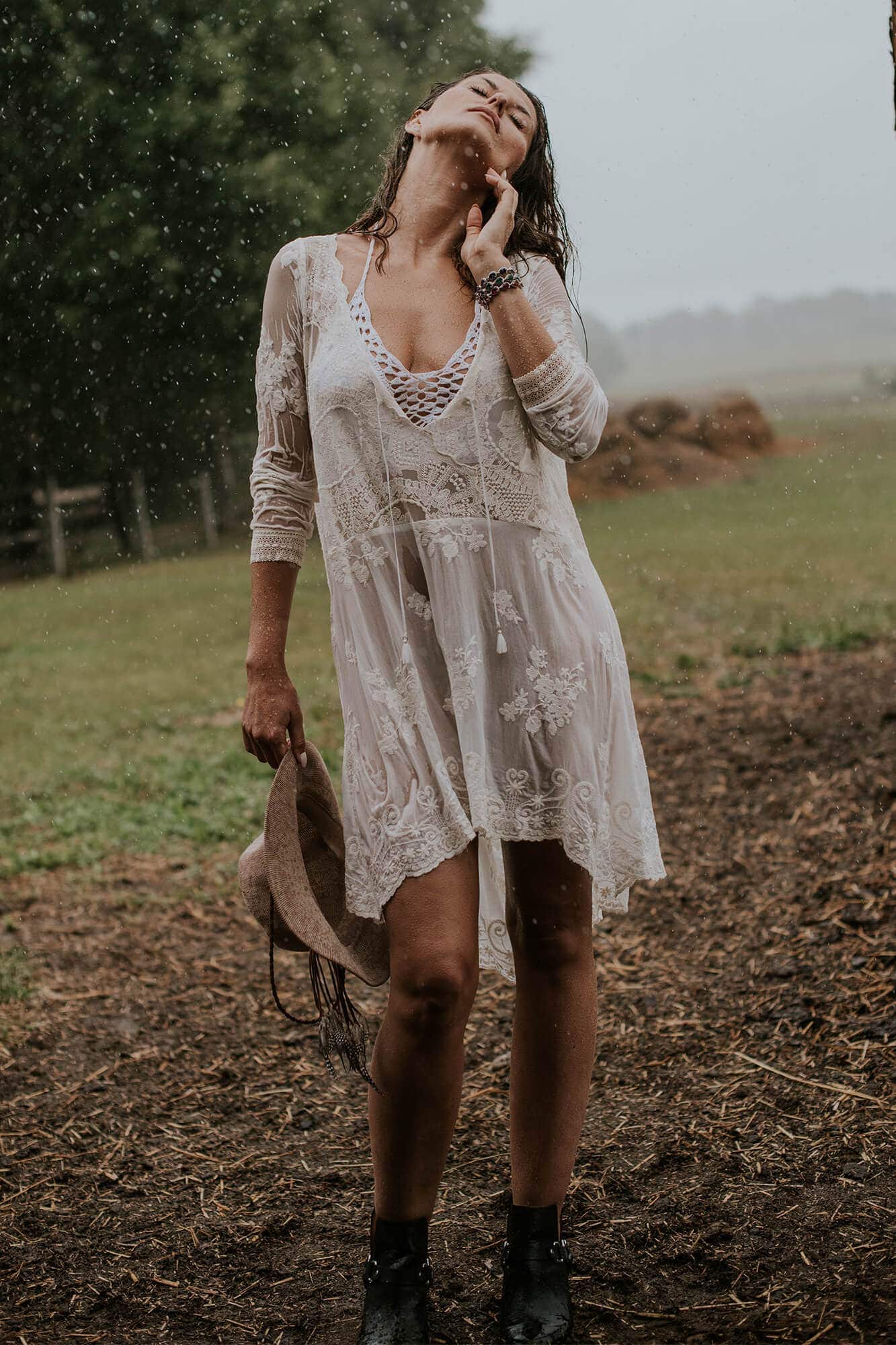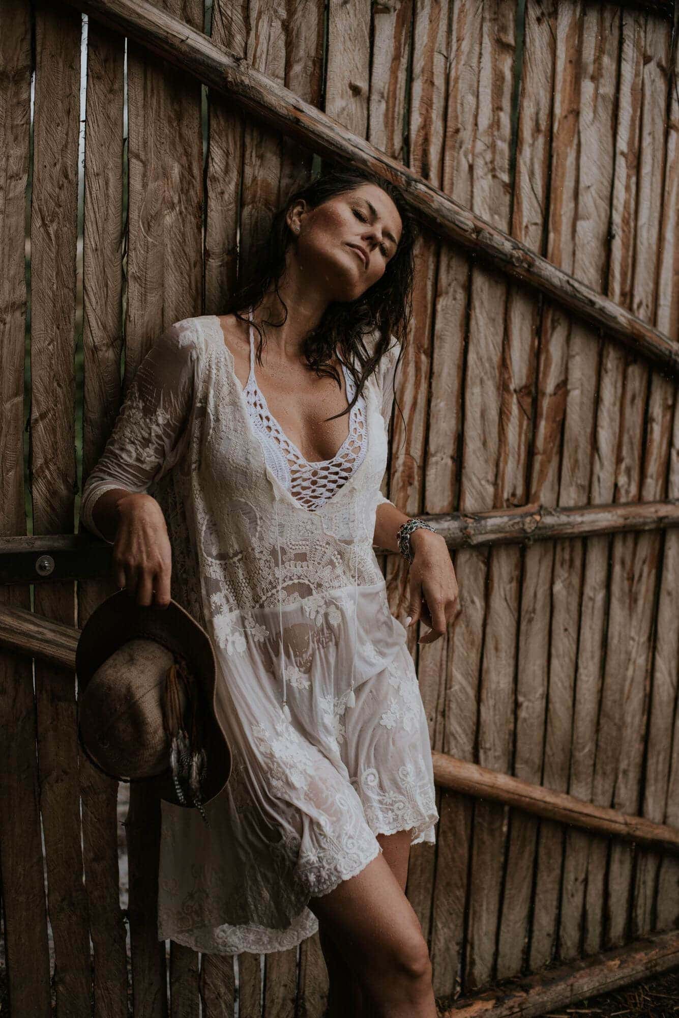 Sukienka została uszyta z białej bawełny ozdobionej delikatnymi, beżowymi haftami. Krótka forma pięknie eksponuje nogi, a swobodny krój oversize pozwala czuć się komfortowo i naturalnie, niezależnie od kształtu sylwetki. Głęboko wycięte plecy nadają całości subtelnej zmysłowości. Pod spód można założyć podszewkę, która nie jest na stałe zszyta z sukienką, dzięki czemu stylizację łatwo dopasować do własnych potrzeb. Wystarczy dobrać top, stanik lub kostium, by całkowicie zmienić charakter kreacji. To propozycja idealna na ślub cywilny, ceremonię na plaży oraz wszystkie okazje, podczas których chcesz połączyć lekkość z kobiecą swobodą.