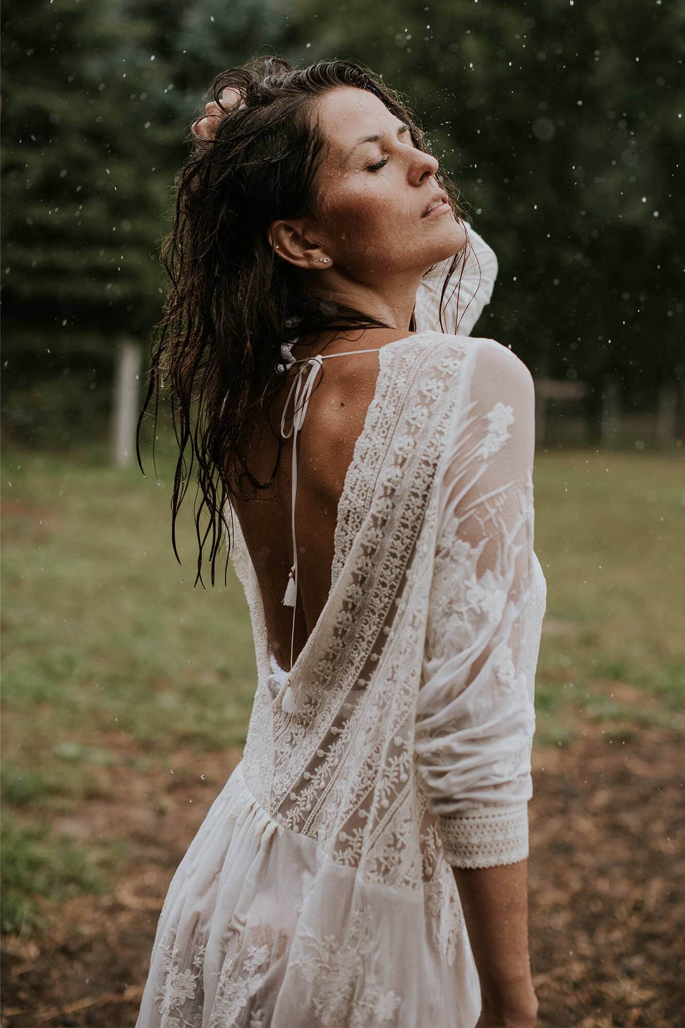 Suknia powstaje ze sprawdzonych materiałów. Koronki są miękkie, lekkie i niedrapiące – nie podrażniają skóry nawet przy wielogodzinnym noszeniu. Dobrze dopasowują się do sylwetki i pracują w ruchu, zapewniając komfort także przy zmieniającej się figurze, w tym w ciąży. Większość z nich można prać w pralce; nie gniotą się, więc suknię bez trudu spakujesz do walizki na sesję poślubną.