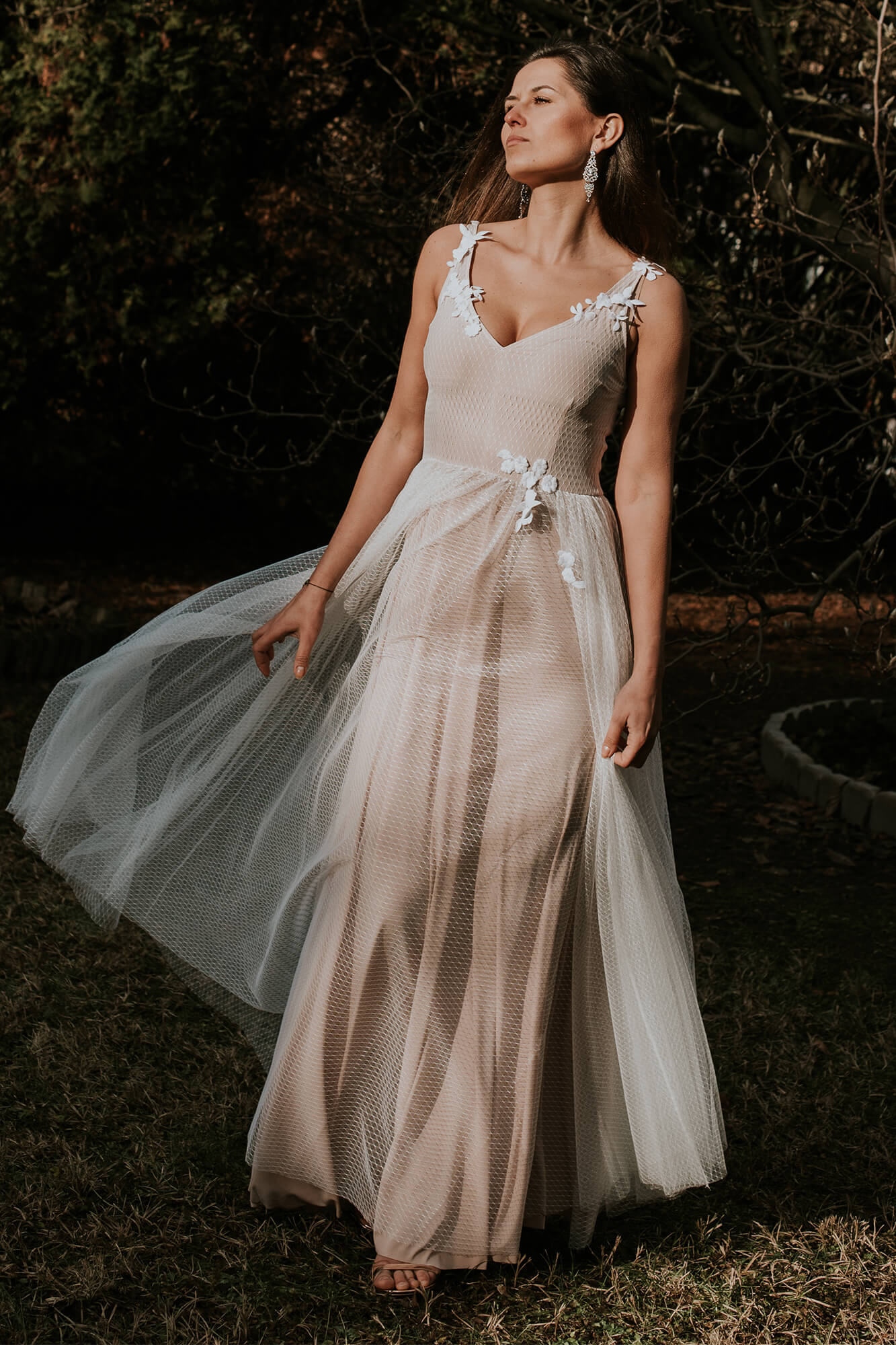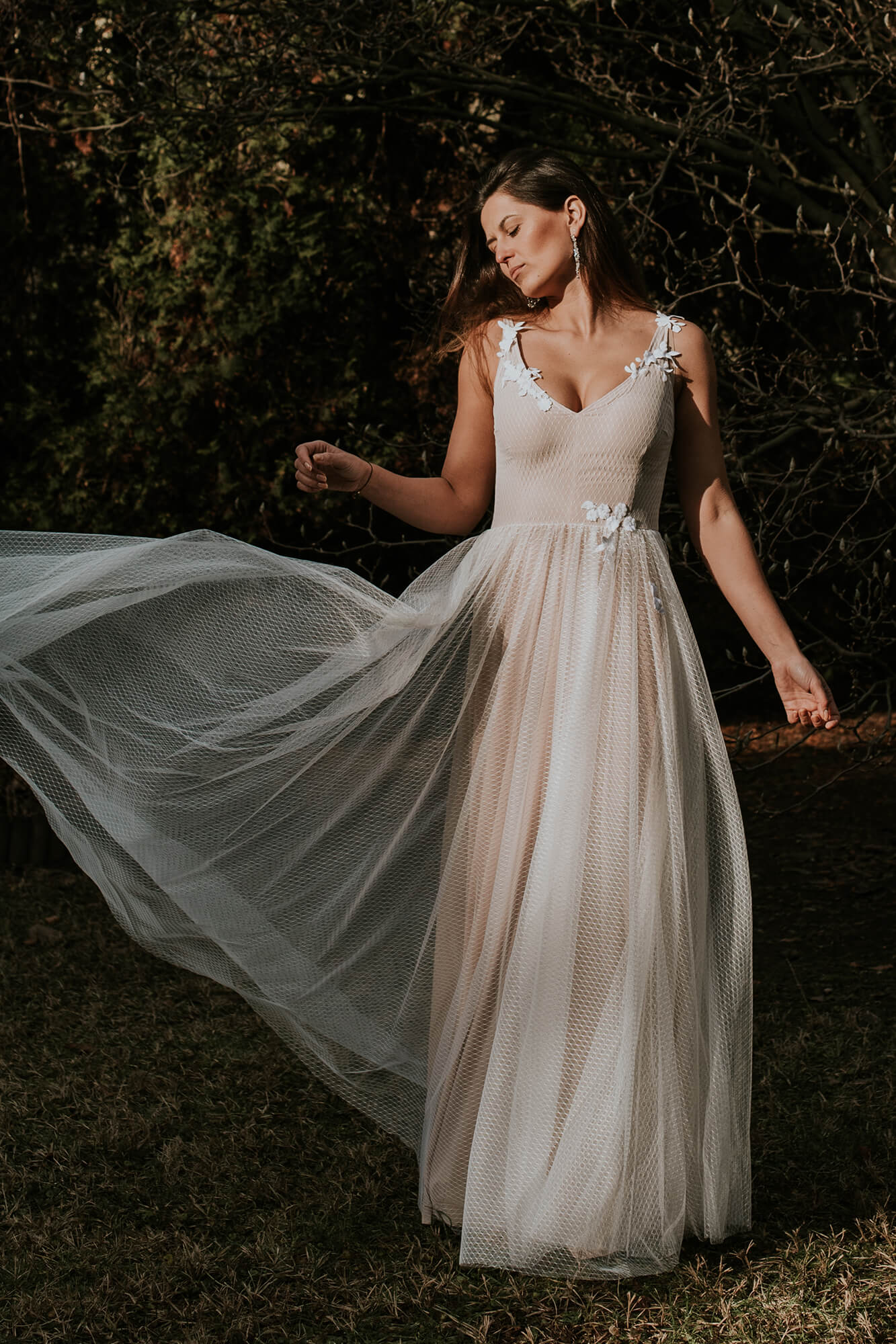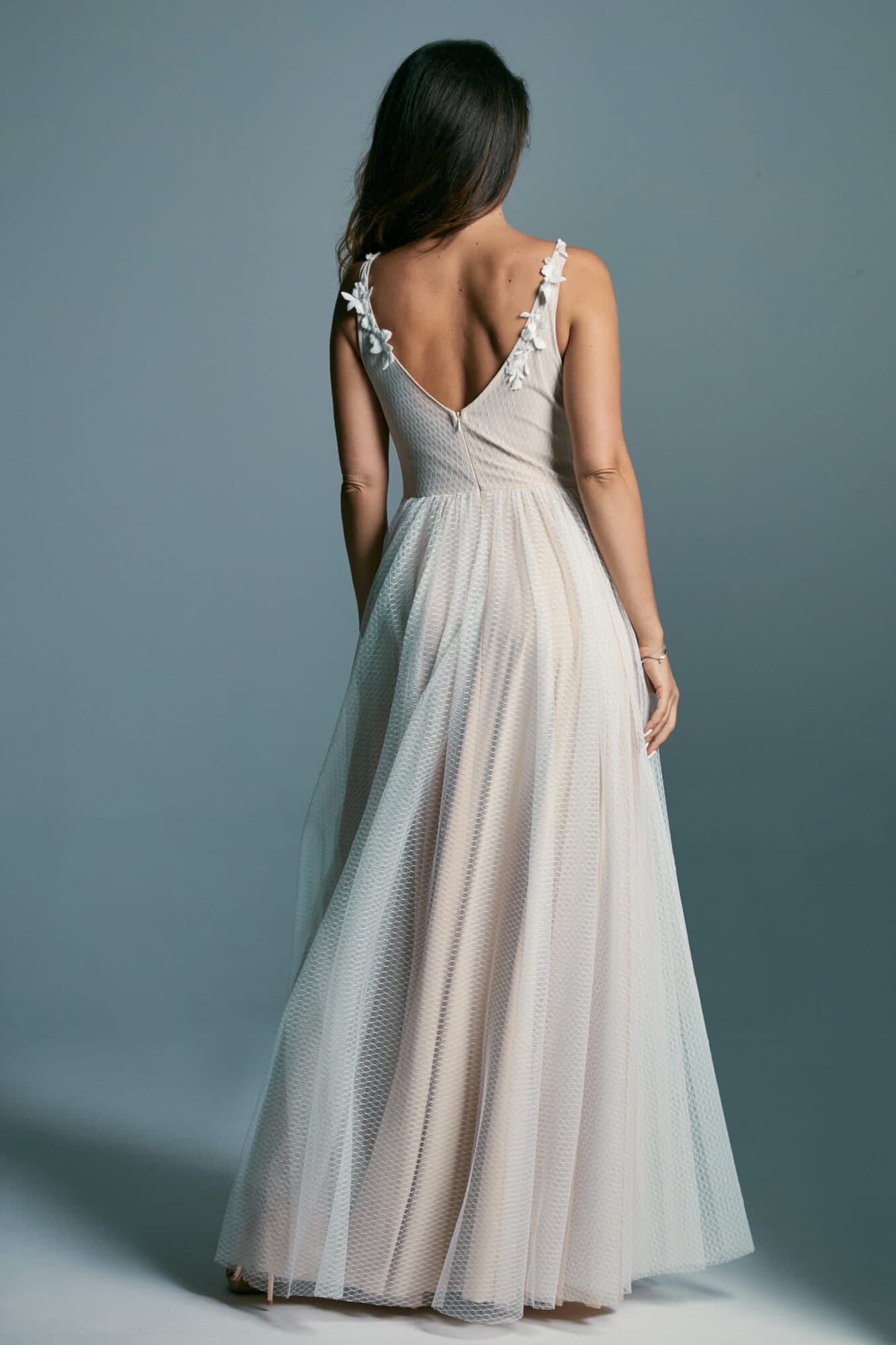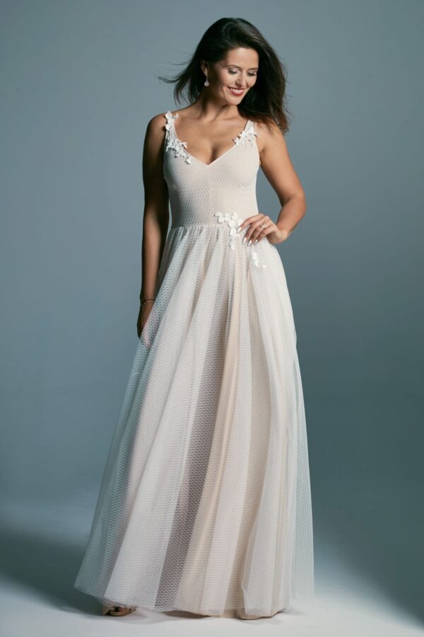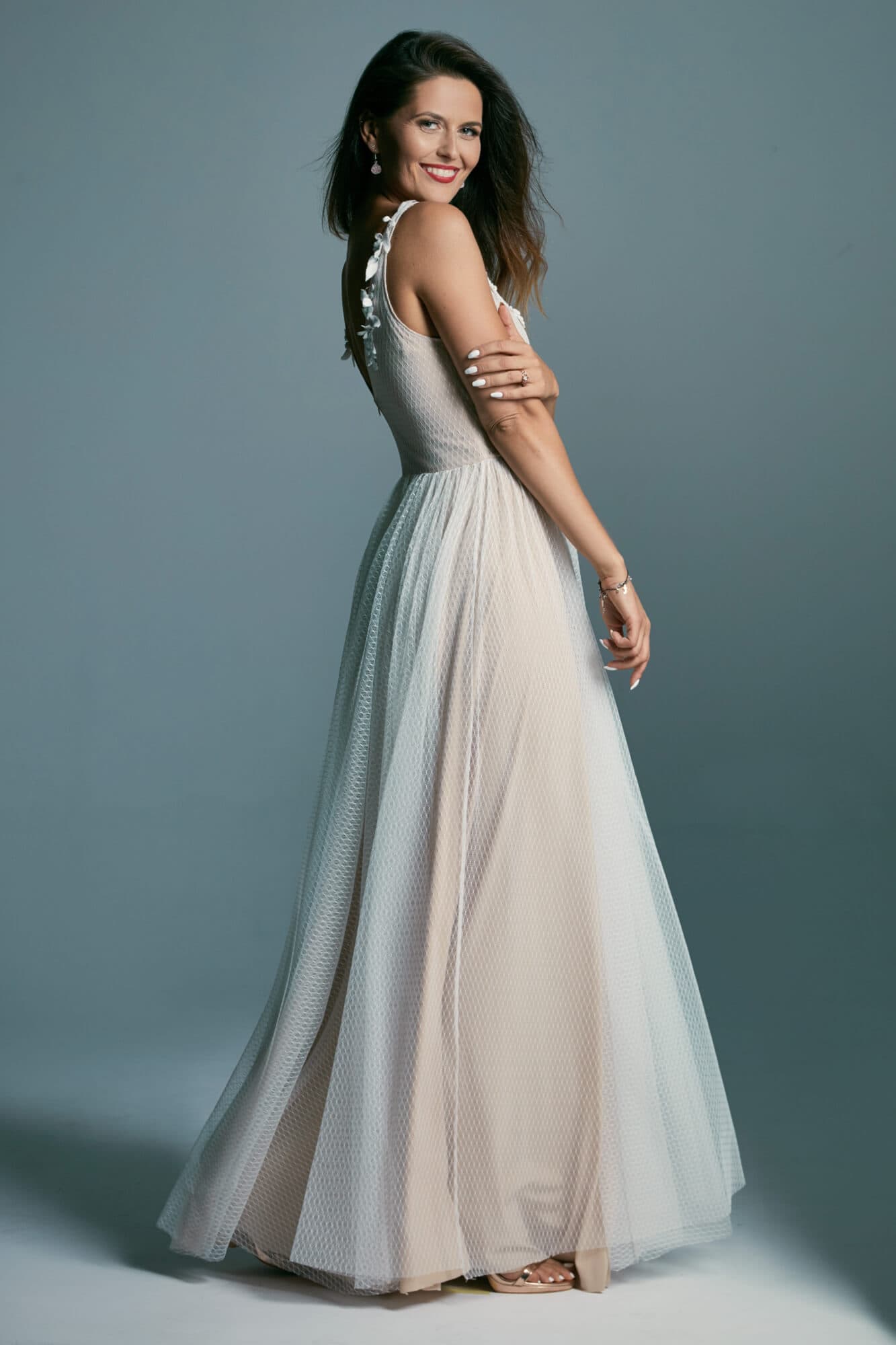 Góra na wąskich ramiączkach jest starannie dopasowana i subtelnie podkreśla linię dekoltu. Wycięcie w kształcie litery V optycznie wydłuża sylwetkę, zachowując jej naturalne proporcje. Ramiączka zdobią aplikacje z drobnych, białych kwiatów, których wypukła faktura delikatnie odznacza się na tle tiulu, dodając kreacji uroczystego charakteru. Spódnica z pełnego koła, z lekkim marszczeniem w talii, pięknie pracuje w ruchu i nadaje sylwetce miękkości. W pasie również pojawiają się subtelne kwiatowe akcenty, które harmonijnie łączą całość. Model pozwala na założenie biustonosza, zapewniając komfort i swobodę przez cały dzień.