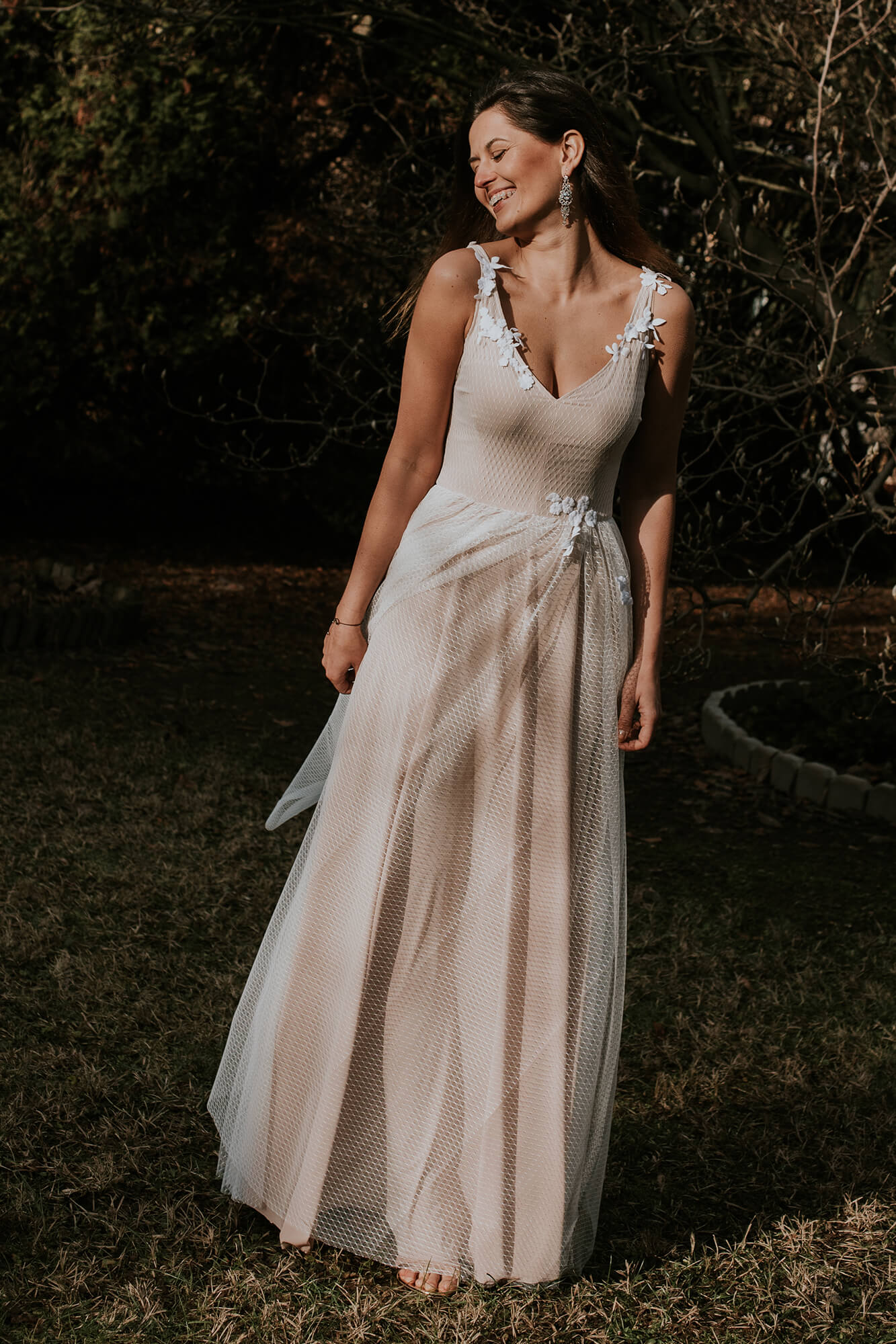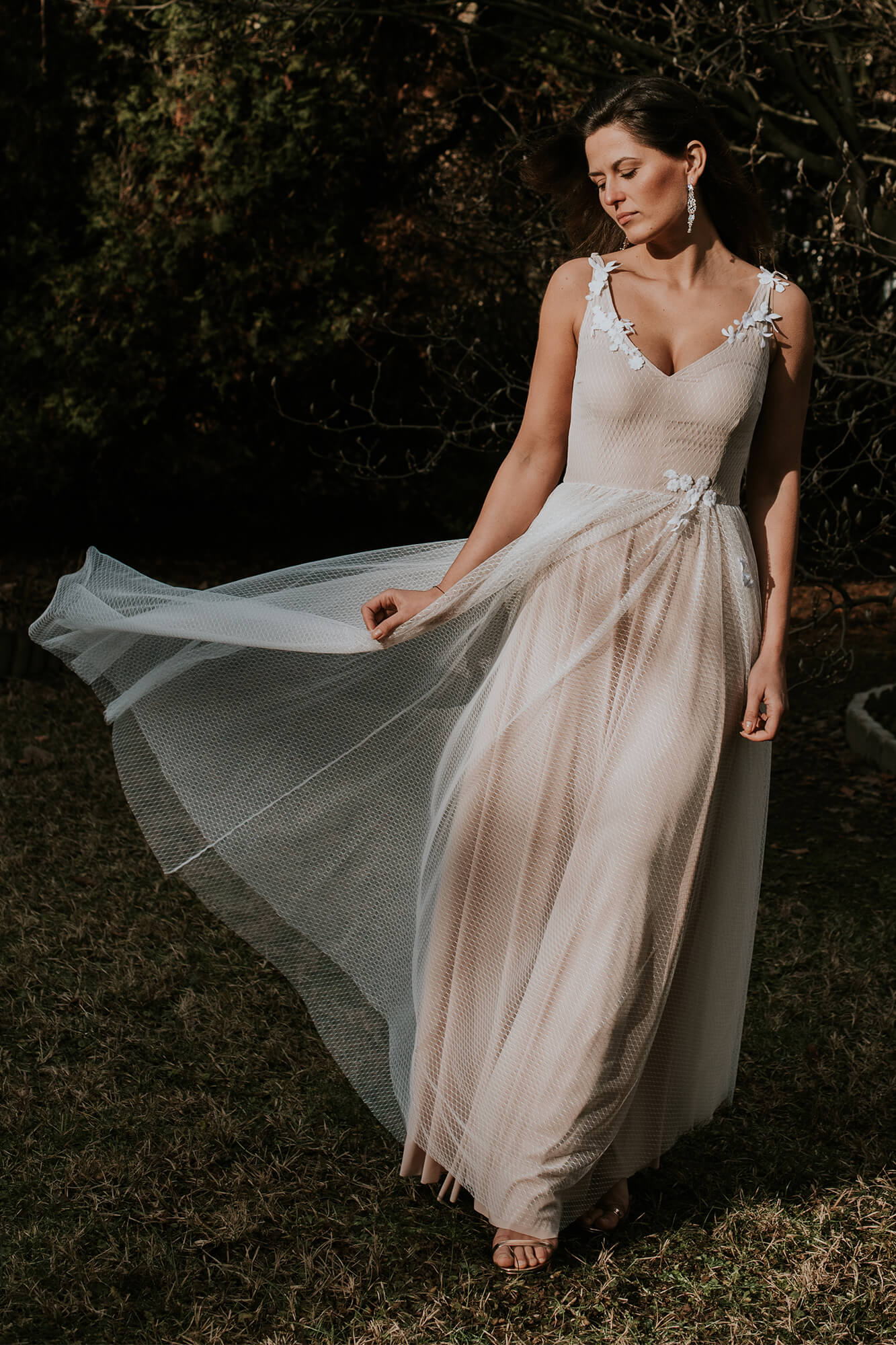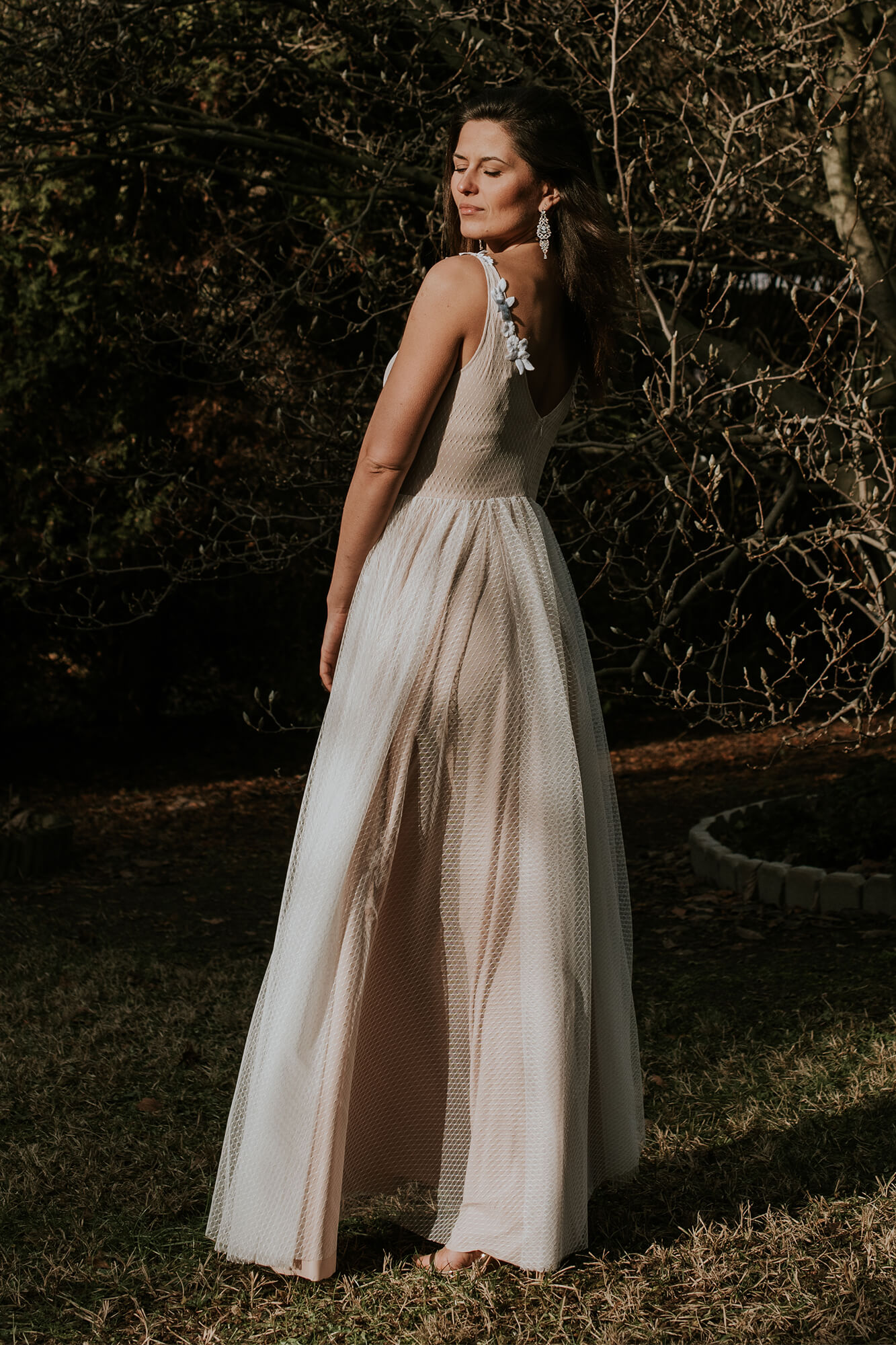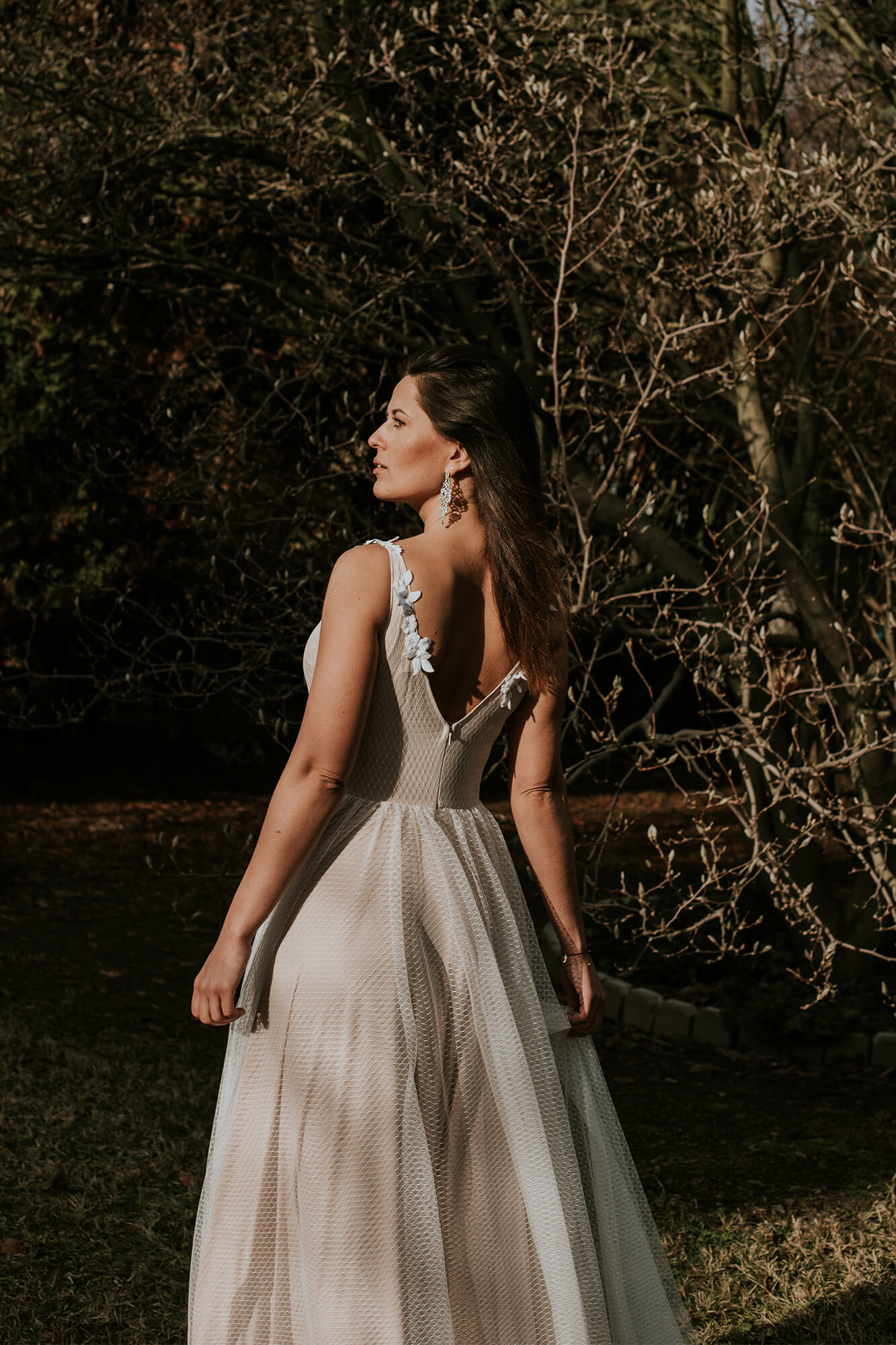 Wyjątkowo romantyczna, dziewczęca suknia ślubna z tiulu została uszyta z miękkiego, cienkiego materiału w drobne romby. Piaskowa podszewka podkreśla oryginalną fakturę tkaniny i nadaje całości ciepłego, szlachetnego tonu. Lekka konstrukcja sprawia, że suknia jest zwiewna i swobodnie układa się w ruchu.