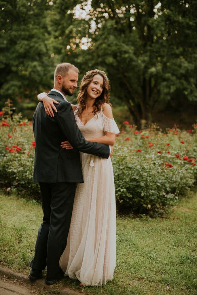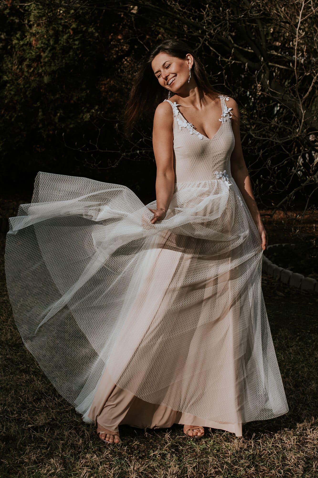 Suknia powstaje ze sprawdzonych materiałów. Koronki są miękkie, lekkie i niedrapiące – nie podrażniają skóry nawet przy wielogodzinnym noszeniu. Dobrze dopasowują się do sylwetki i pracują w ruchu, zapewniając komfort także przy zmieniającej się figurze, w tym w ciąży. Większość z nich można prać w pralce; nie gniotą się, więc suknię bez trudu spakujesz do walizki na sesję poślubną.