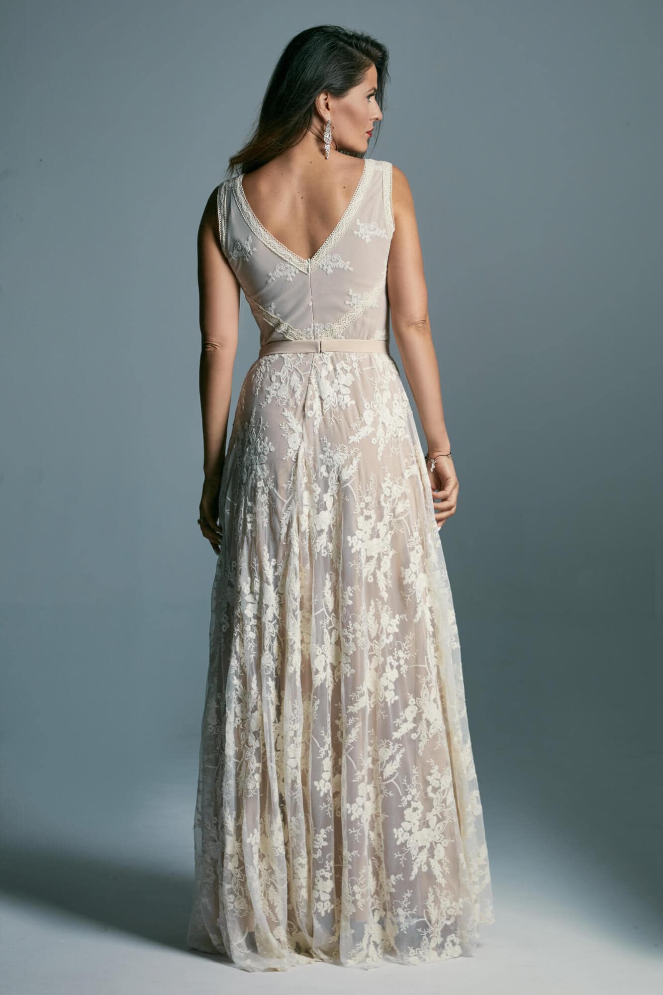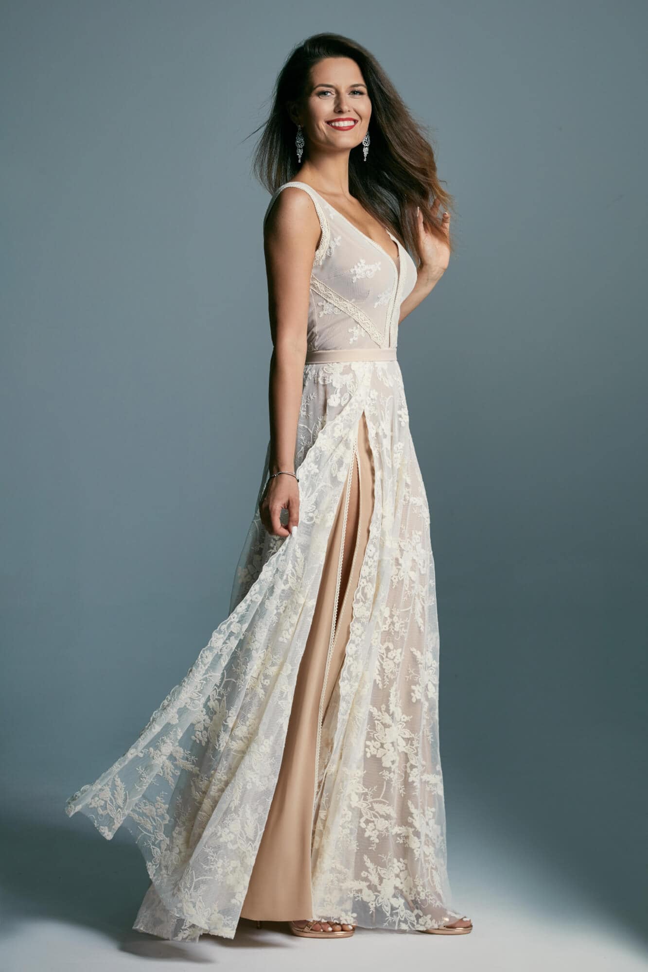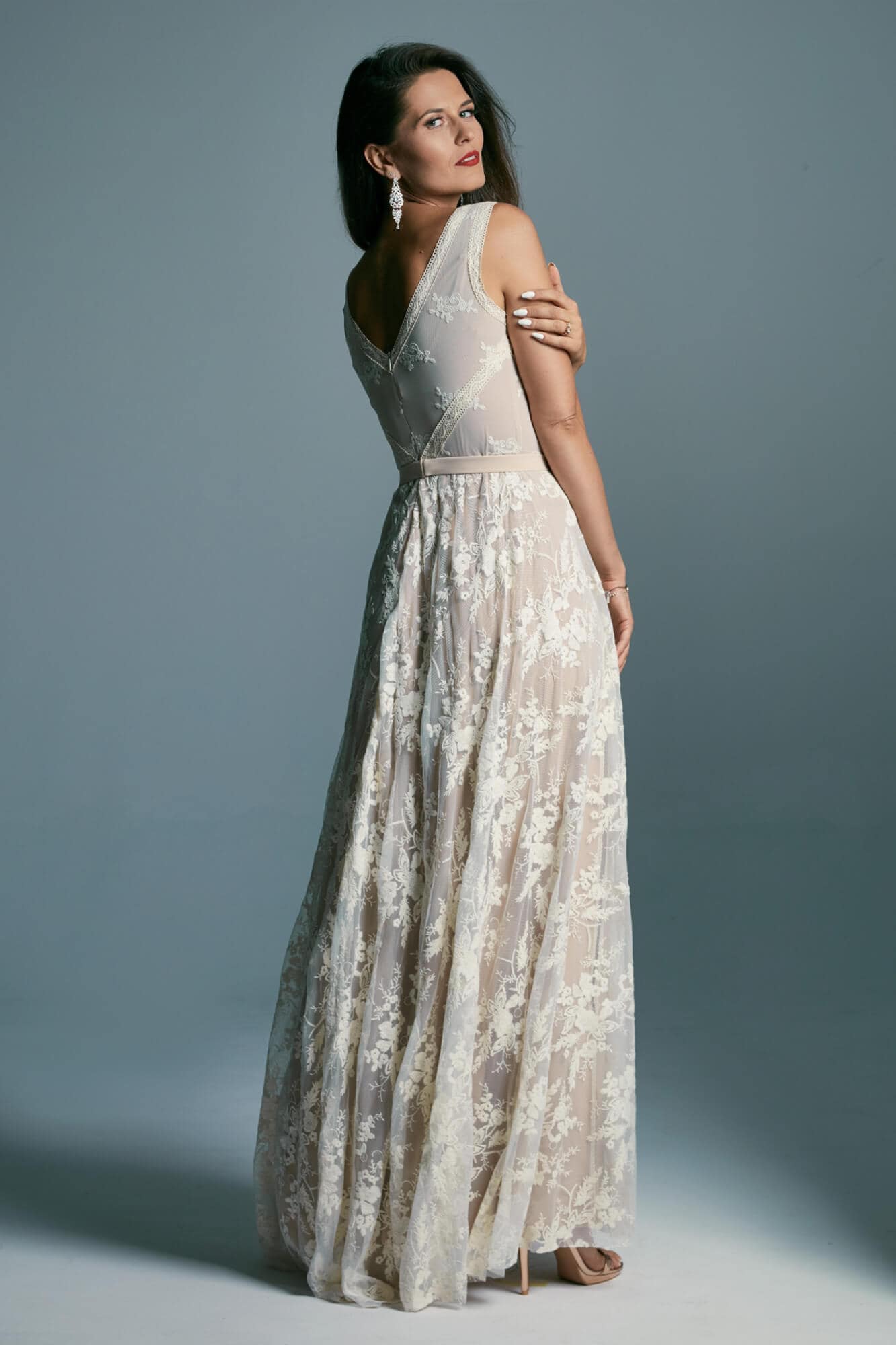 Górę stanowi dopasowany top na szerokich ramiączkach z długim, zwężającym się dekoltem sięgającym pasa. Ukośne tasiemki poprowadzone od biustu do talii w połączeniu z głębokim wycięciem optycznie wydłużają sylwetkę i podkreślają jej naturalne proporcje. Spódnica z tej samej koronki miękko opada ku dołowi, tworząc linię litery A. Pas w nieco odmiennym odcieniu akcentuje talię, a brak marszczeń w tej części pozwala wybrzmieć krągłości bioder. Rozporek na nodze, podszyty cielistym tiulem, dodaje lekkości i wyrazistości. Wycięcie z tyłu sięga połowy pleców, umożliwiając założenie cielistego stanika i zapewniając komfort noszenia.