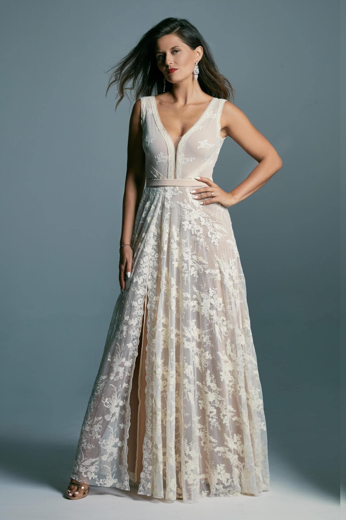 Efektowna suknia ślubna z pięknej koronki to propozycja dla Panny Młodej, która marzy o kreacji w odcieniach ciepłego beżu zamiast klasycznej bieli. Model w całości uszyto z koronki o roślinnych wzorach, ułożonej na cielistej podszewce, która wyraźnie podkreśla jej fakturę i głębię koloru.