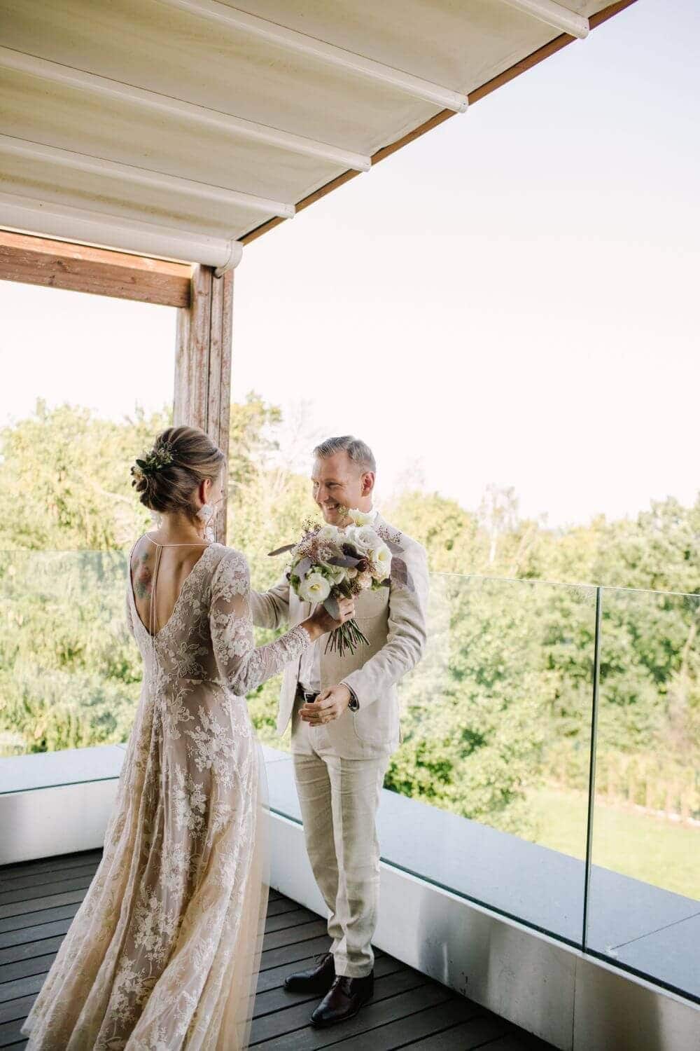 Suknia powstaje ze sprawdzonych materiałów. Koronki są miękkie, lekkie i niedrapiące – nie podrażniają skóry nawet przy wielogodzinnym noszeniu. Dobrze dopasowują się do sylwetki i pracują w ruchu, zapewniając komfort także przy zmieniającej się figurze, w tym w ciąży. Większość z nich można prać w pralce; nie gniotą się, więc suknię bez trudu spakujesz do walizki na sesję poślubną.