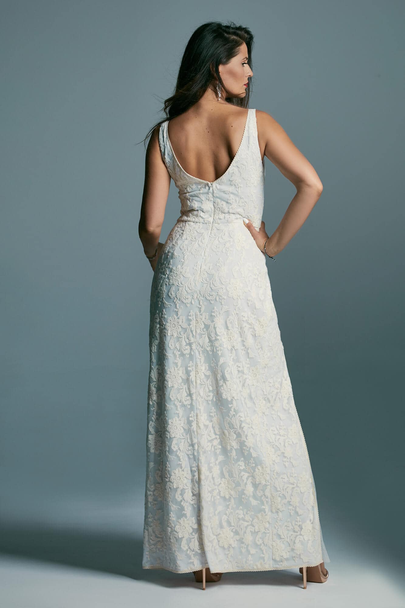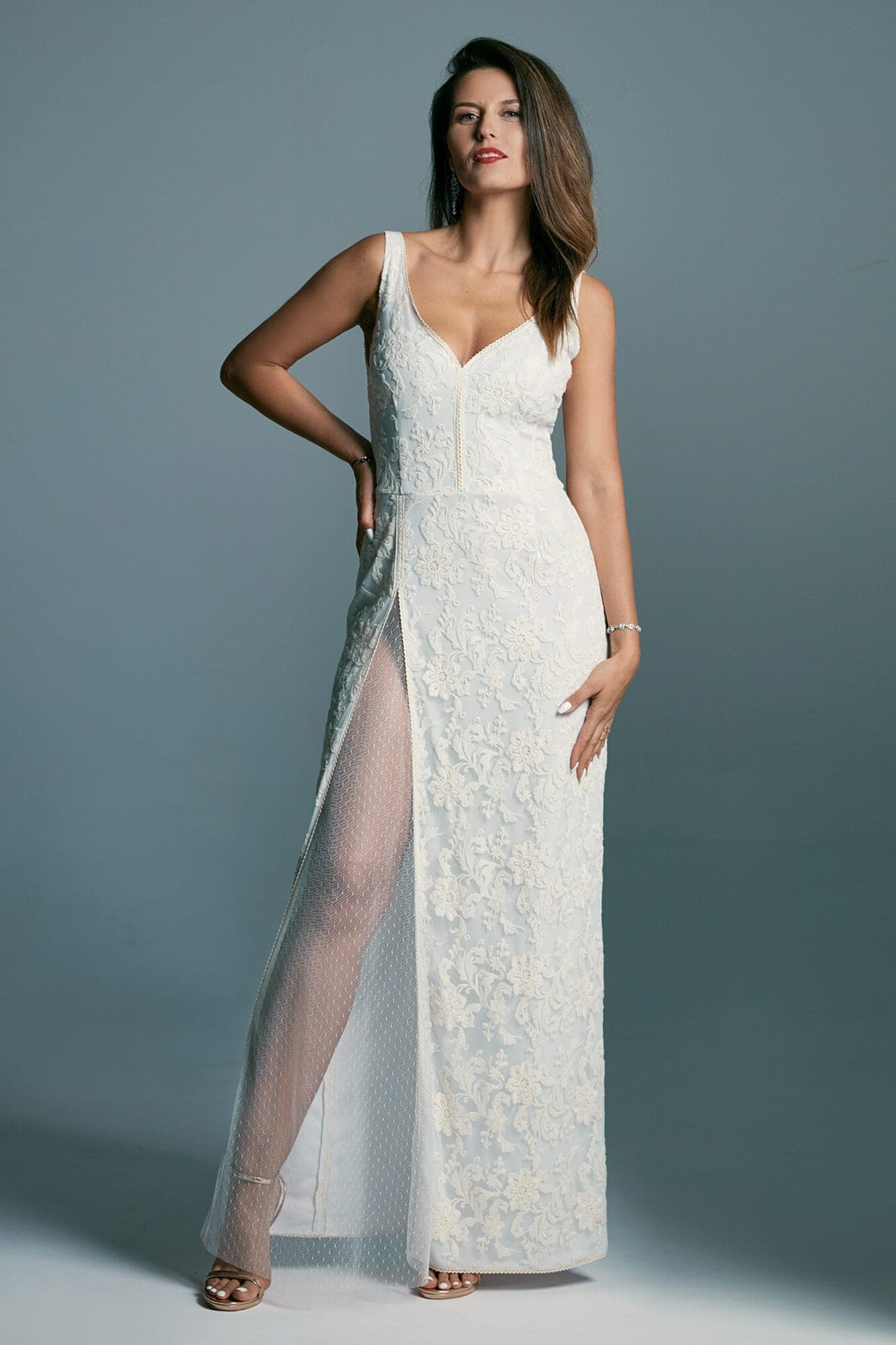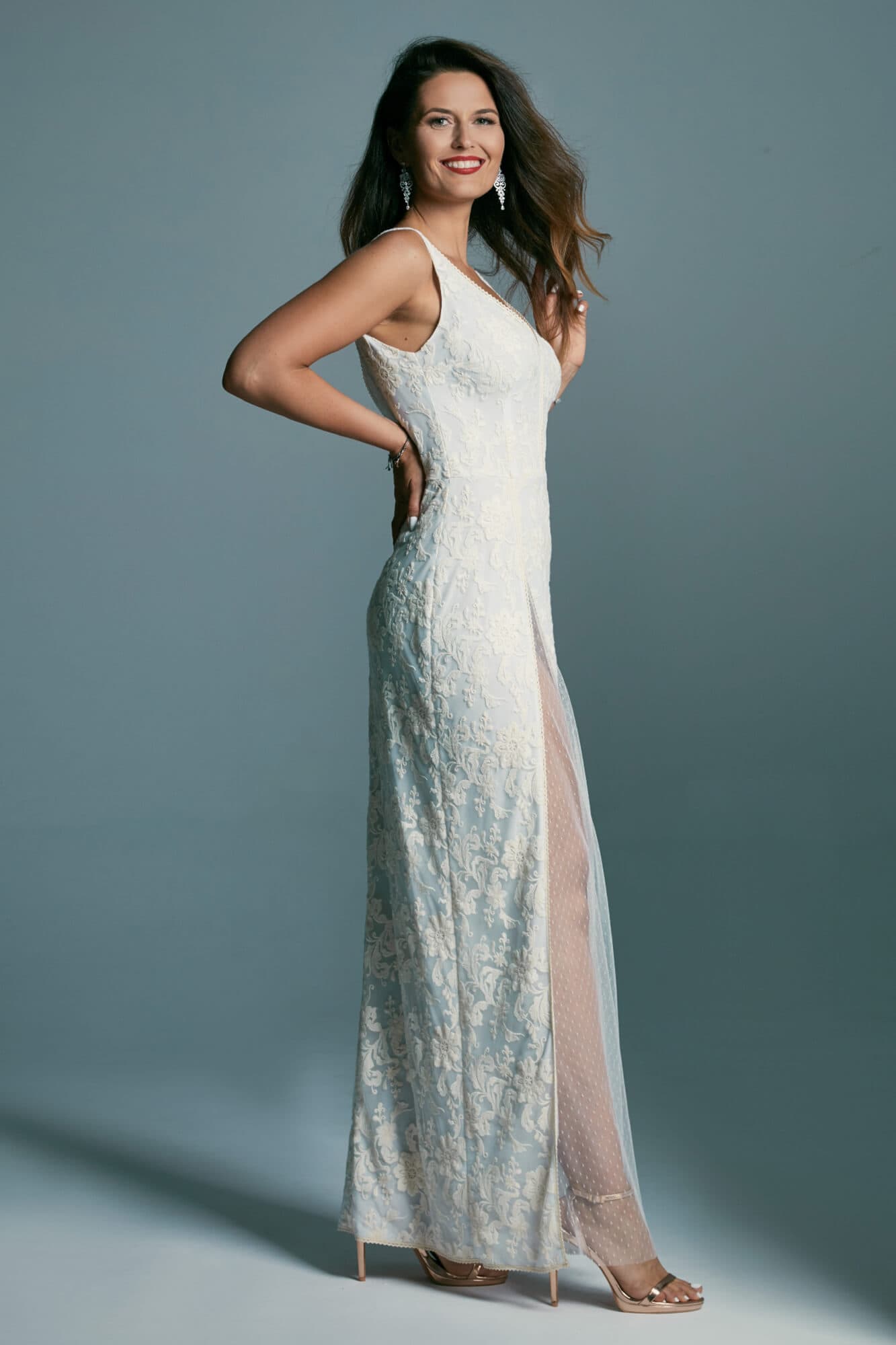 Wyprofilowany dekolt subtelnie akcentuje linię biustu, a pionowa linia poprowadzona od dekoltu do pasa optycznie wydłuża sylwetkę i nadaje jej harmonii. Plecy zostały wycięte na taką głębokość, by zachować zmysłowy charakter, a jednocześnie umożliwić komfortowe założenie biustonosza. Dół o prostym kroju zdobi rozporek na nogę obszyty pojedynczą warstwą tiulu w drobne kropeczki, który wprowadza lekkość i przełamuje minimalistyczną formę. Dzięki temu suknia zachowuje klasyczny charakter, a jednocześnie podkreśla naturalne kształty w elegancki, wyważony sposób. Ponadczasowy fason uzupełniony subtelnym detalem wycięcia prezentuje się kobieco i z klasą.