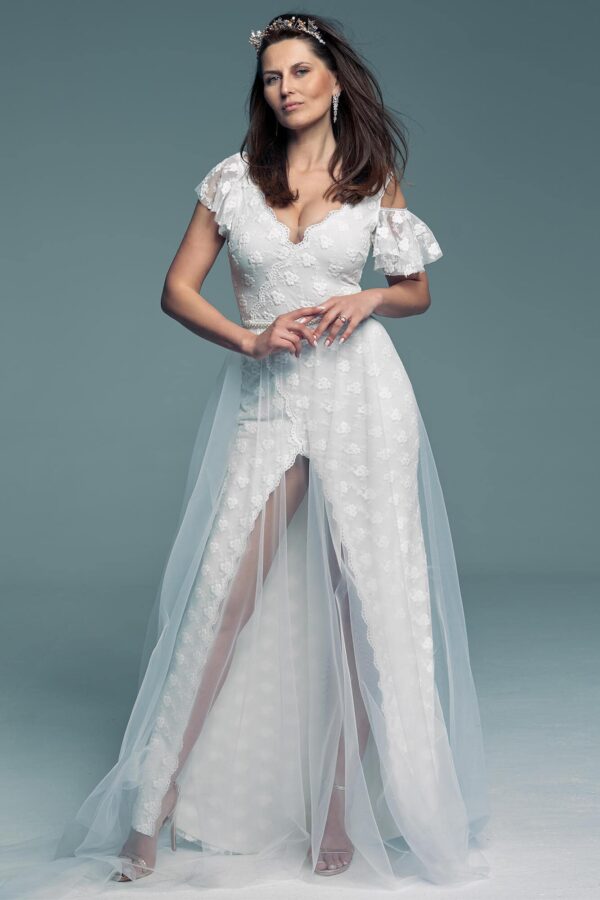 Romantyczna, a zarazem wyrazista suknia ślubna to propozycja dla panien młodych, które lubią odważniejsze rozwiązania. Głęboki dekolt oraz wysokie rozcięcie nadają jej charakteru, zachowując jednocześnie elegancką formę. Dekolt w kształcie litery V pięknie podkreśla linię biustu.