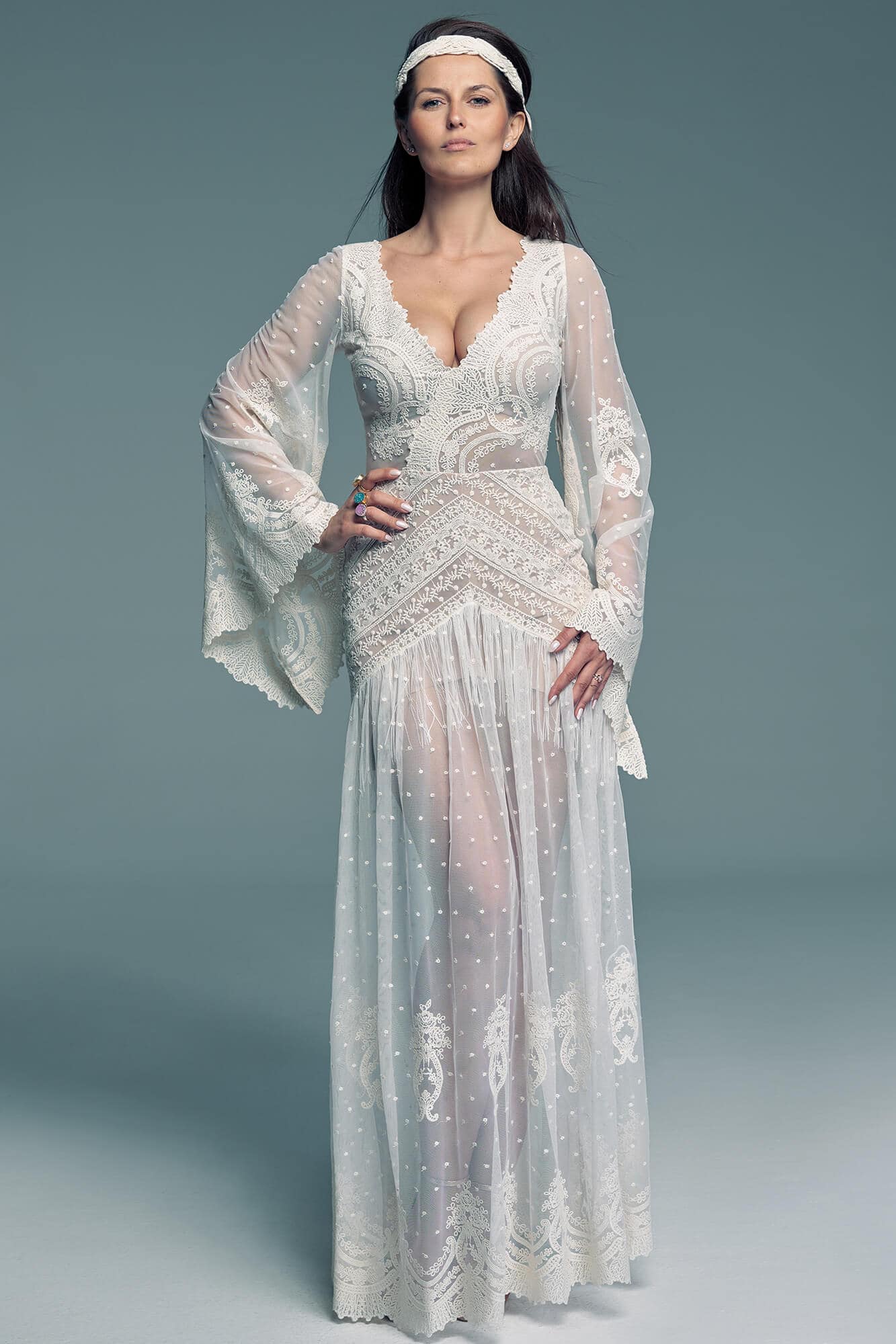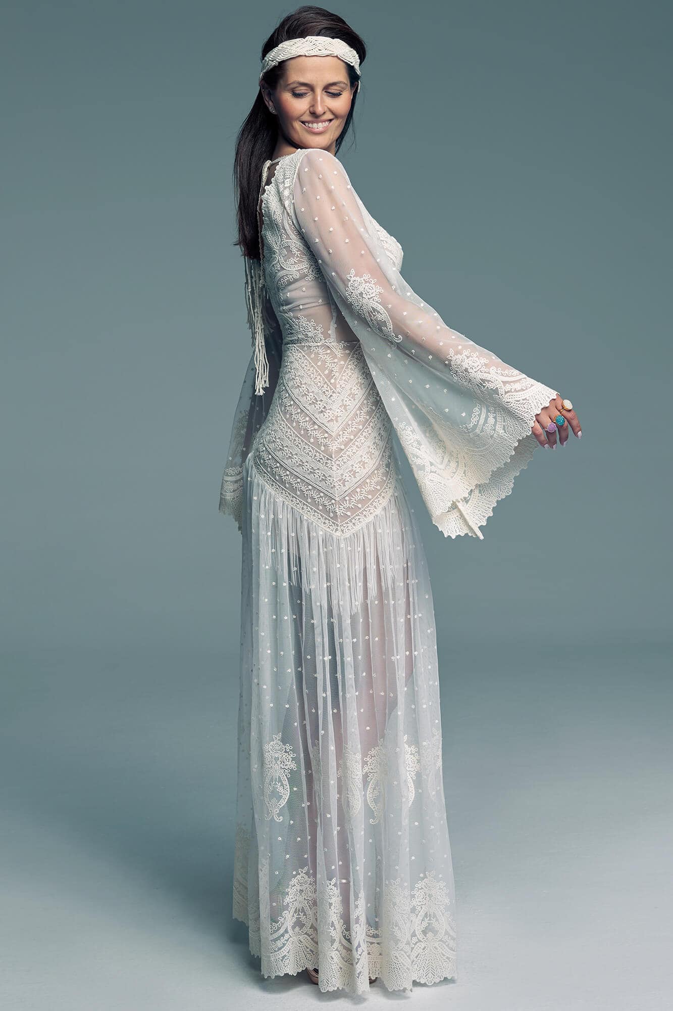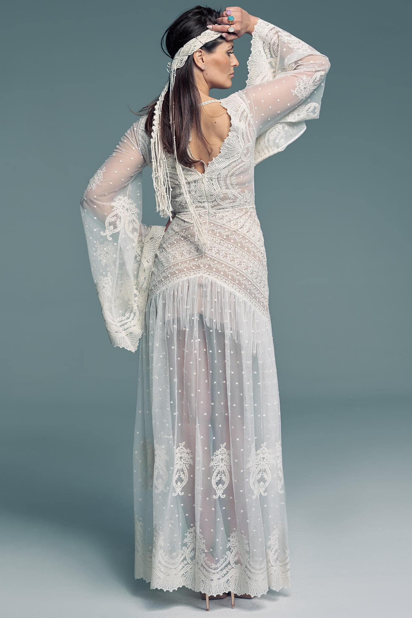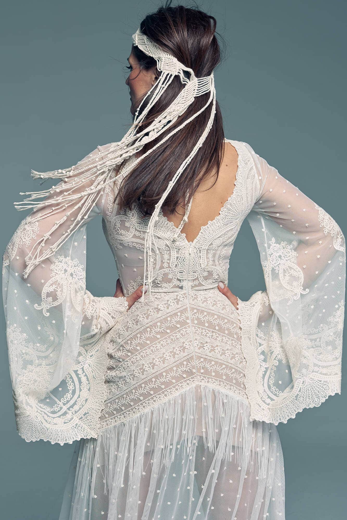 W szerokich rękawach zastosowano zróżnicowany układ wzoru – gęstszy przy mankietach i subtelniejszy w górnej części – co pozwala zachować lekkość ramion i naturalne proporcje sylwetki. Ten krój sprawdzi się przy różnych typach figury, podkreślając indywidualne atuty. Dół sukni przyciąga uwagę diagonalnym układem wzorów w okolicy bioder, który subtelnie akcentuje ich linię i dodaje sylwetce harmonii. Umieszczenie frędzli pod warstwą koronki wprowadza nieoczywisty, artystyczny detal. Groszki nadają całości romantycznej lekkości, a krajkowe wykończenia wzmacniają charakter stylizacji inspirowanej estetyką hippie. To projekt dla kobiet, które chcą wyrazić swoją swobodę i autentyczny styl w dniu ślubu.
