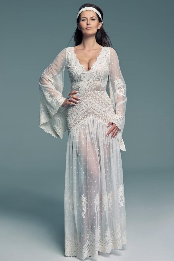 Jeśli przygotowujesz się do ślubu i bliski jest Ci styl hippie, ten model będzie naturalnym wyborem. To suknia ślubna daleka od klasycznej formy, wykonana z bawełnianej, beżowej koronki o zróżnicowanych wzorach. Głęboko wycięty, krajkowy dekolt podkreśla linię biustu i efektownie eksponuje plecy.