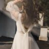 Długie rękawy zostały uszyte tak, aby zakrywać ramiona, ale nie ograniczać ruchów. Materiał zapewnia przewiewność i lekkość, dzięki czemu sylwetka pozostaje proporcjonalna. Plecy wycięte w literę V przyciągają uwagę luźnym wiązaniem z tiulu, który swobodnie opada od ramion w dół pleców.