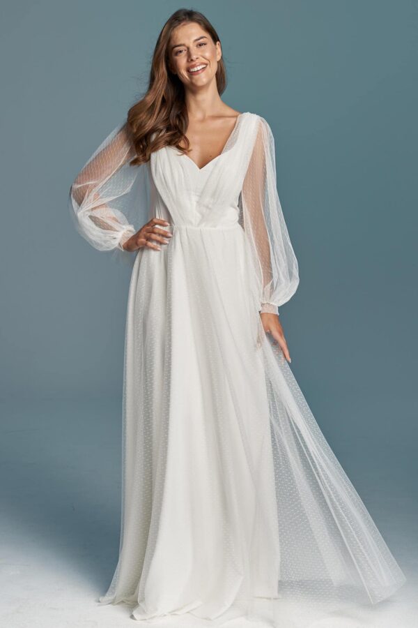 Gładka suknia ślubna z szyfonu, wykończona lekkim tiulem w kropeczki. Ma dekolt z bazą w kształcie serca i subtelnie wyprofilowaną warstwą tiulu oraz plecy w literę V z luźno opadającą szarfą. Spódnica w kształcie A składa się z trzech warstw: elastycznej podszewki, szyfonu i tiulu. Długie, półprzezroczyste rękawy dają swobodę ruchu i nie obciążają sylwetki. Model szyty na miarę – możesz zmienić dekolt, rękawy, objętość spódnicy czy usunąć pasek.