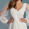 Prosta suknia ślubna z szyfonu nie musi być zachowawcza. W tym modelu forma została zaprojektowana tak, aby podkreślać kobiece kształty bez nadmiaru zdobień. Dekolt ma bazę w kształcie serca, którą przykrywa delikatny tiul w kropeczki, lekko modelujący linię w prostą. Efekt jest wyważony – jednocześnie subtelny i kobiecy.