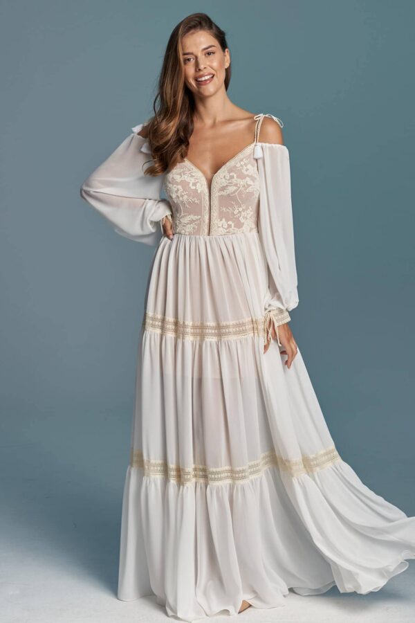 Piętrowa suknia ślubna z odkrytymi ramionami, łącząca bawełnianą koronkę i zwiewny szyfon. Góra z głębokim dekoltem i cienkimi ramiączkami stabilizuje fason i pozwala czuć się swobodnie. Spódnica w kształcie litery A zbudowana jest z trzech marszczonych warstw oddzielonych taśmami. Cielista, elastyczna podszewka dopasowuje się do ciała i nie ogranicza ruchów. Model szyty na miarę – możesz zmienić dekolt, rękawy, spódnicę i kolor podszewki.