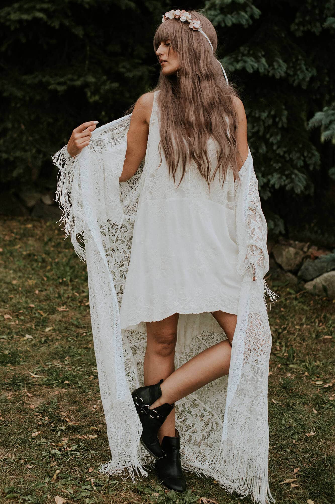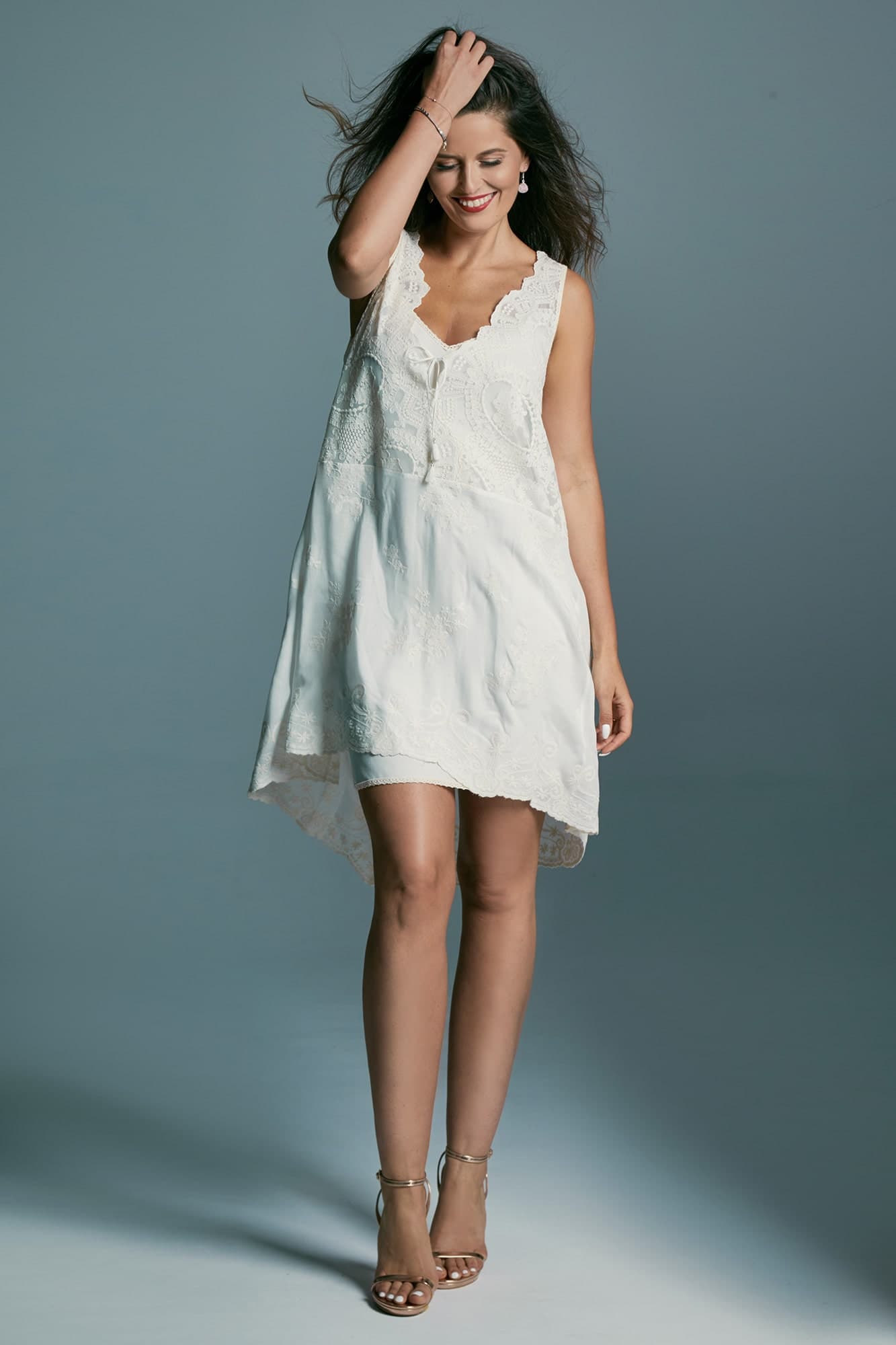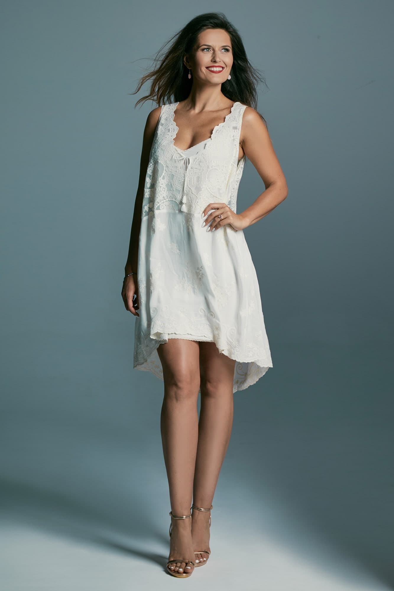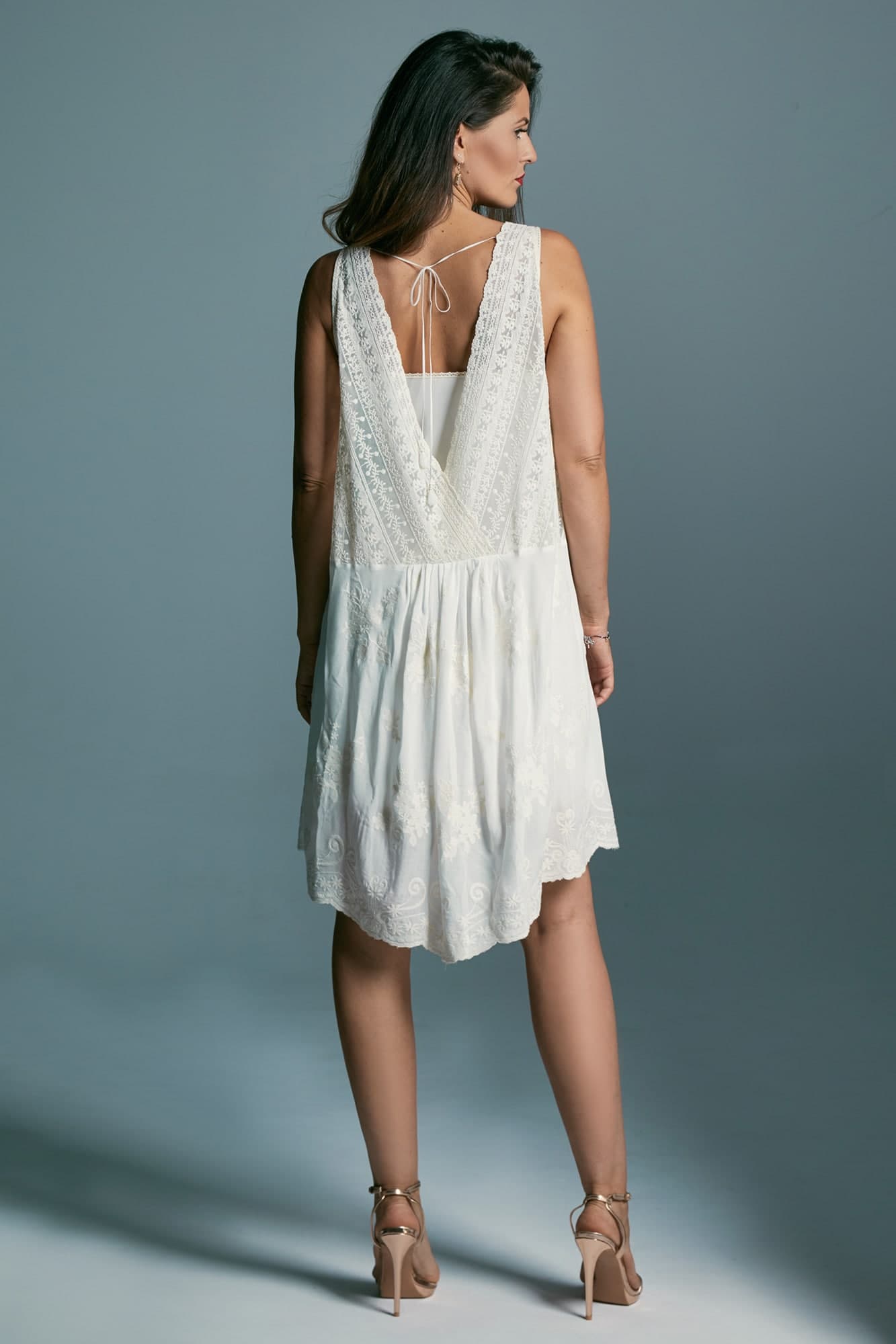 Krój oversize zapewnia swobodę i komfort po intensywnej, weselnej nocy. Sukienka zachwyca dopracowanymi detalami – głęboko wycięte plecy subtelnie przyciągają spojrzenia, a dekolt z delikatnym wiązaniem nadaje jej dziewczęcej lekkości. Doskonale wpisuje się w estetykę boho i sprawdzi się nie tylko podczas poprawin, lecz także przy innych wyjątkowych okazjach. Można ją nosić na kostium kąpielowy, zestawić z jeansami lub wyrazistą biżuterią, tworząc swobodne, indywidualne stylizacje. Minimalistyczna forma z delikatnymi zdobieniami pozwala czuć się pewnie i naturalnie w każdej sytuacji.