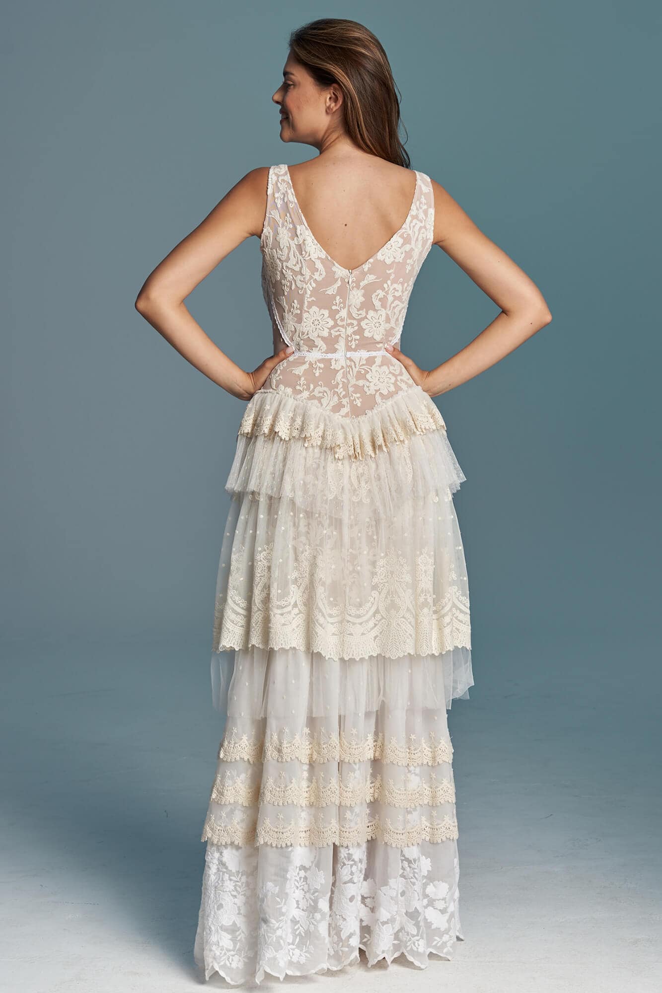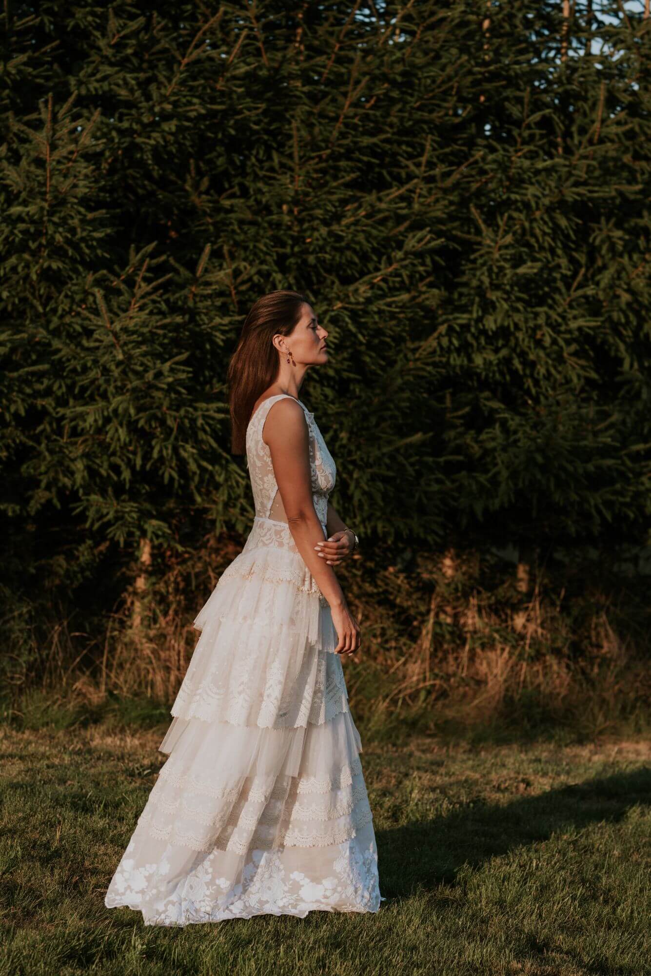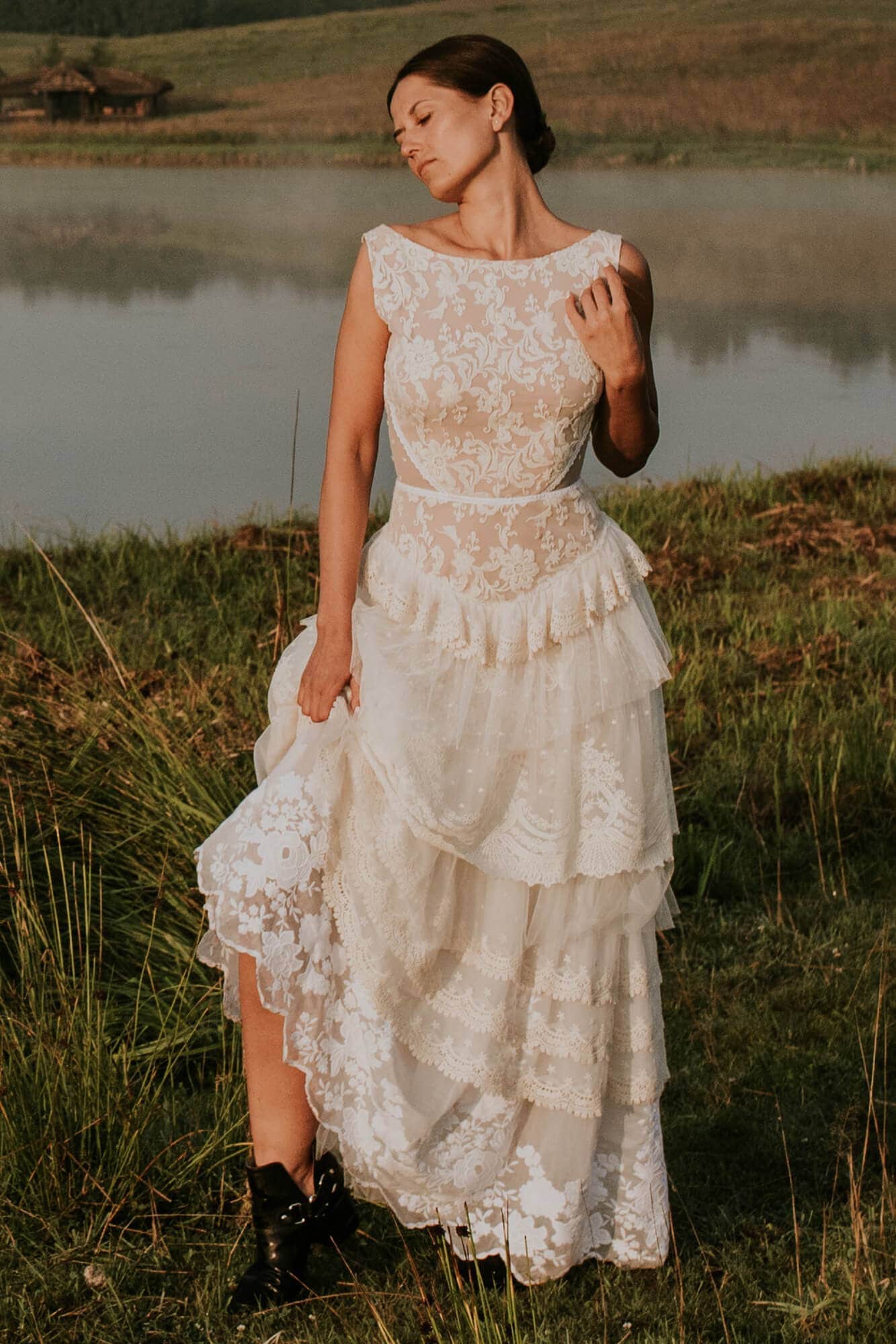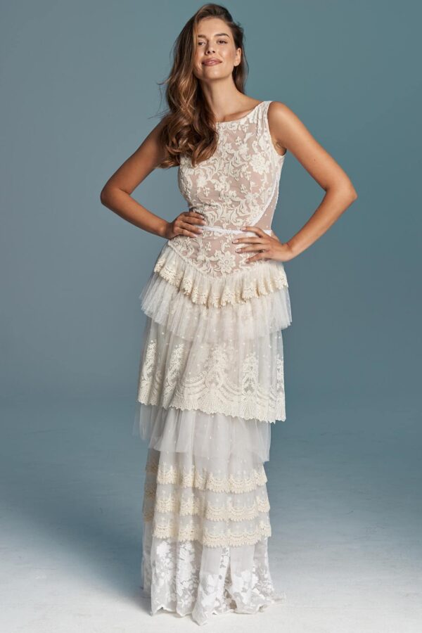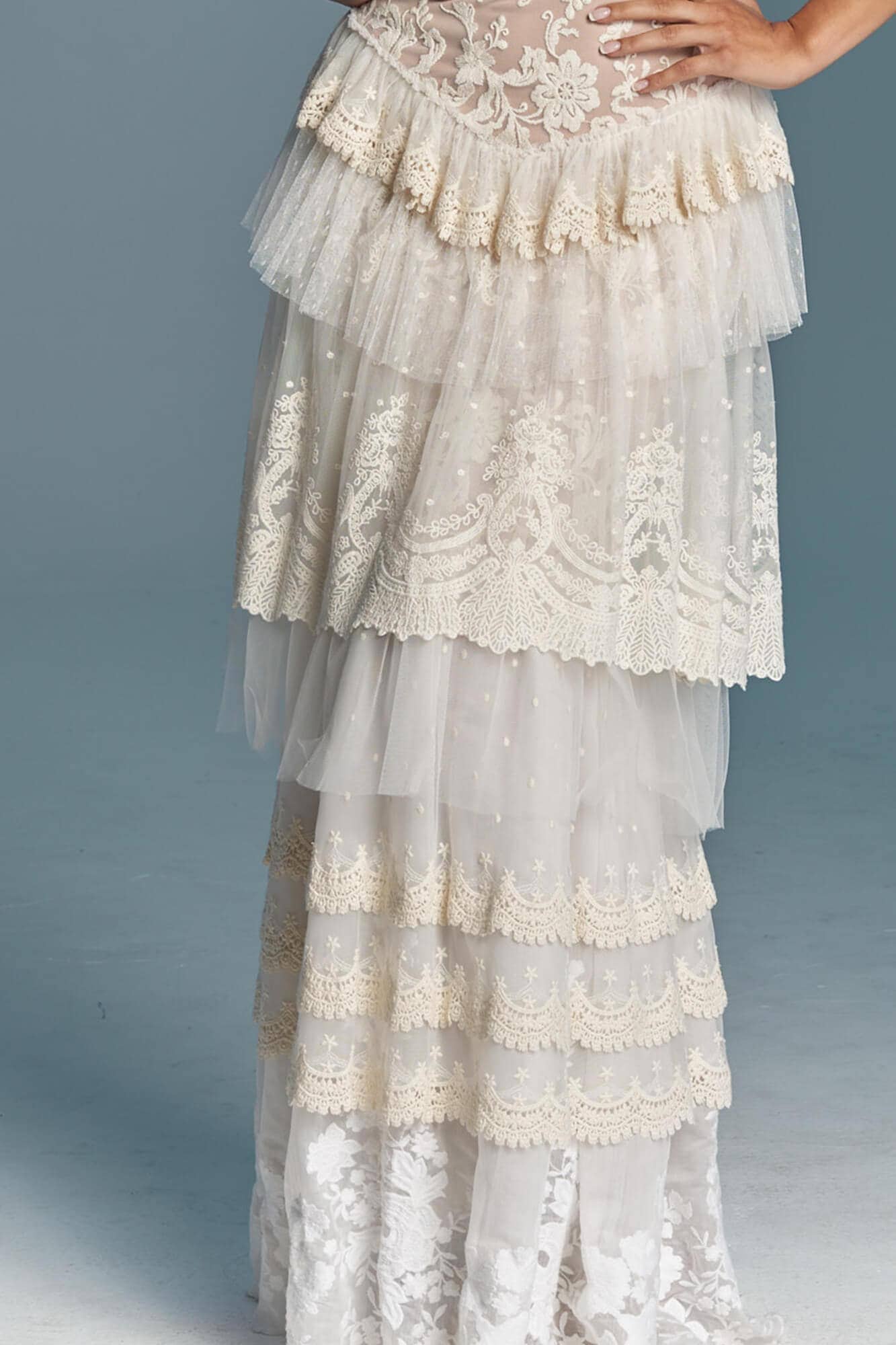 Warstwowa suknia ślubna w stylu boho uszyta z różnych hiszpańskich koronek w odcieniach bieli, beżu i écru. Ma zabudowaną górę z dekoltem w łódkę, co daje stabilność i pozwala na założenie biustonosza. Spódnica składa się z kilku pięter o zróżnicowanej fakturze, które modelują biodra i talię. Boczne wstawki z tiulu w kropeczki dodają lekkości sylwetce. Model szyty na miarę – możesz zmienić dekolty, rękawy, falbany i podszewkę.